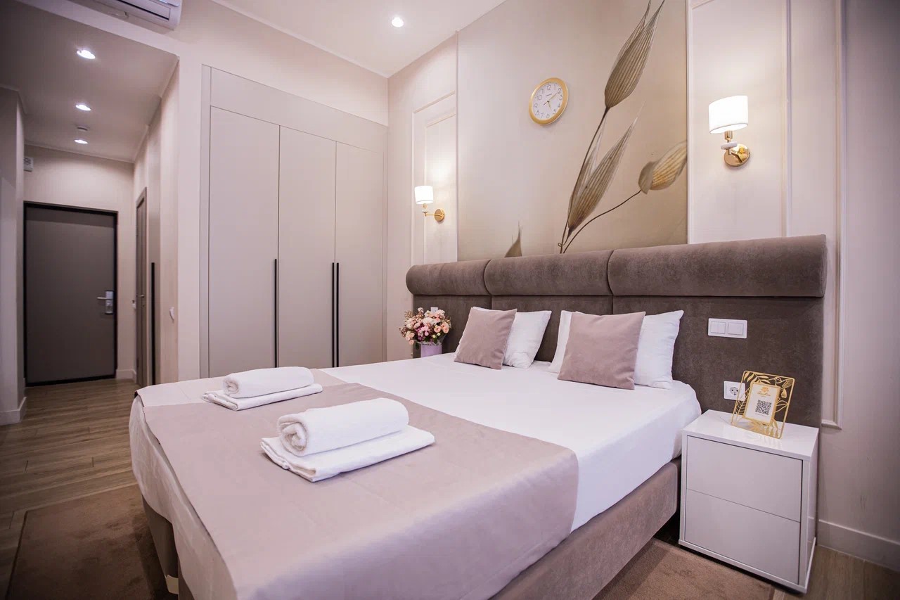В номере: кровать двуспальная, прикроватные тумбочки, стол, стулья, шкаф, кондиционер, мини-холодильник, набор посуды, плита индукционная, сейф, телевизор ЖК, чайная станция