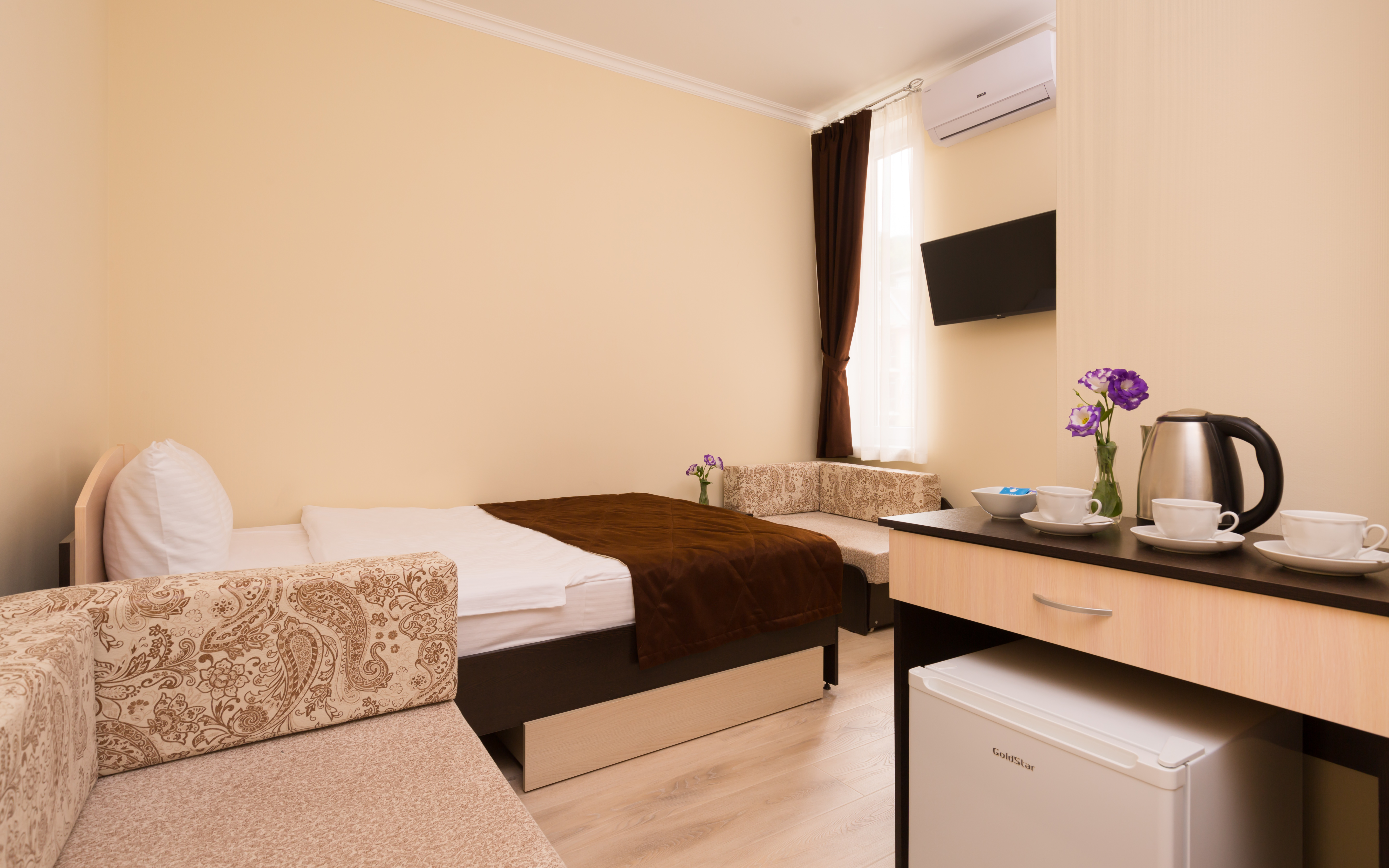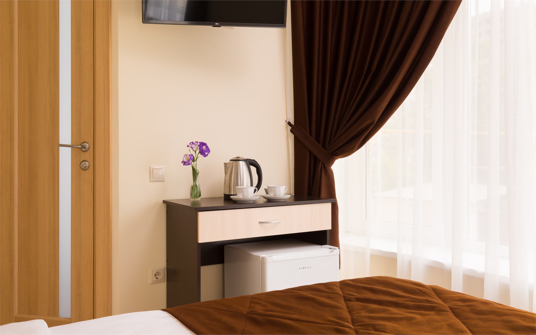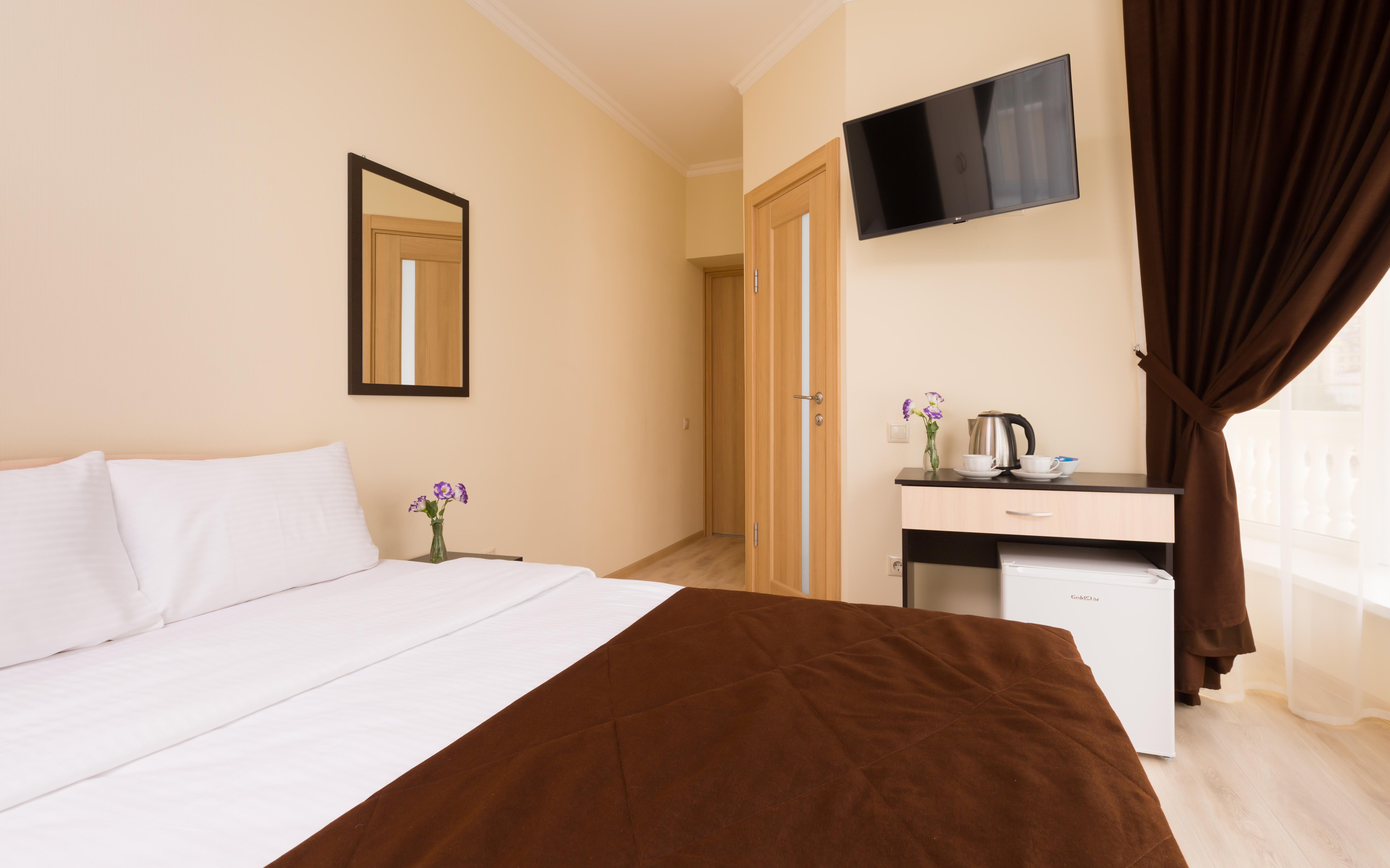 В номере: вешалка, диван раскладной, зеркало, кровать двуспальная, прикроватная тумбочка, стол, шкаф, кондиционер, мини-холодильник, телевизор ЖК, чайный набор посуды, электрочайник