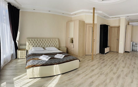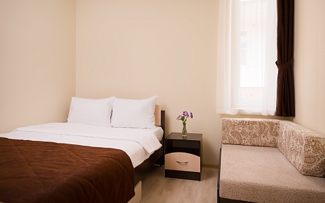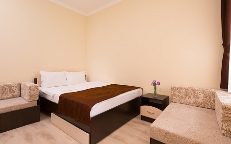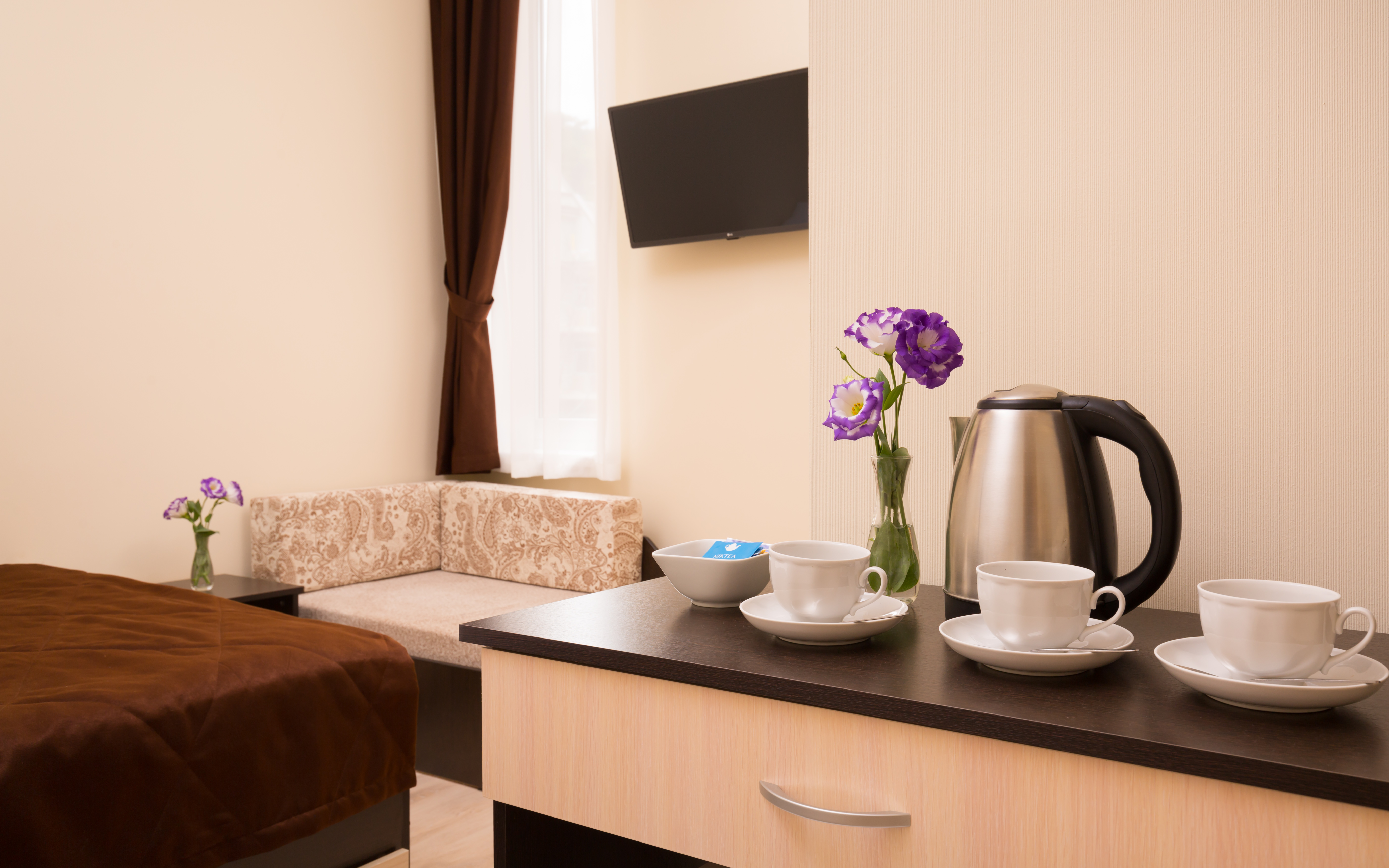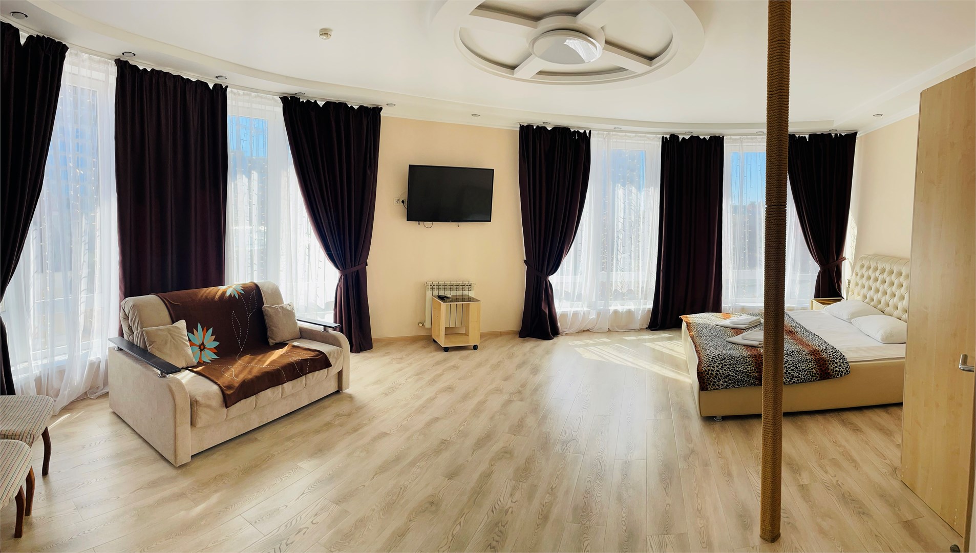 В номере: вешалка, диван раскладной, зеркало, кровать двуспальная, прикроватная тумбочка, стол, шкаф, кондиционер, мини-холодильник, телевизор ЖК, чайный набор посуды, электрочайник