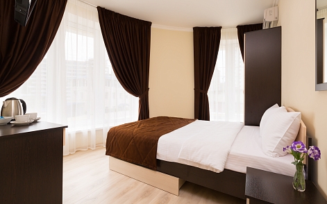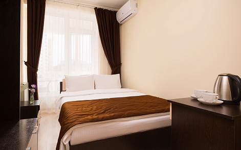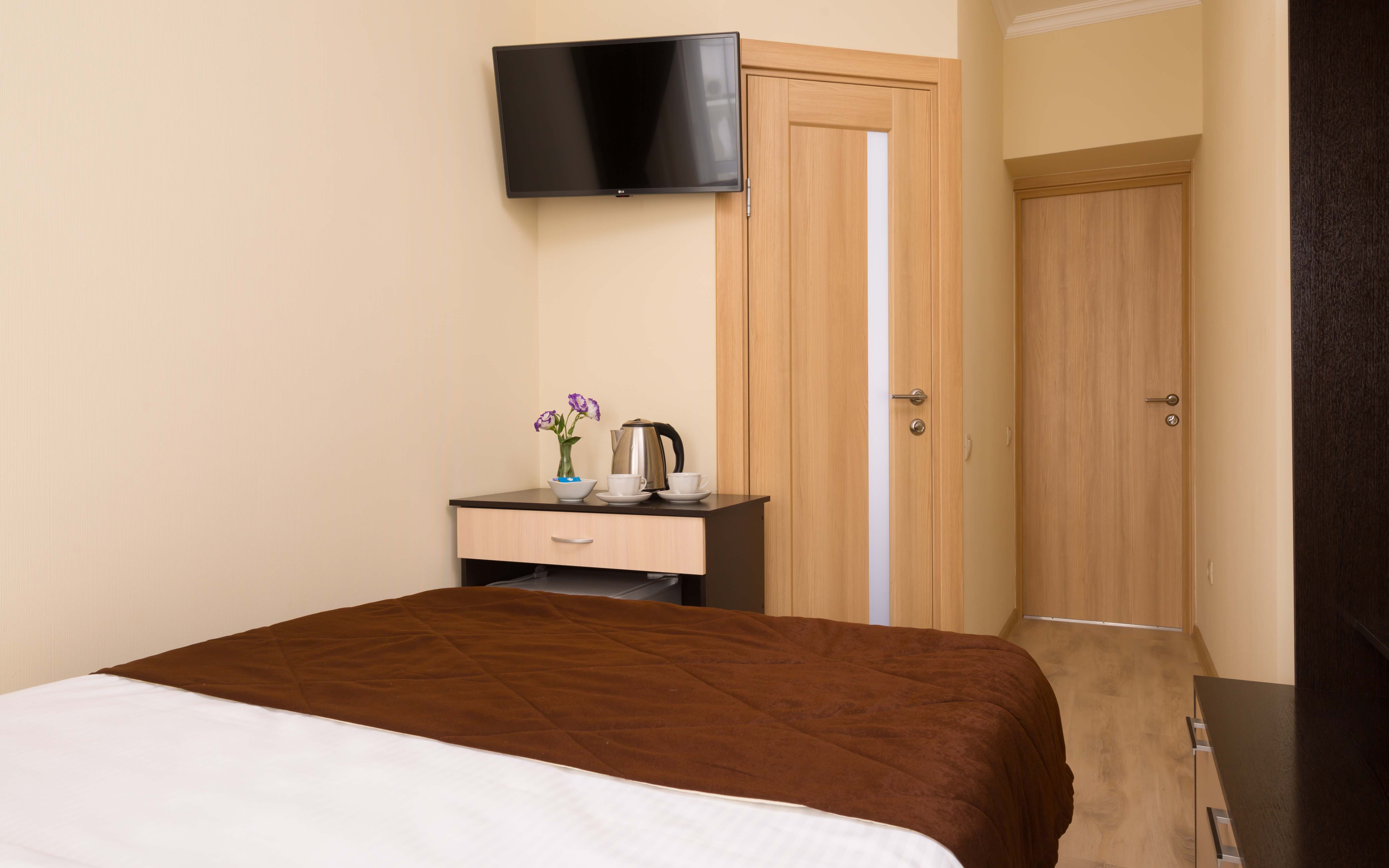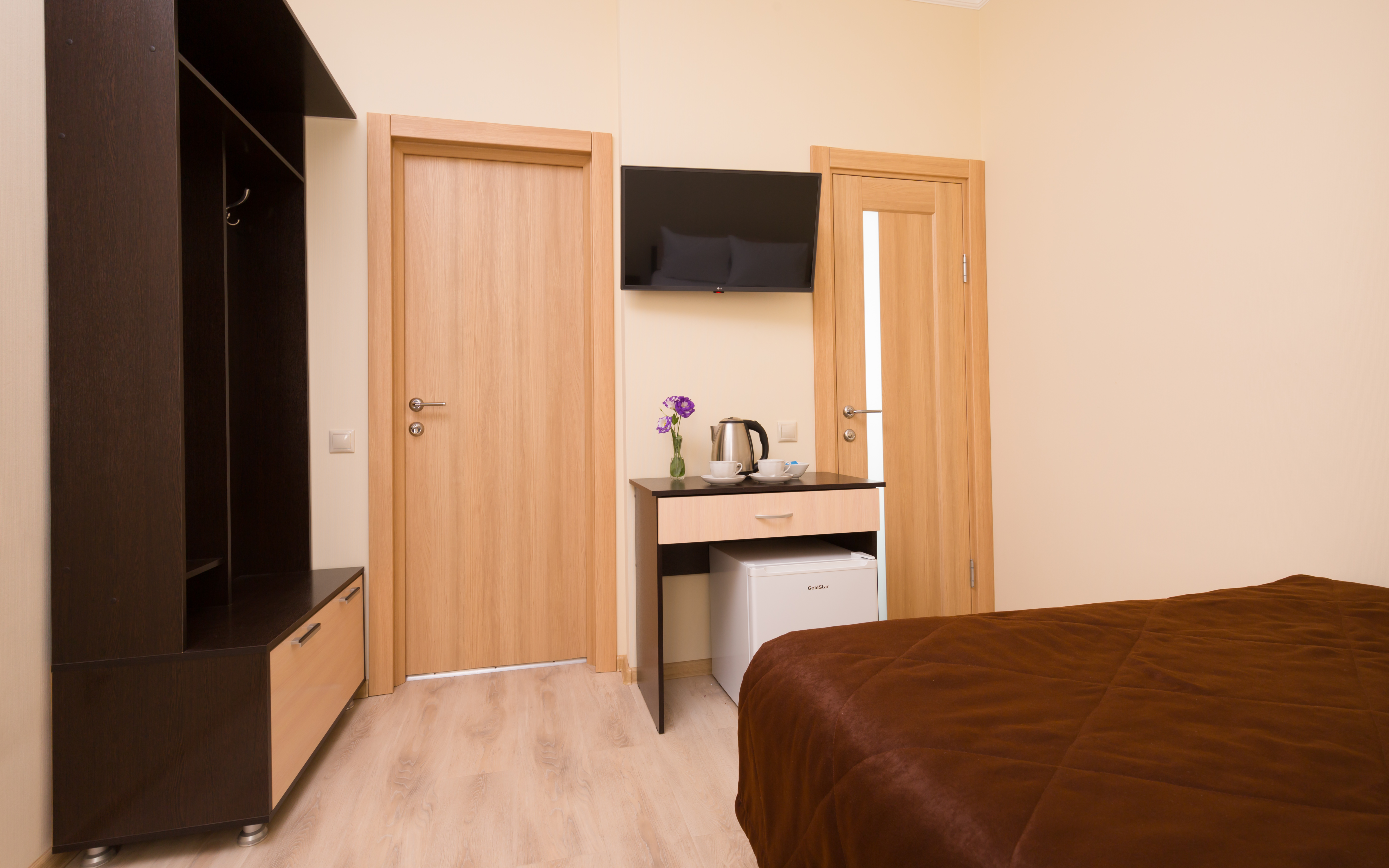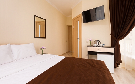 В номере: вешалка, зеркало, кровать двуспальная, стол, шкаф, кондиционер, мини-холодильник, телевизор ЖК, чайный набор посуды, электрочайник