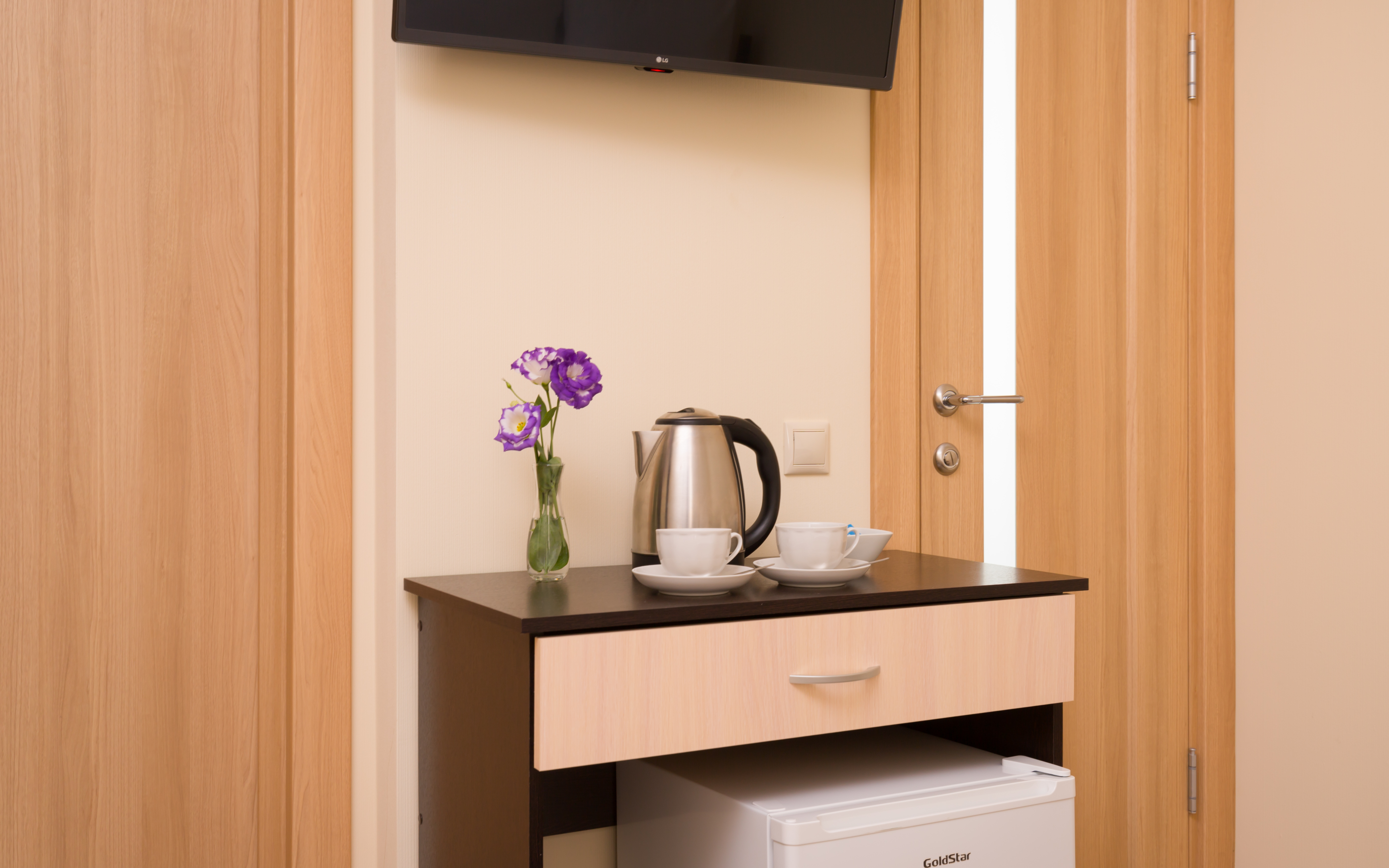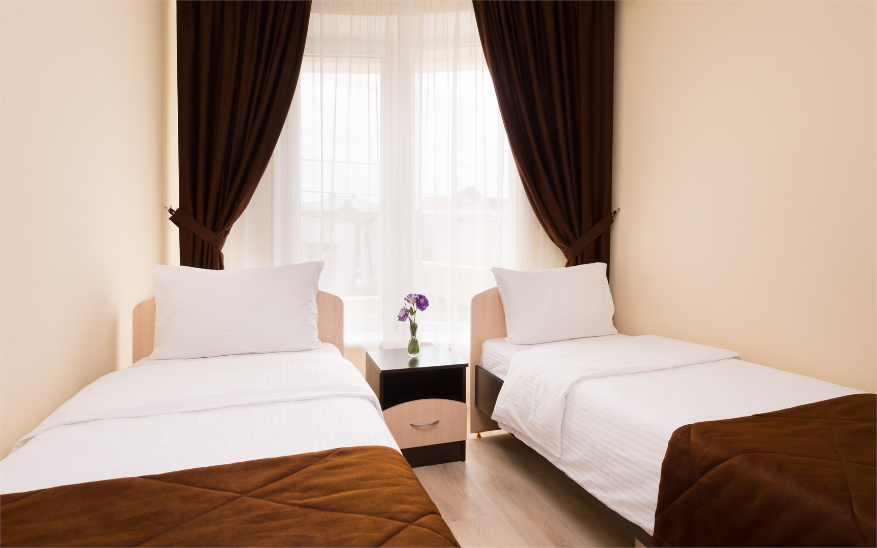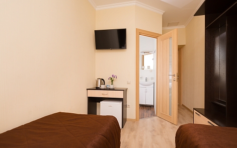 В номере: вешалка, зеркало, кровати односпальные, прикроватные тумбочки, стол, шкаф, кондиционер, мини-холодильник, телевизор ЖК, чайный набор посуды, электрочайник