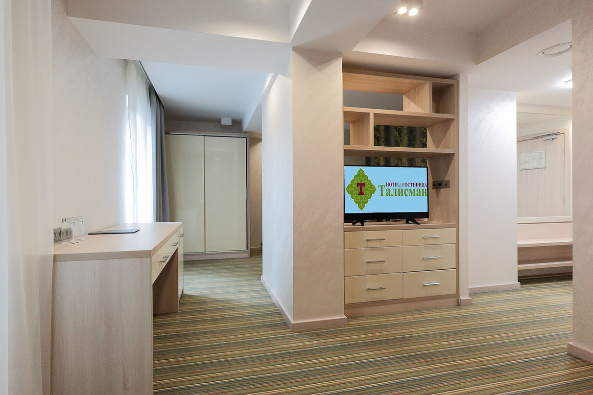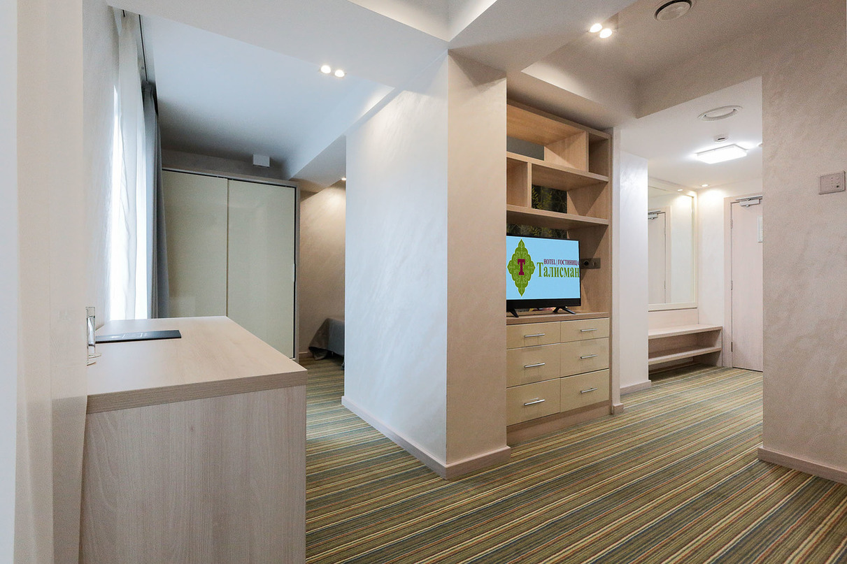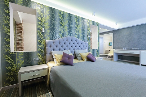 В номере: вешалка, диван, зеркало, кровать двуспальная, прикроватные тумбочки, стол, стул, шкаф встроенный, мини-холодильник, сейф, сплит-система, телевизор ЖК