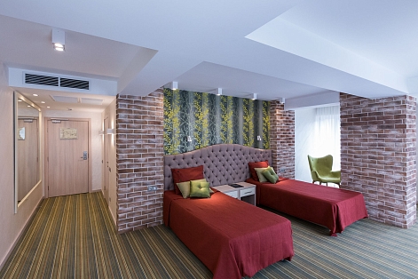 В номере: вешалка, диван раскладной, зеркало, кровати односпальные, прикроватные тумбочки, стол, стул, шкаф встроенный, мини-холодильник, сейф, сплит-система, телевизор ЖК