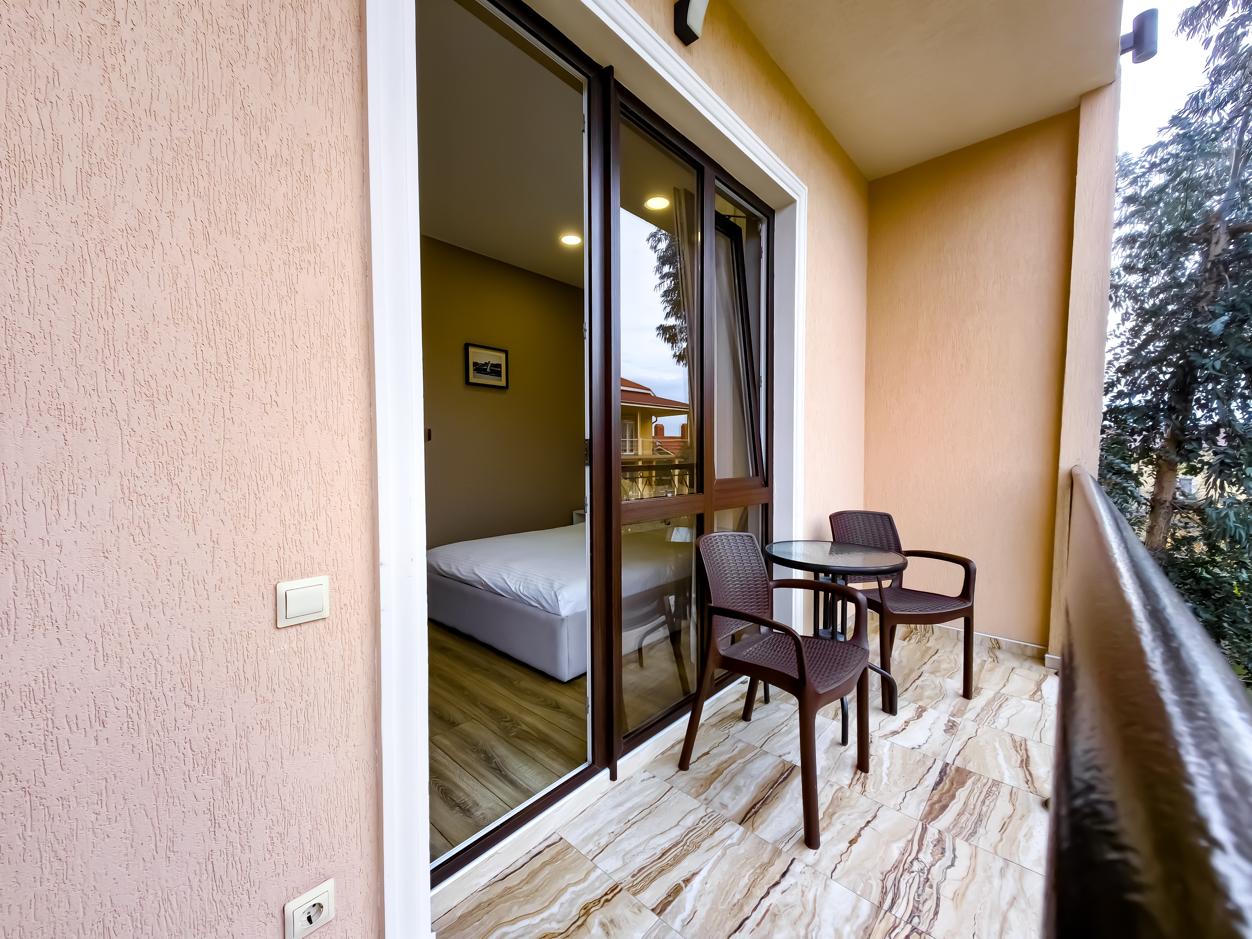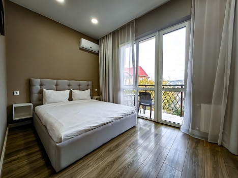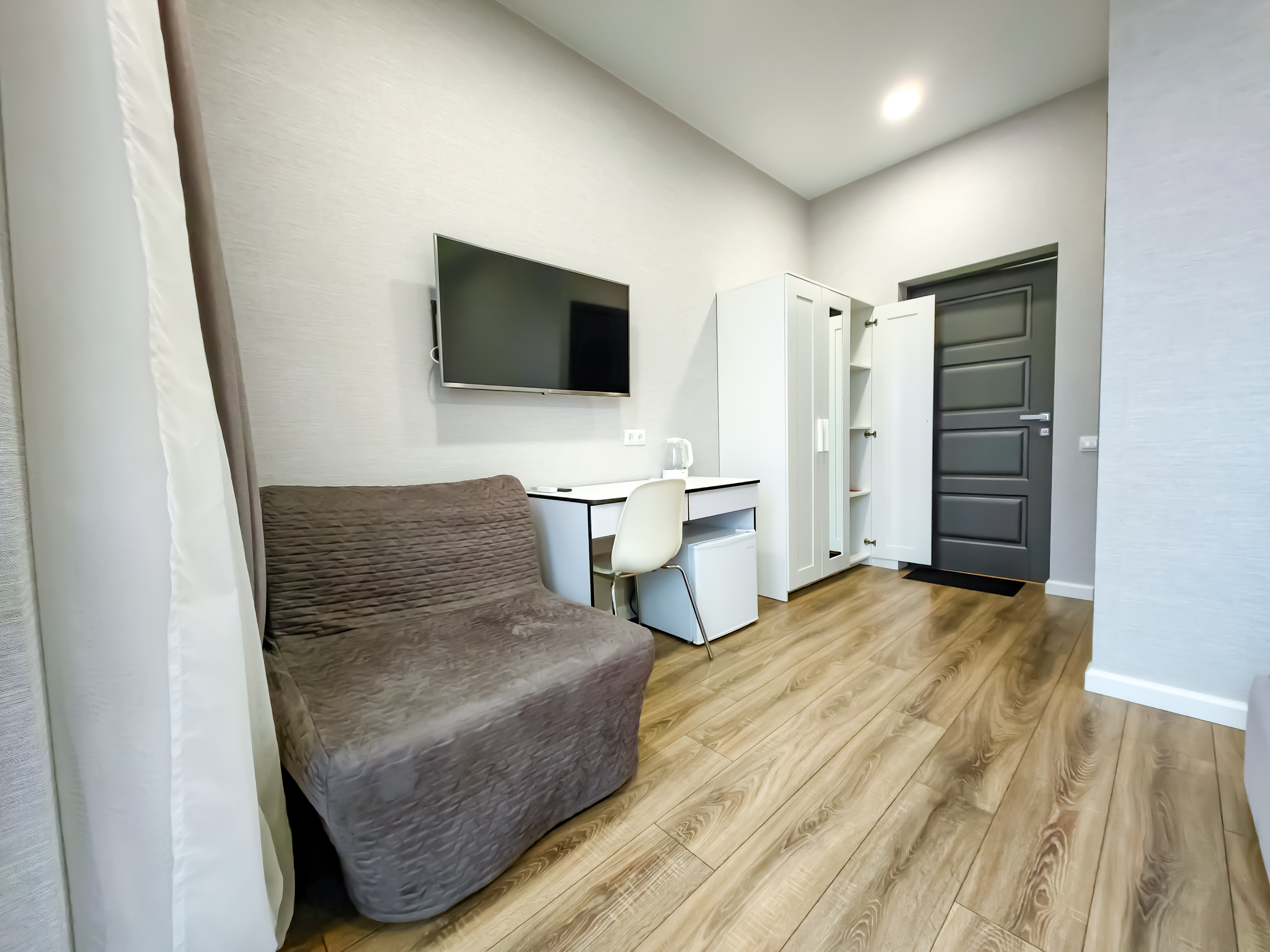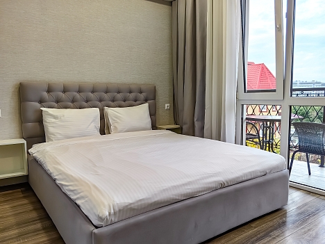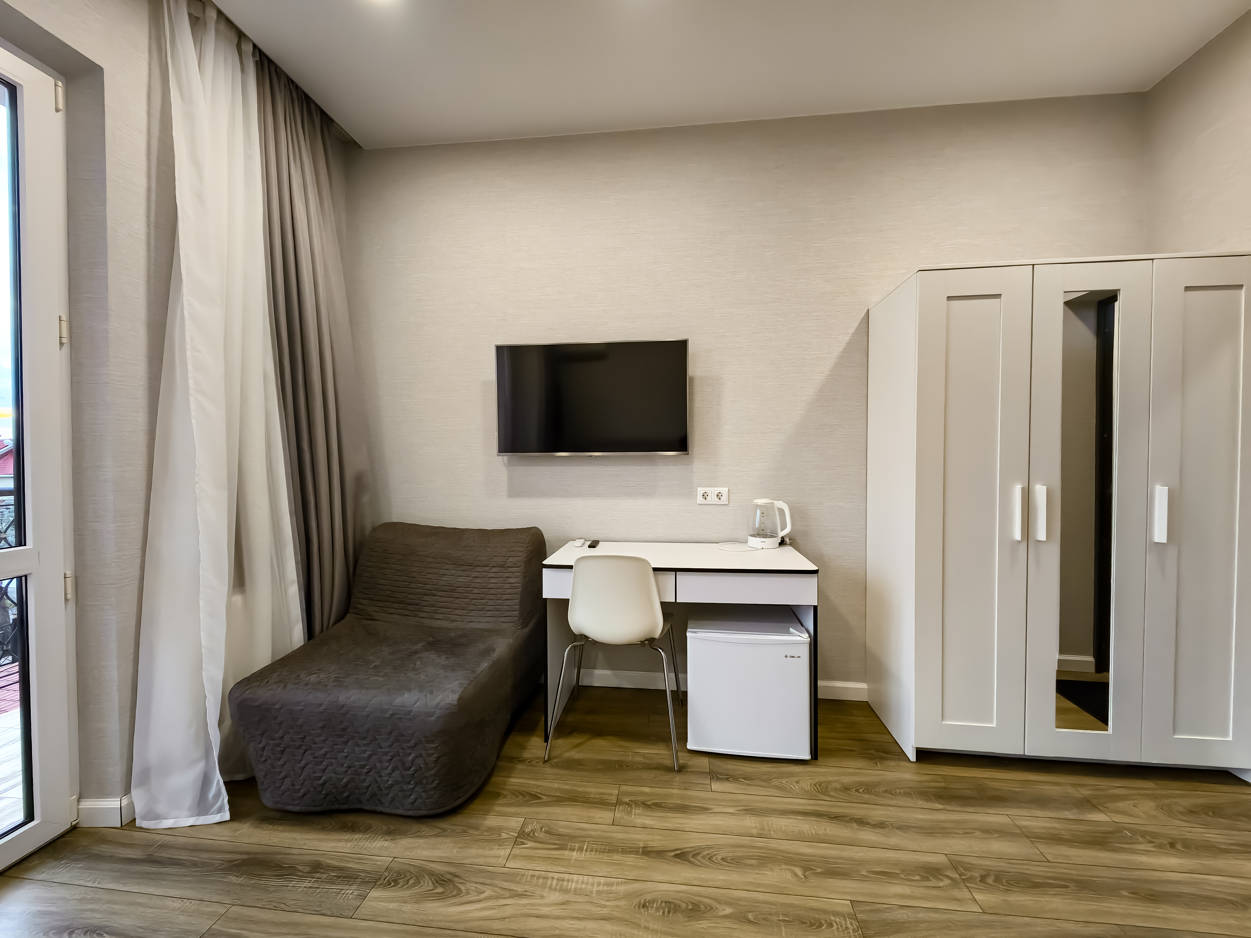 В номере: зеркало, кресло-кровать, кровать двуспальная, прикроватные тумбочки, стол, стулья, шкаф, кондиционер, мини-холодильник, телевизор ЖК, чайный набор посуды, электрочайник