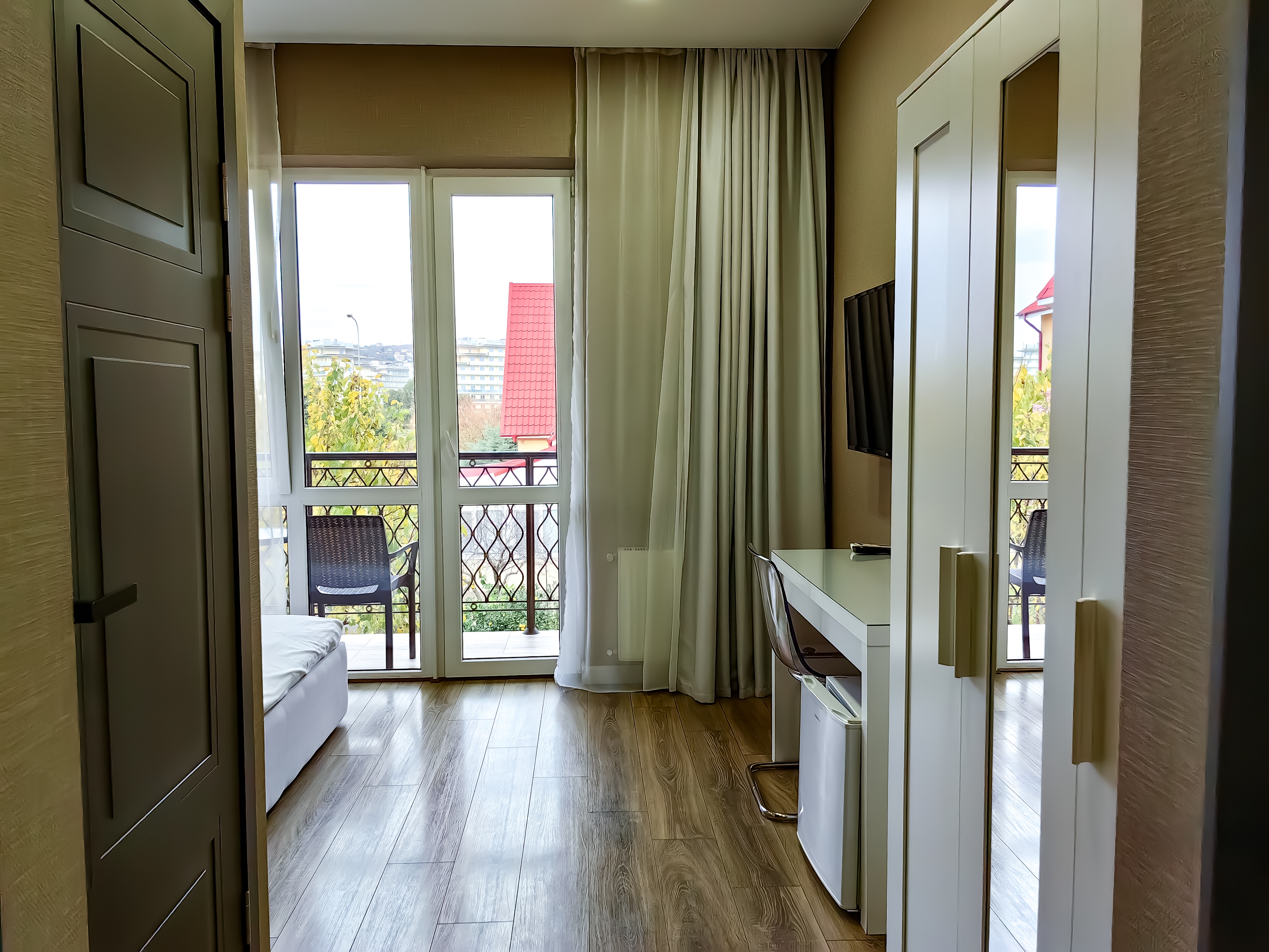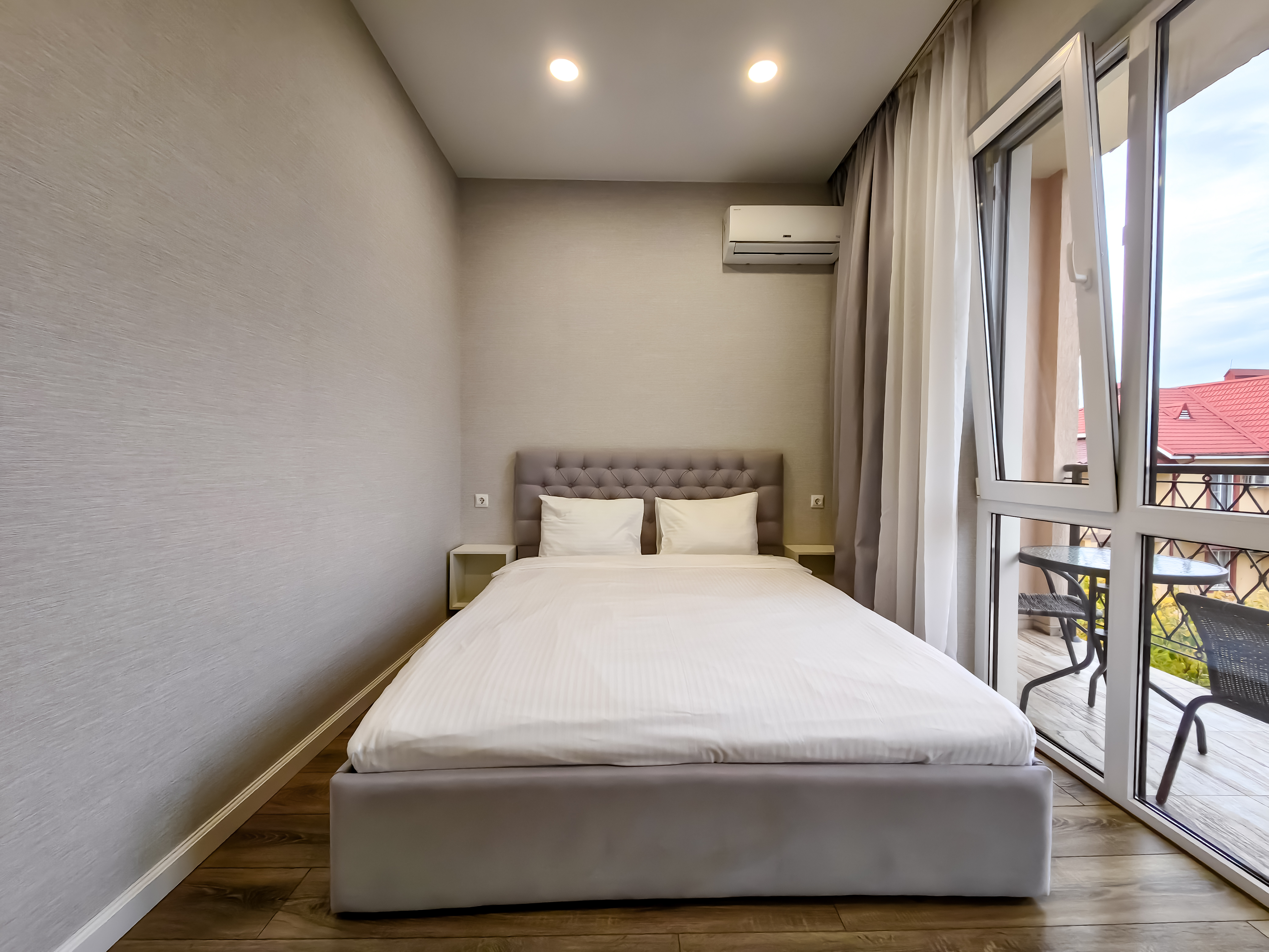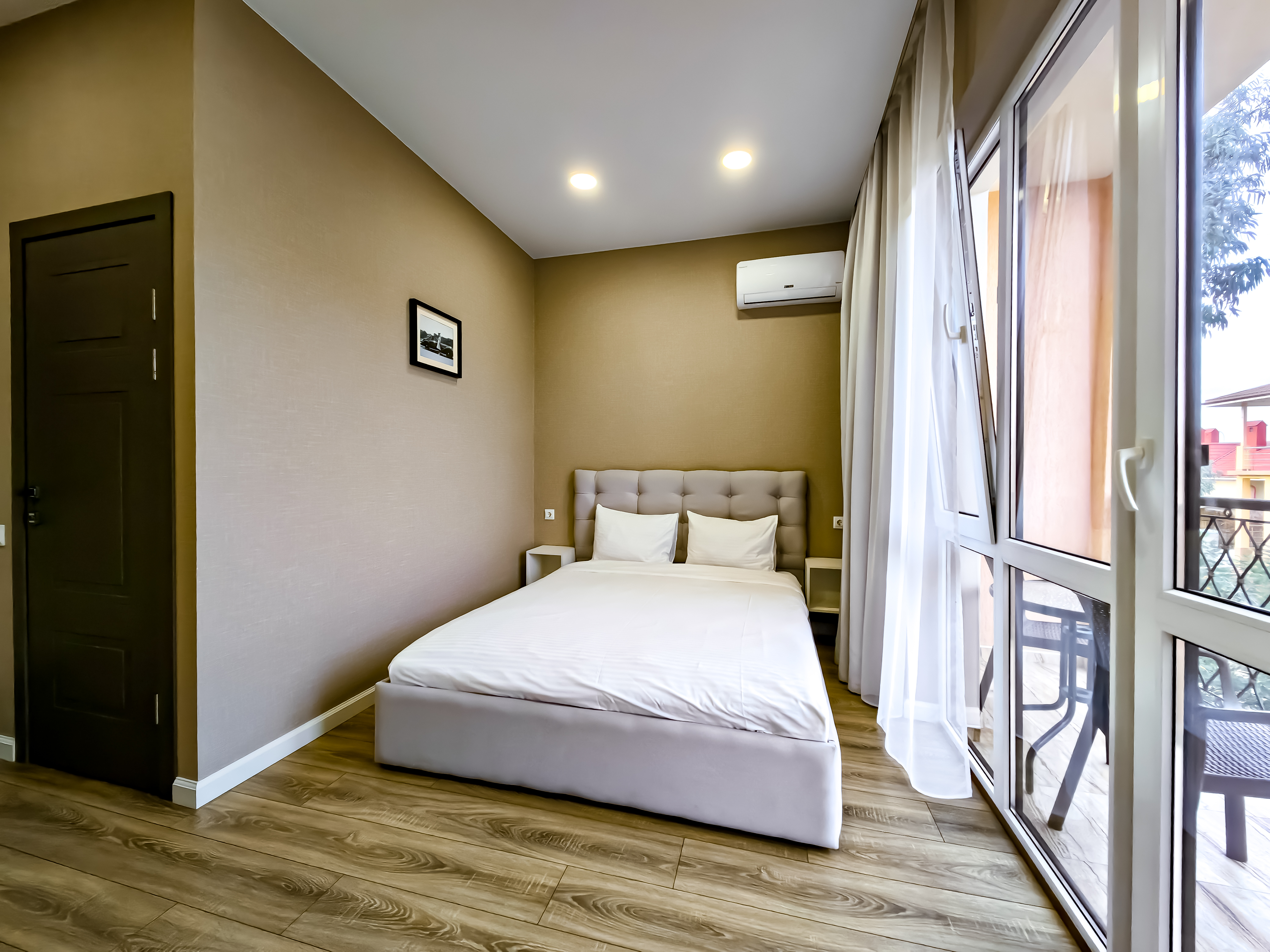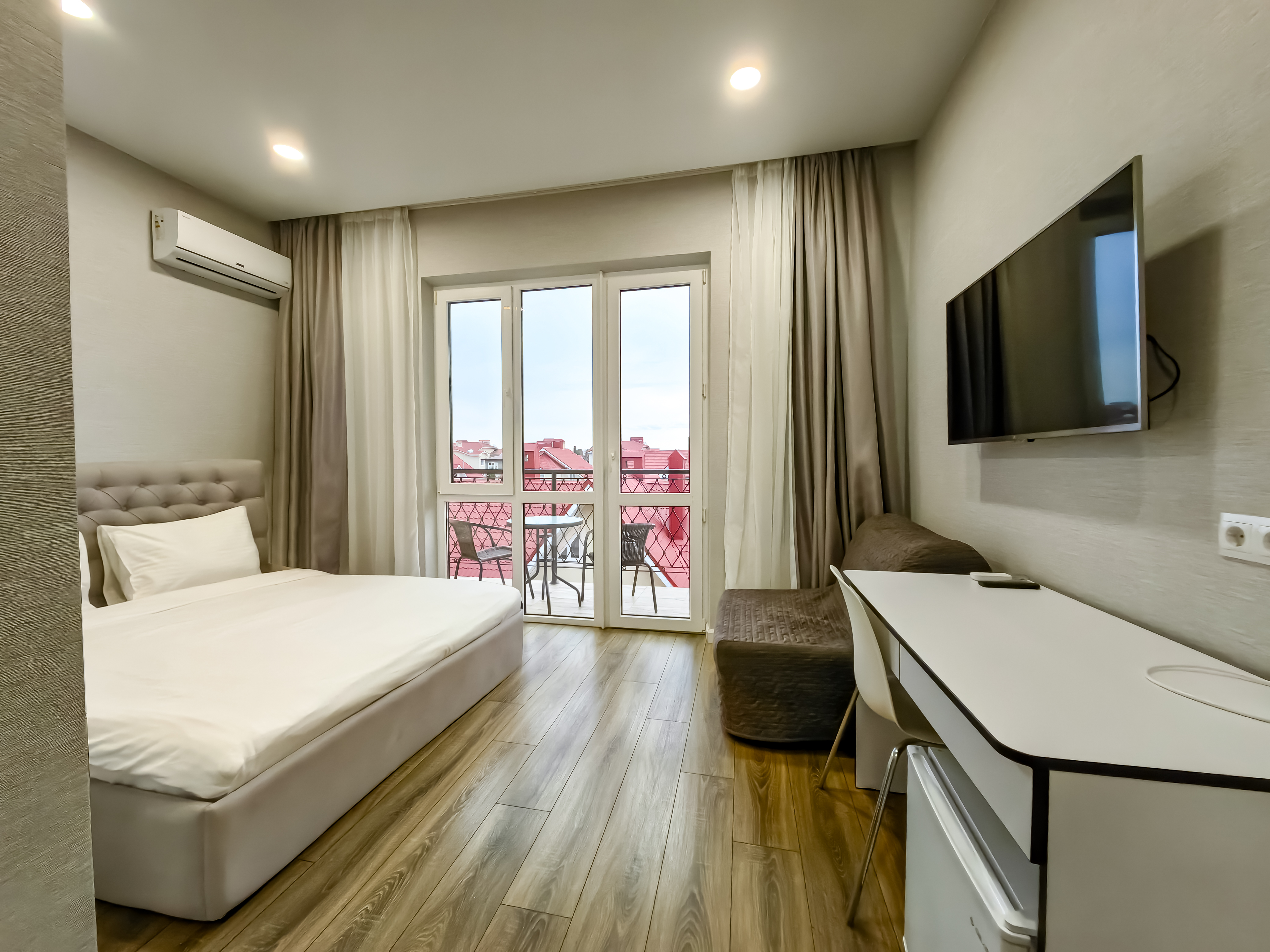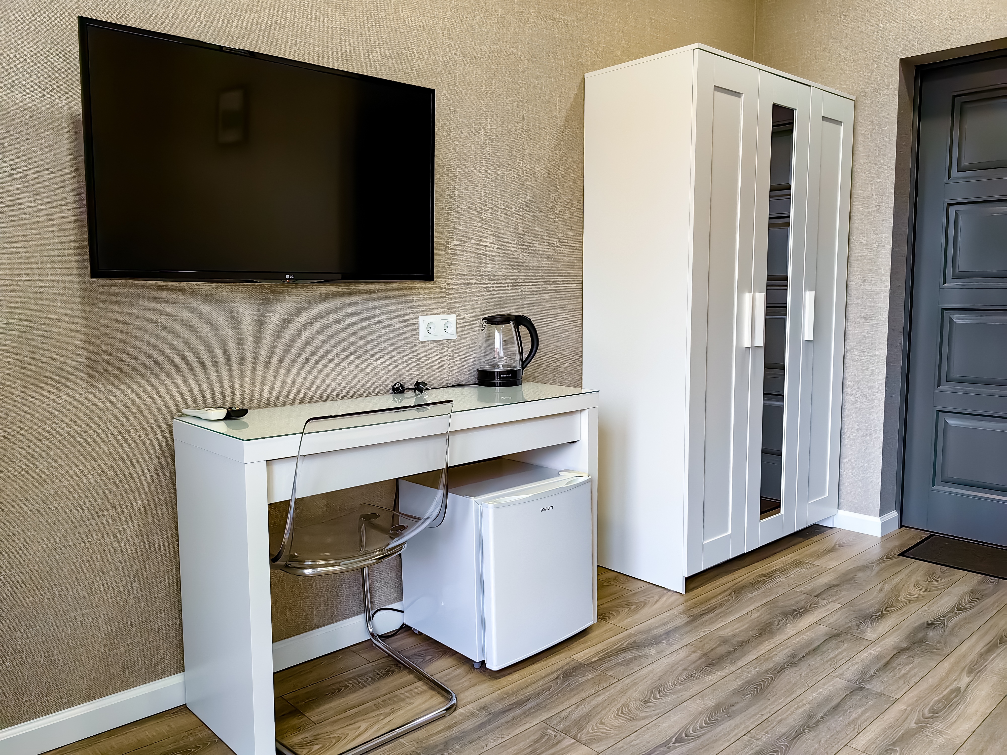 В номере: зеркало, кровать двуспальная, прикроватные тумбочки, стол, стулья, шкаф, кондиционер, мини-холодильник, телевизор ЖК, чайный набор посуды, электрочайник