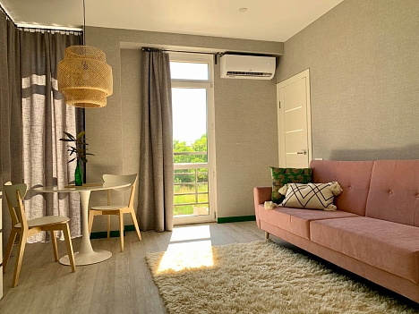 В шаговой доступности Олимпийский Парк, Морской порт, кафе, бары, рестораны и клубы, гипермаркет Магнит, магазины Пятерочка и Fix Price, столовые «Южная» и «Кормилица». До теннисных кортов - 1 км, центрального рынка – 1 км, до парка аттракционов «Сочи-Парк» - 2 км. Удобная транспортная доступность позволяет добраться до основных курортов, развлечений и вокзалов. До курорта Красная Поляна - 40 км, до границы с Абхазией 10 км, Аэропорт Сочи – 7 км, Ж/Д вокзал 4,8 км.В апартаментах есть все необходимое для комфортного проживания. Спальные места представлены двуспальной кроватью и раскладным диваном. Оборудована мини-кухня, на которой предусмотрены плита для приготовления пищи, микроволновая печь, посудомоечная машина, электрочайник, набор посуды. Также есть телевизор, кондиционер, утюг, гладильная доска, сушилка для вещей и собственный санузел с душевой кабиной, феном, стиральной машиной. До ближайшего галечного оборудованного пляжа около 7 мин пешком.