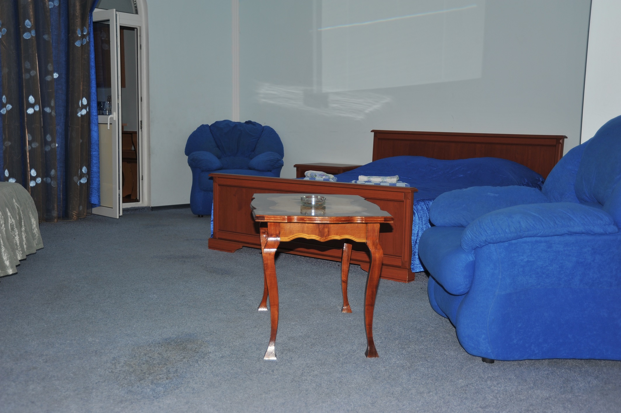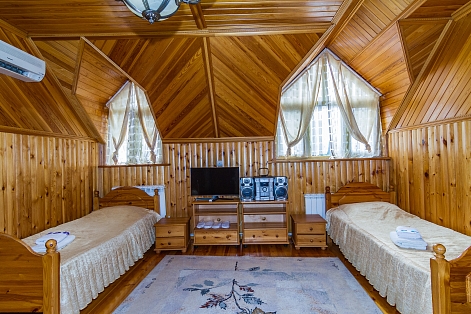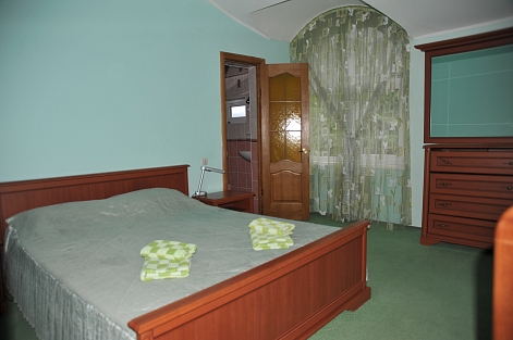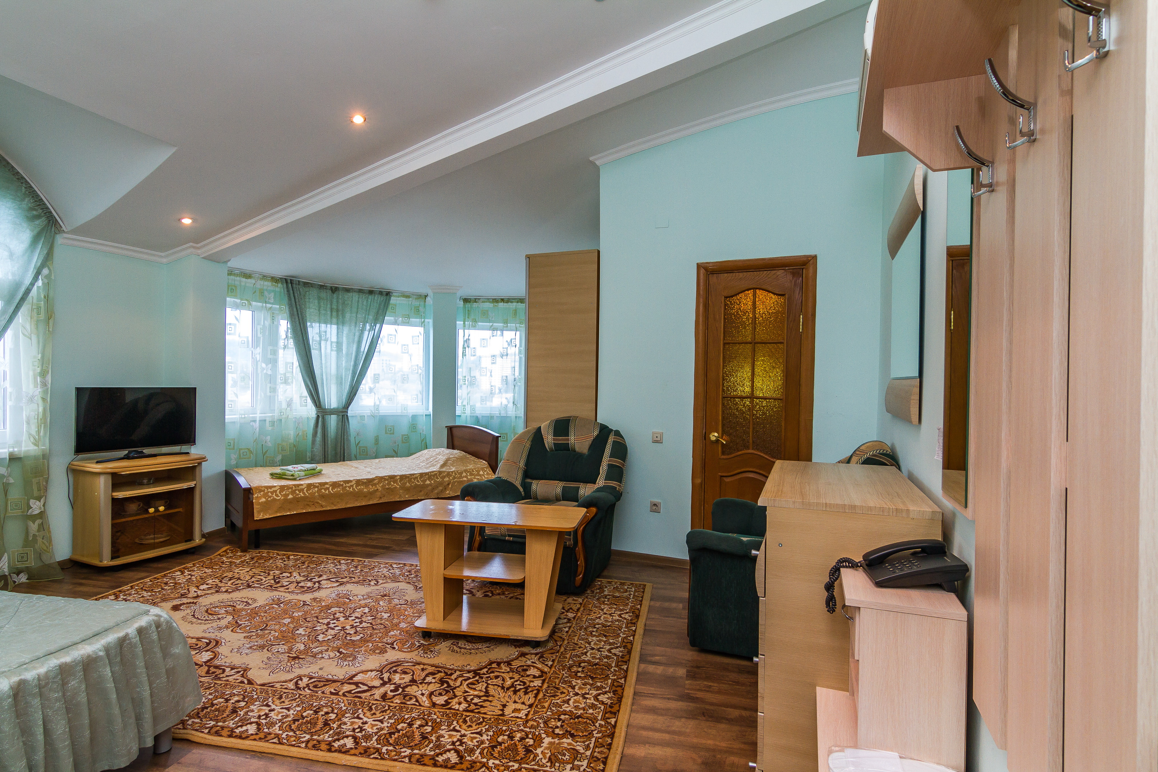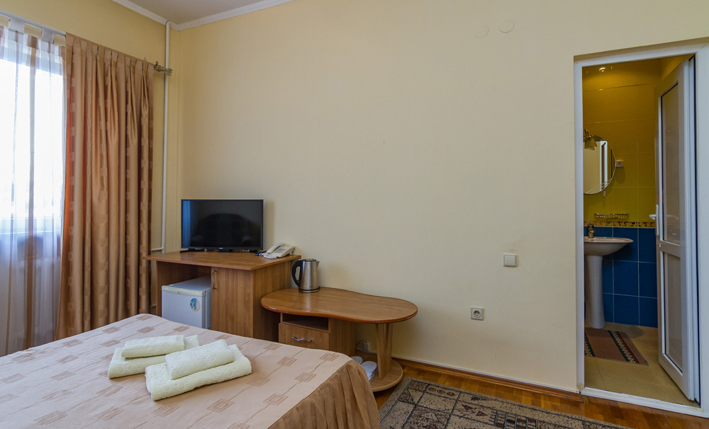В номере: вешалка, зеркало, комод, кровать двуспальная, кровать односпальная, набор мягкой мебели, обувная полка, прикроватные тумбочки, стол, столик журнальный, стулья, шкаф, кондиционер, телевизор, холодильник