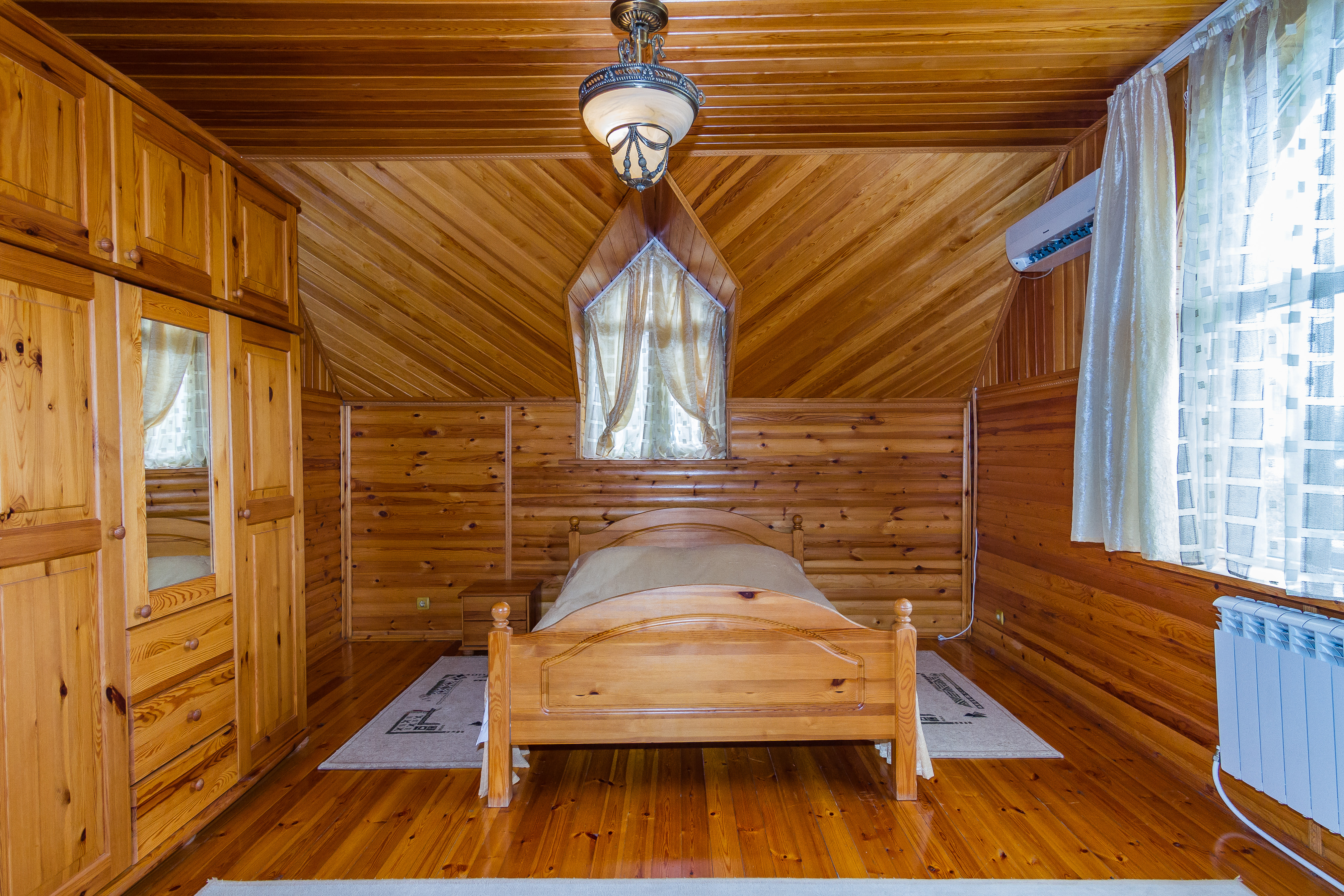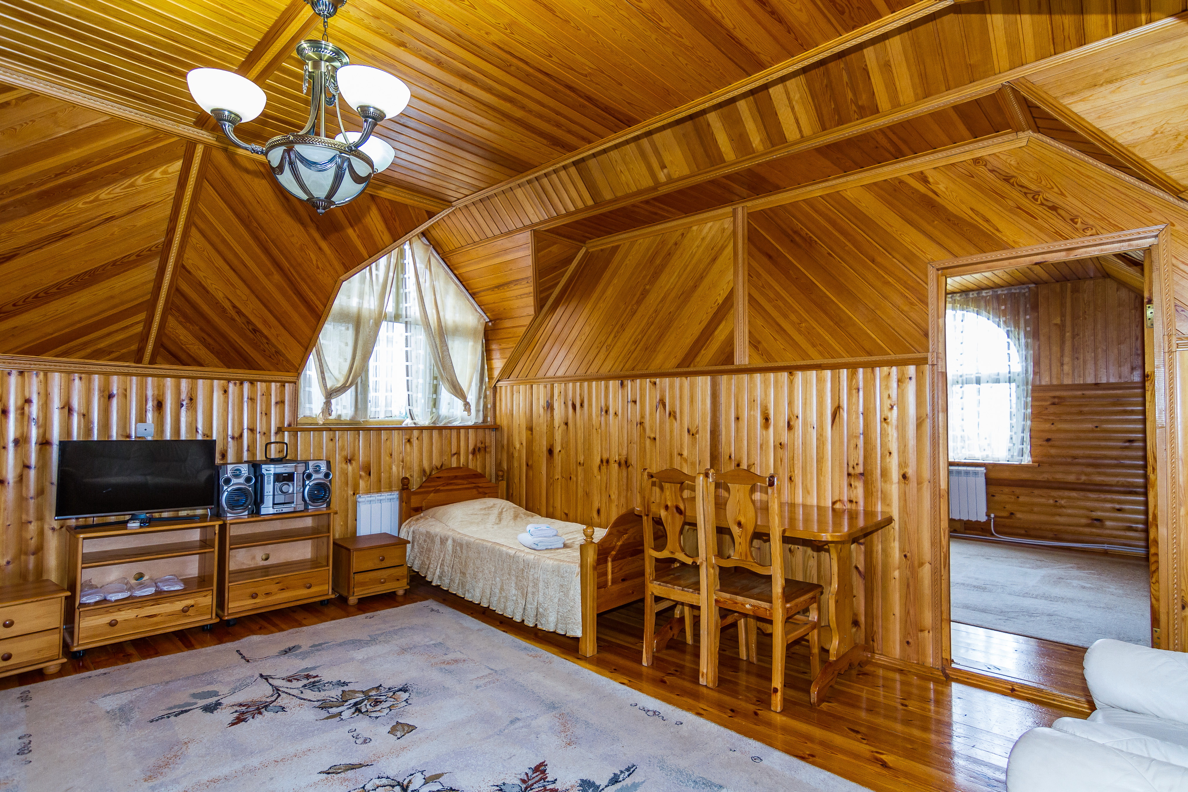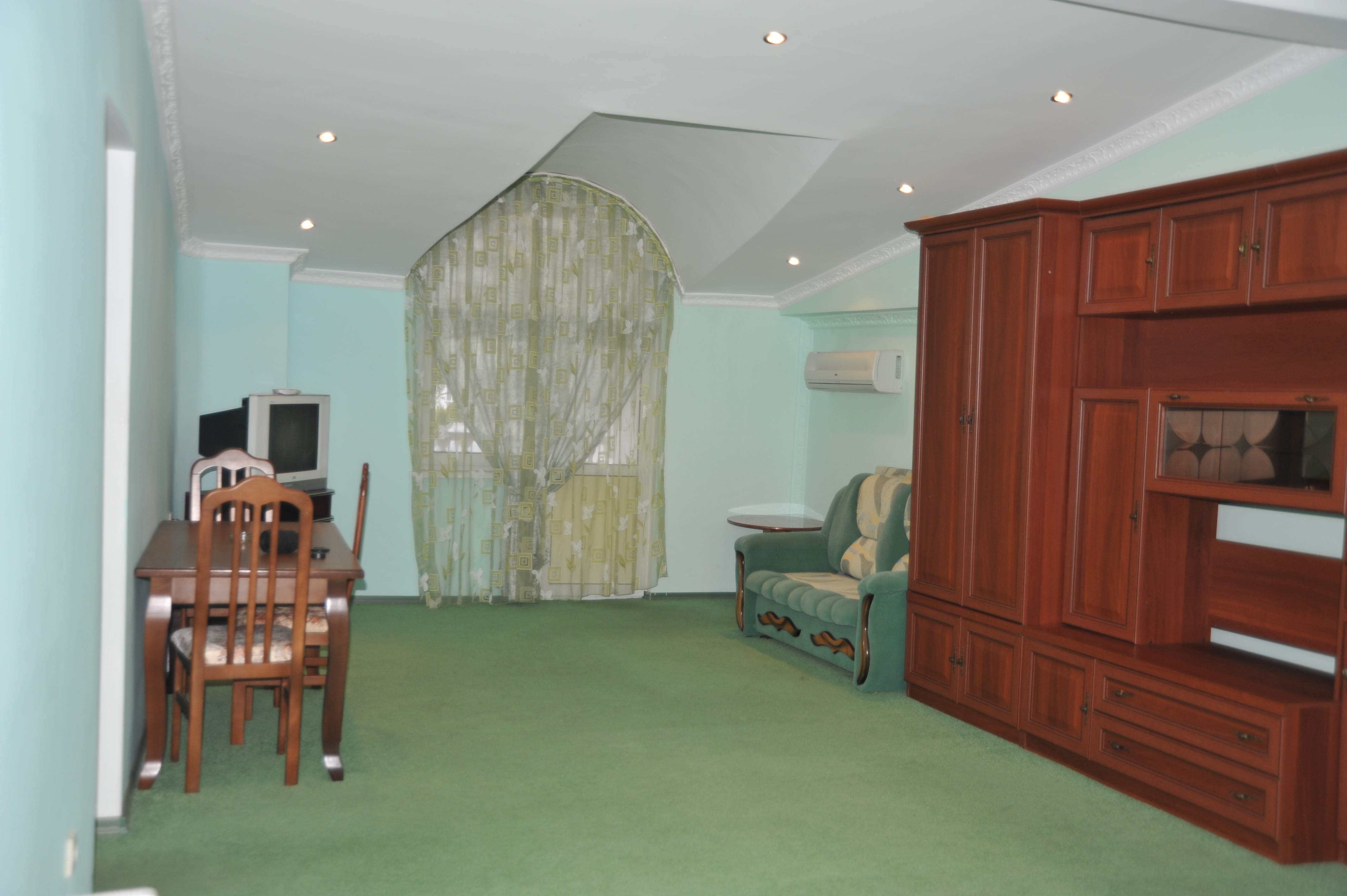 В номере: вешалка, зеркало, комод, кровать двуспальная, кровать односпальная, набор мягкой мебели, обувная полка, прикроватные тумбочки, стол, столик журнальный, стулья, шкаф, кондиционер, телевизор, холодильник