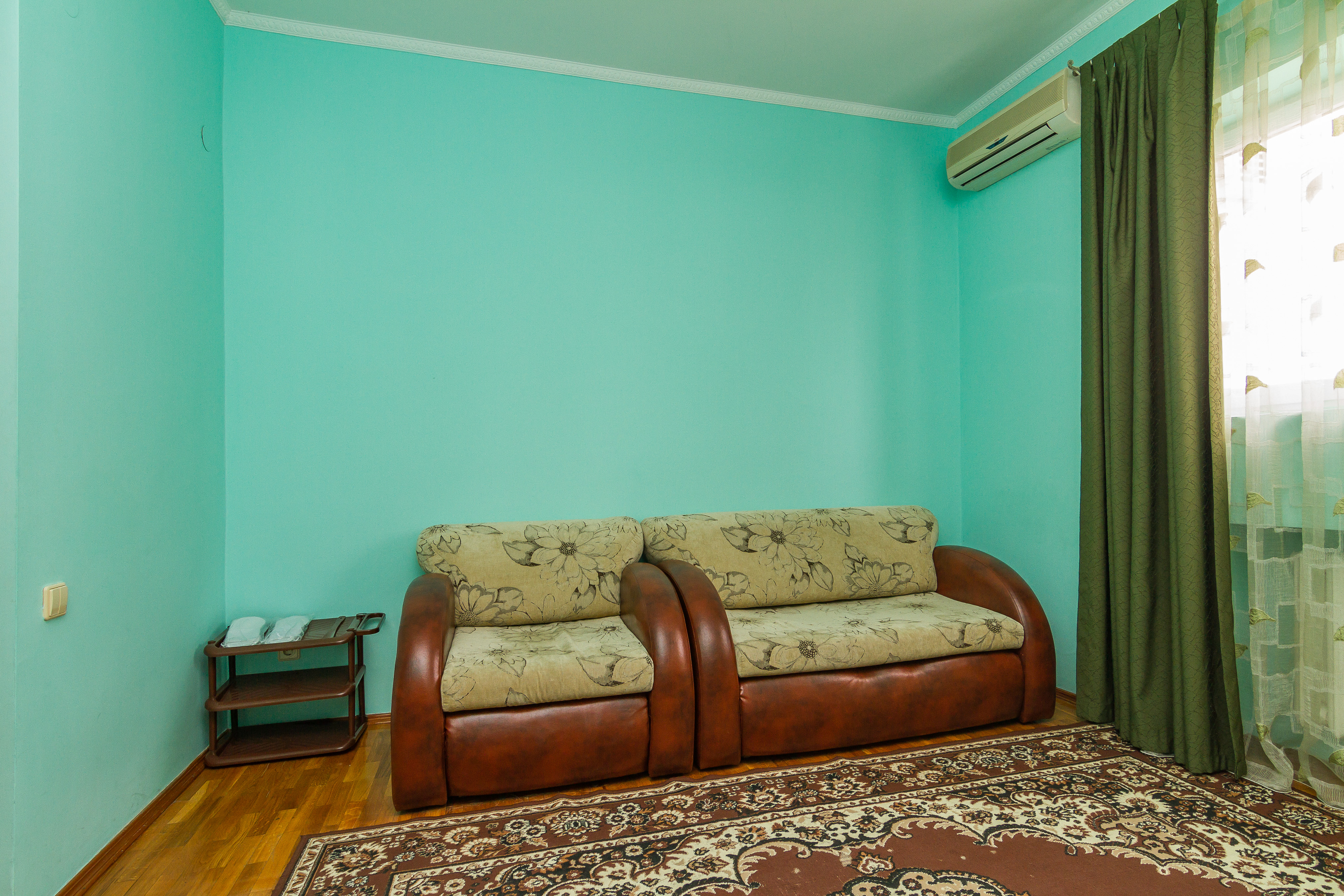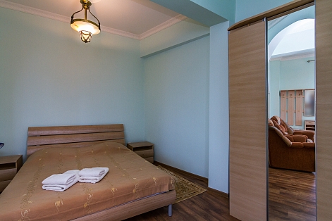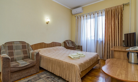 В номере: зеркало, кресла, кровать двуспальная, мягкий уголок, прикроватные тумбочки, столик журнальный, шкаф, кондиционер, мини-холодильник, телевизор
