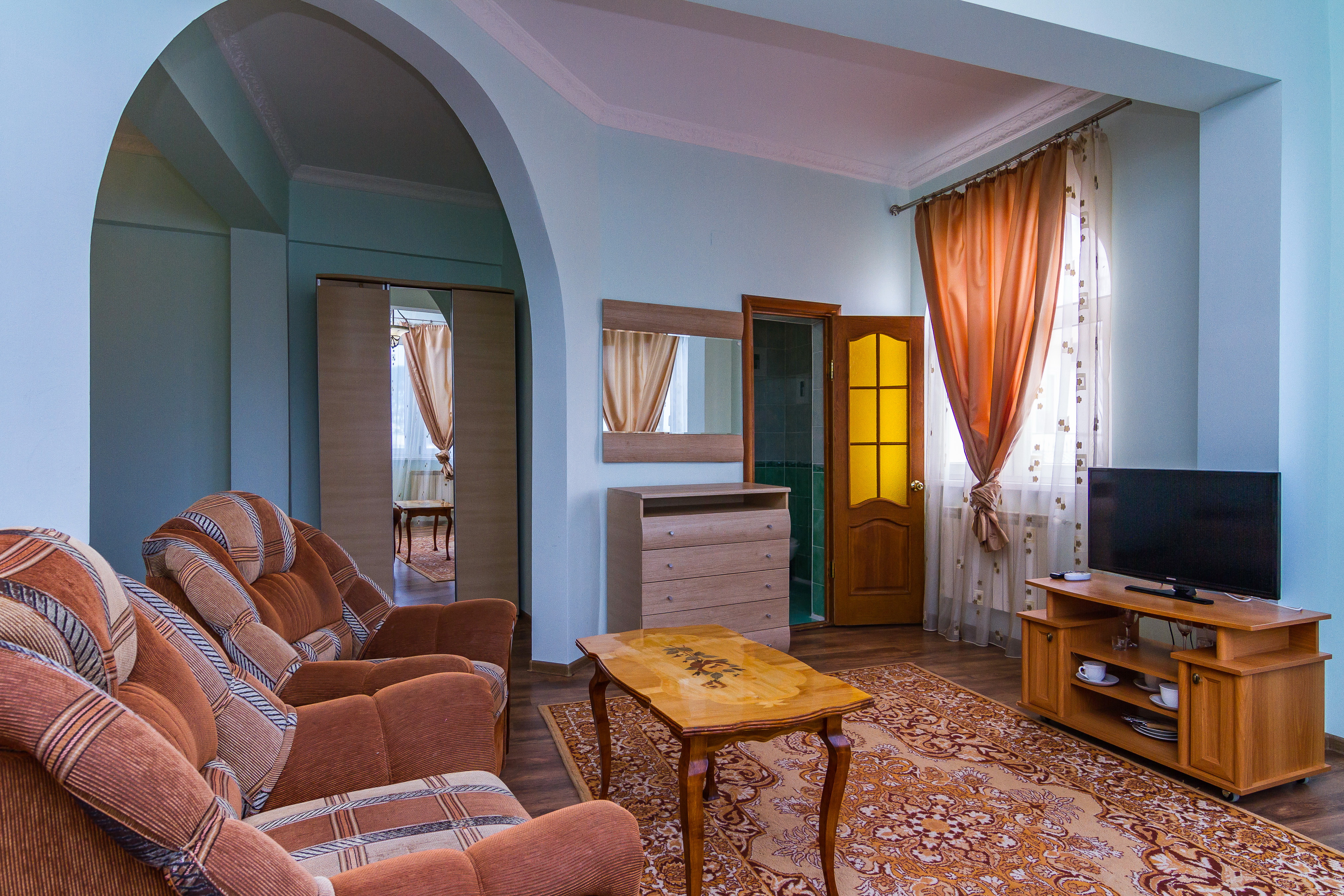 В номере: диван, зеркало, комод, кровать двуспальная, набор мягкой мебели, прикроватная тумбочка, стол, столик журнальный, стулья, тумба под телевизор, шкаф встроенный, кондиционер, мини-холодильник, телевизор