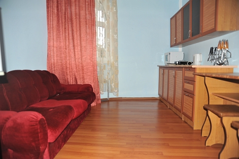 В номере: вешалка, диван, зеркало, комод, кресла, кровать двуспальная, кухонная мебель, прикроватные тумбочки, стол, столик журнальный, стулья, шкаф, шкаф для посуды, кондиционер, микроволновая печь, набор посуды, телевизор, холодильник, электрочайник