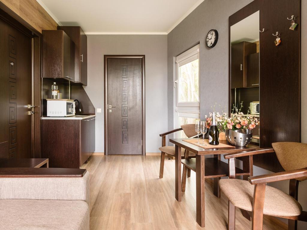 В номере: кресло-кровать, кровати односпальные /одна двуспальная кровать, прикроватные тумбочки, стол, столик журнальный, стулья, шкаф, гладильная доска, кондиционер, микроволновая печь, мини-холодильник, набор посуды, плита электрическая, сейф, стиральная машина, телевизор, утюг, электрочайник
