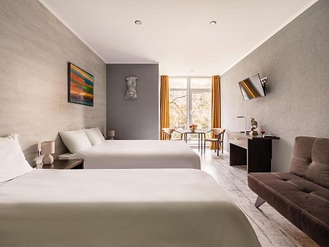 В номере: кровати односпальные /одна двуспальная кровать, прикроватные тумбочки, стол, стул, шкаф, гладильная доска, кондиционер, мини-холодильник, сейф, стиральная машина, телевизор, утюг, чайный набор посуды, электрочайник