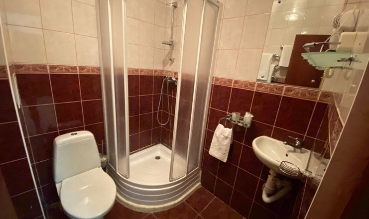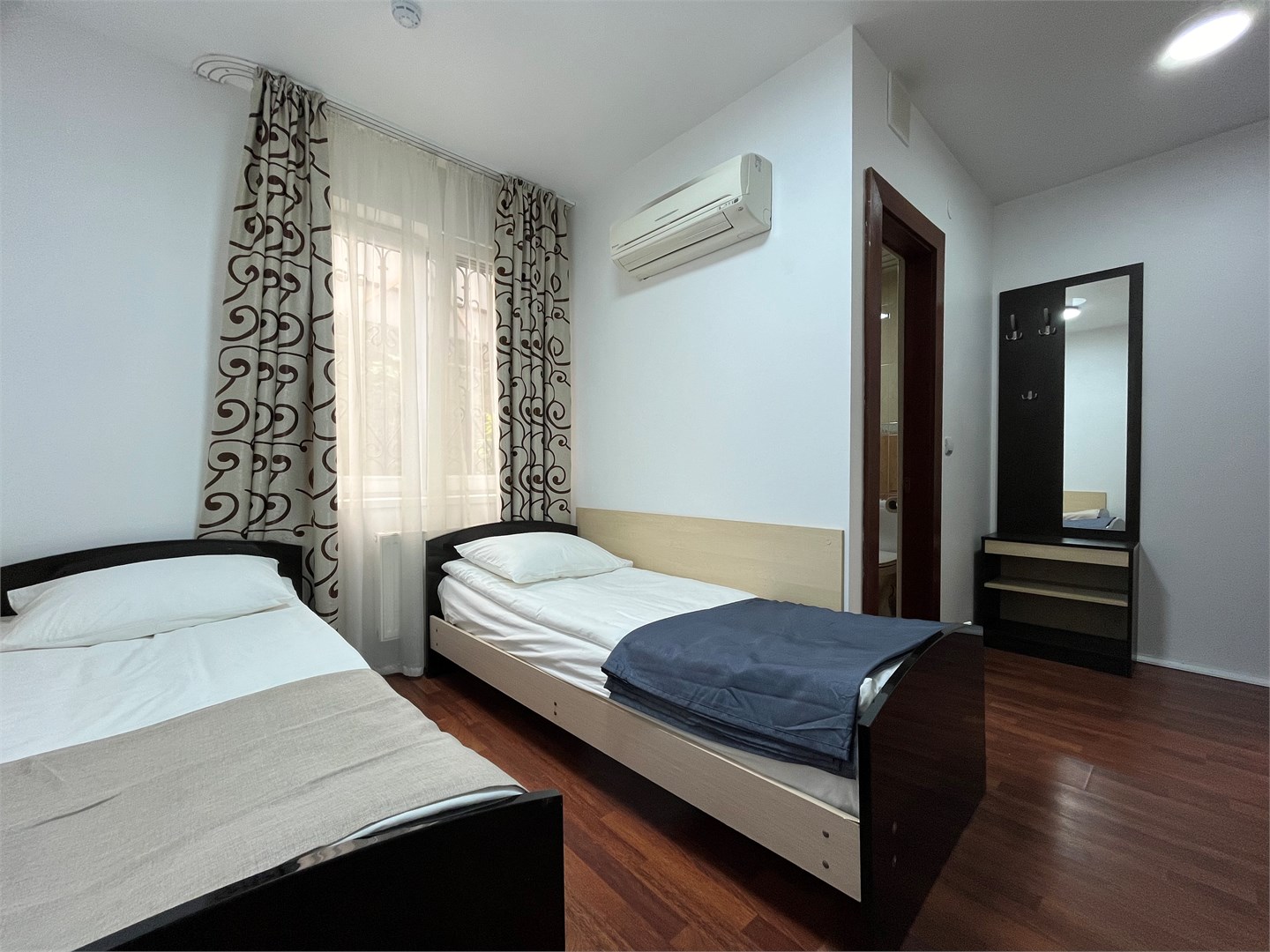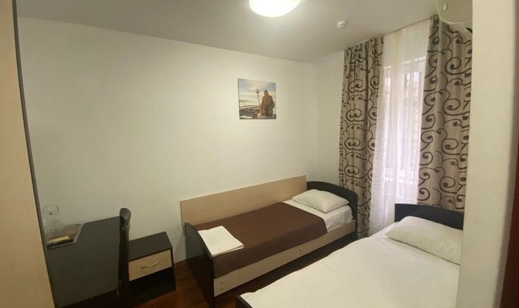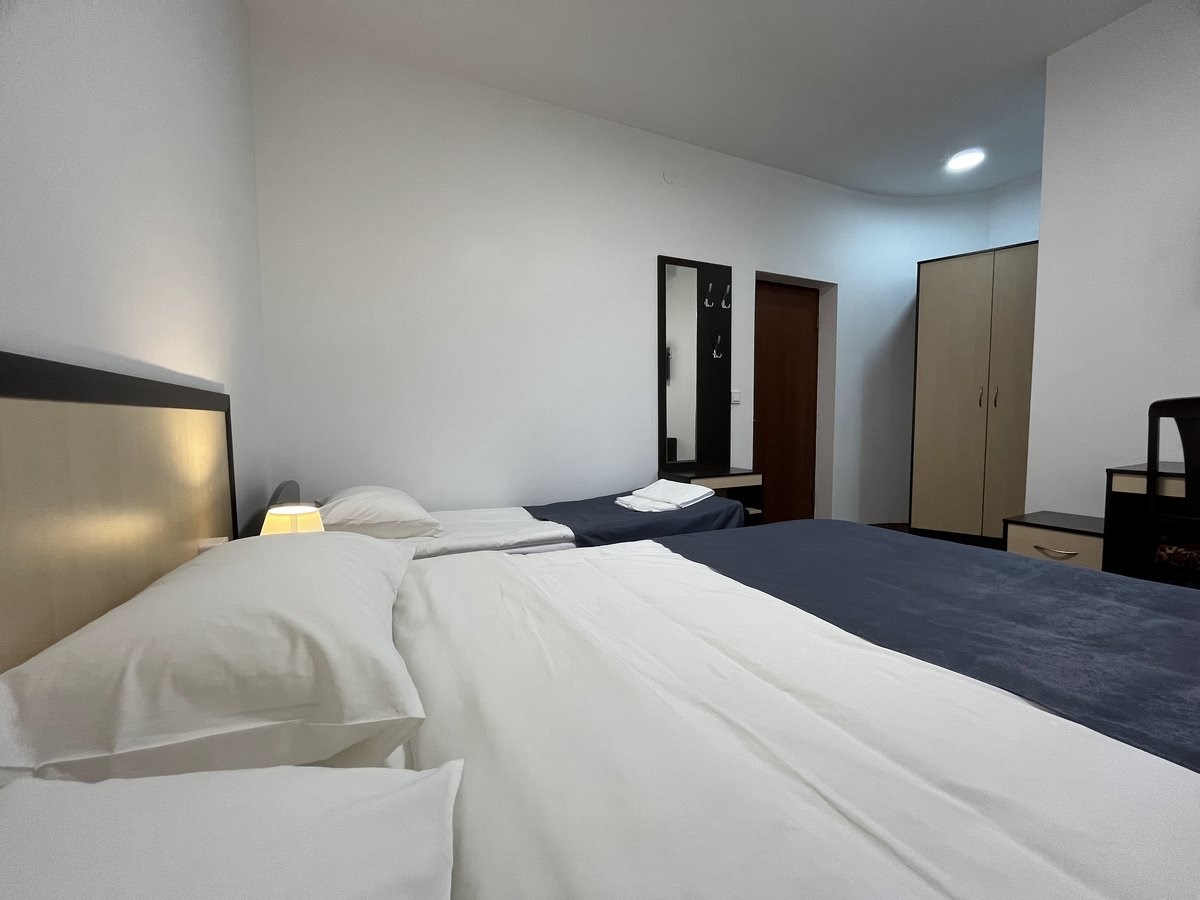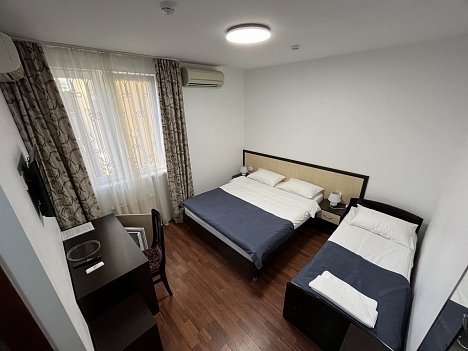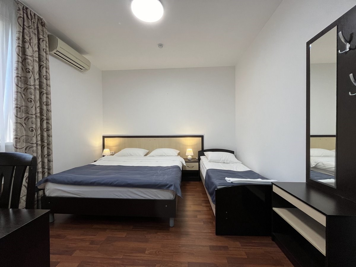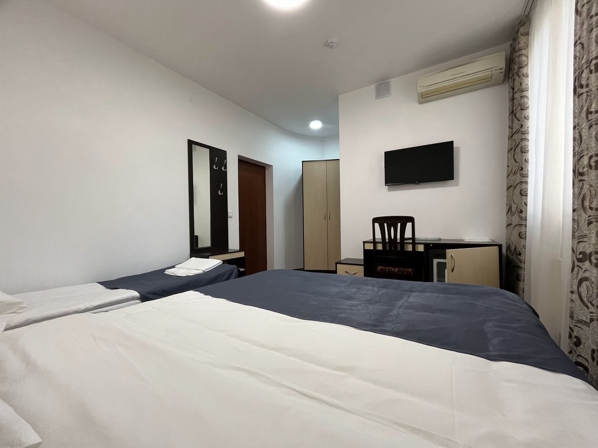 В номере: вешалка, зеркало, кровать двуспальная, кровать односпальная, прикроватная тумбочка, стол, стул, тумба, шкаф, кондиционер, мини-холодильник, телевизор