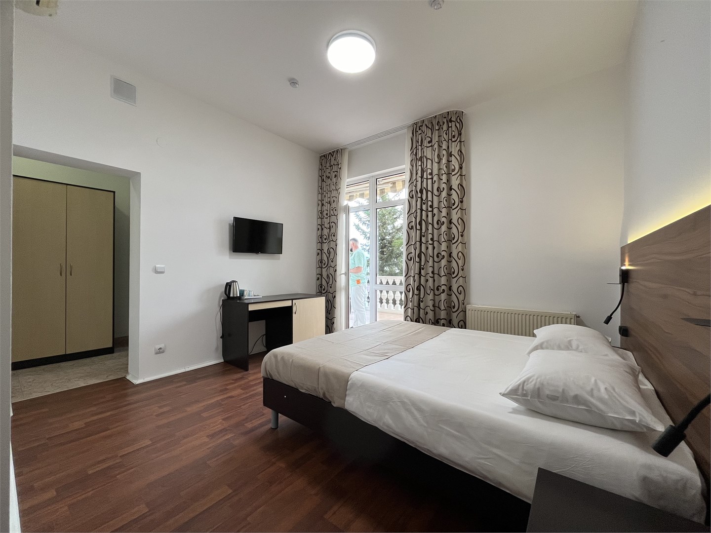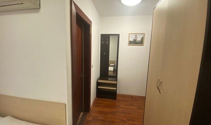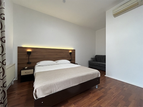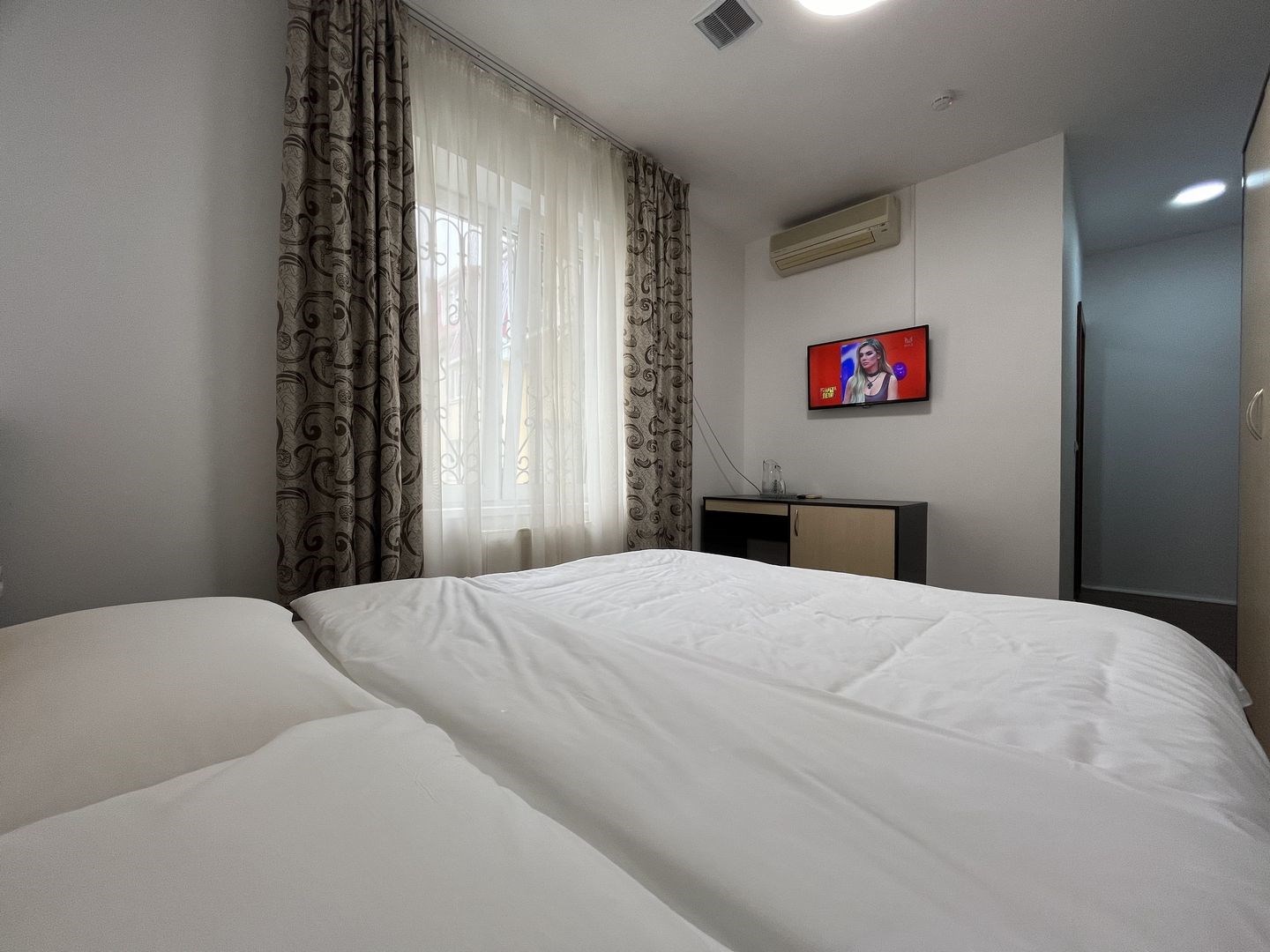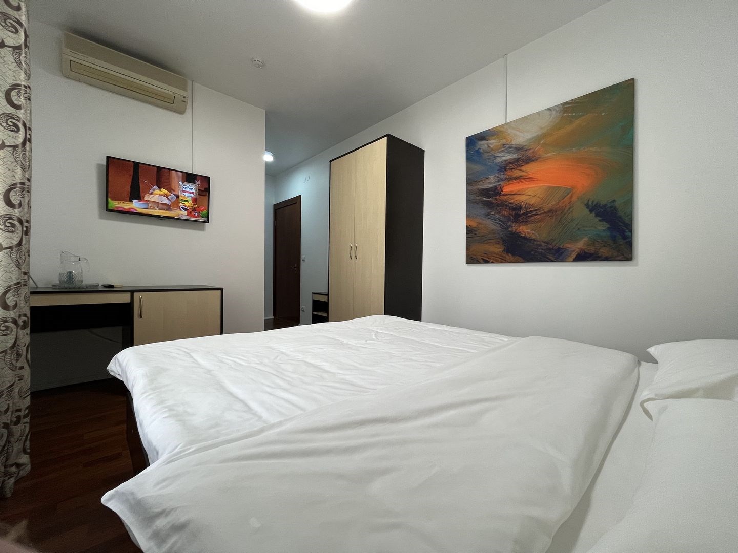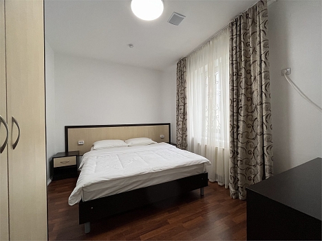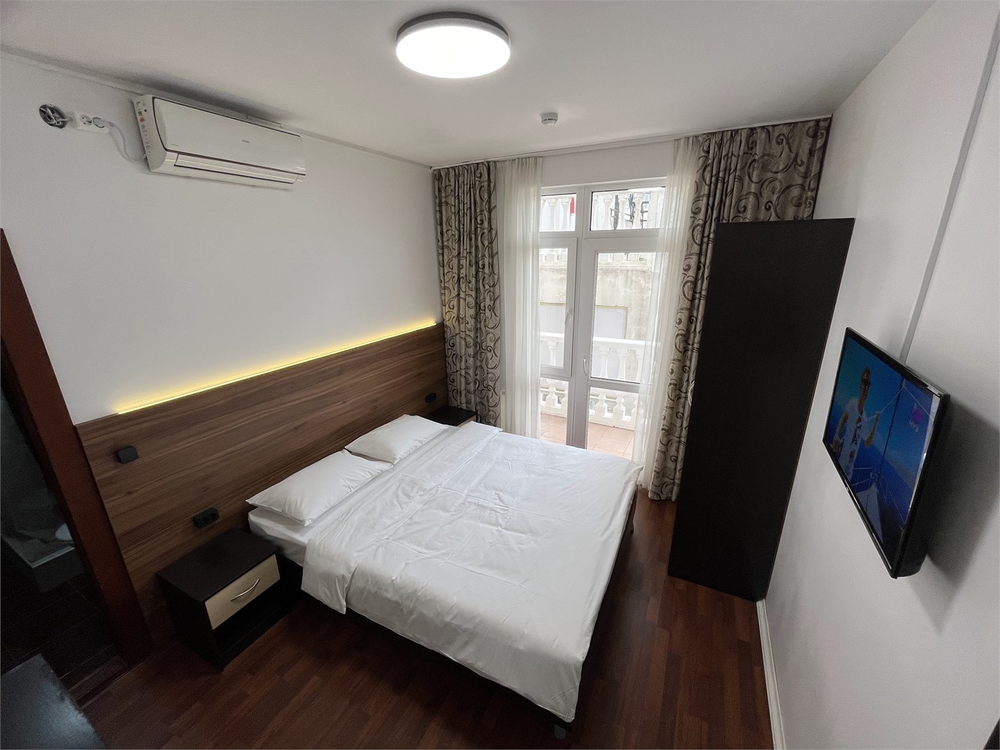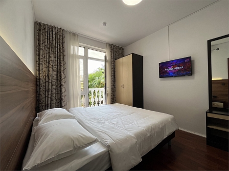 В номере: вешалка, диван раскладной, зеркало, кровать двуспальная, прикроватные тумбочки, стол, стул, шкаф, кондиционер, мини-холодильник, телевизор
