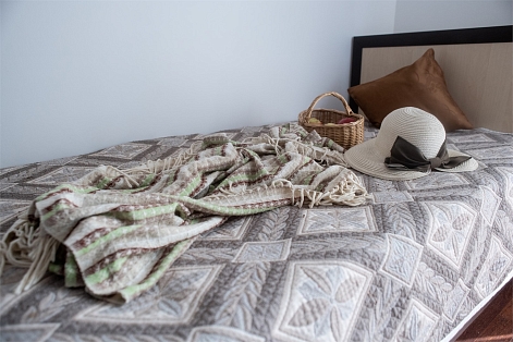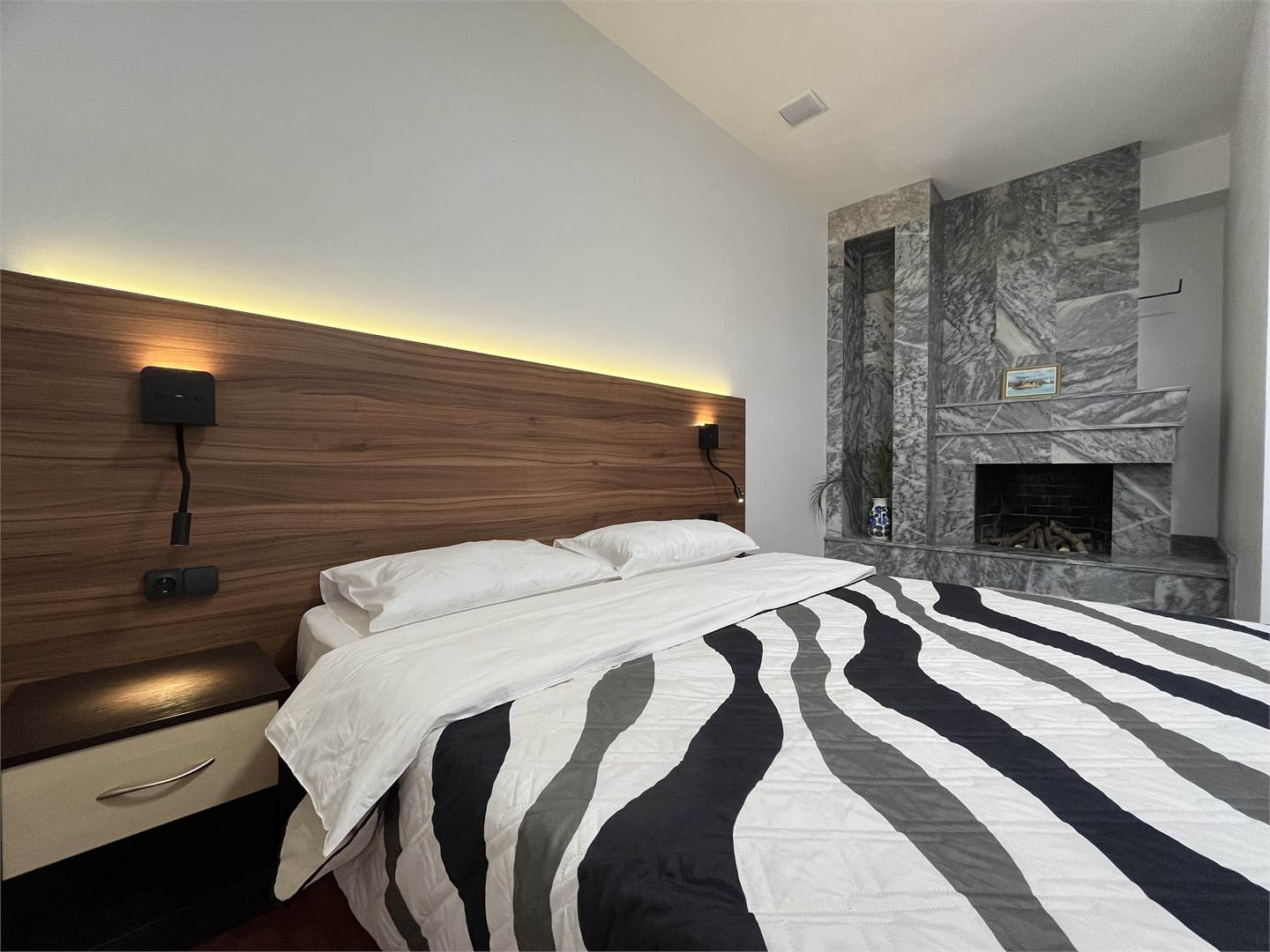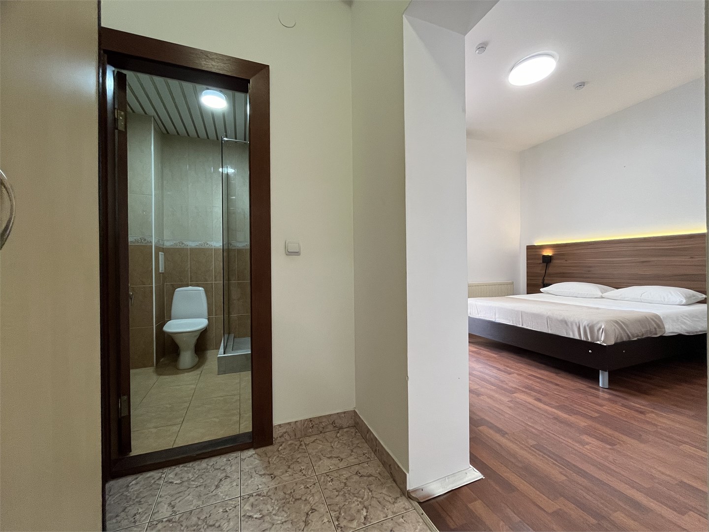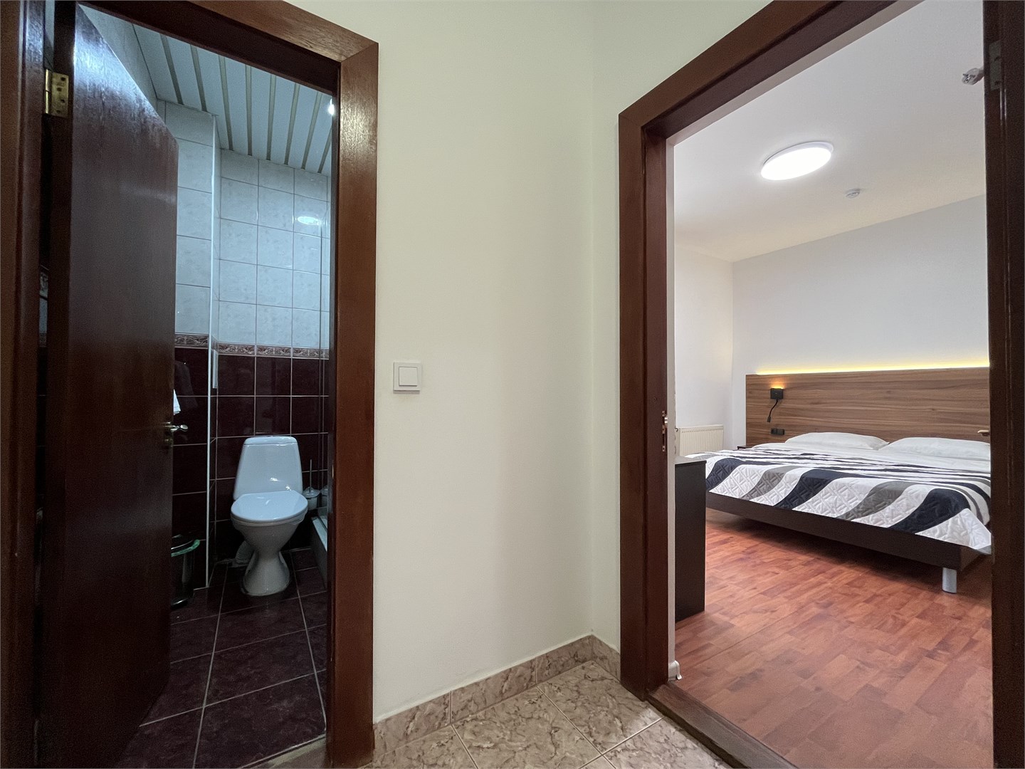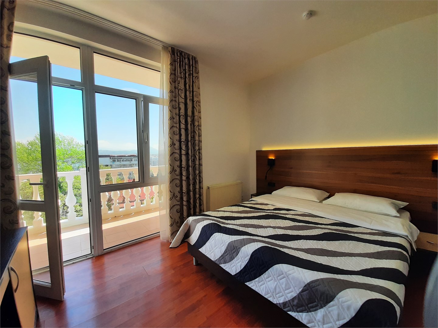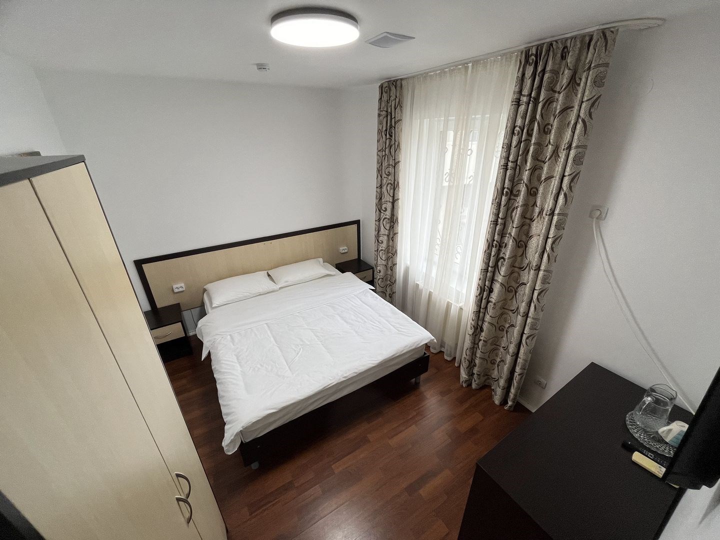 В номере: вешалка, диван раскладной, зеркало, кровать двуспальная, прикроватные тумбочки, стол, стул, шкаф, кондиционер, мини-холодильник, телевизор