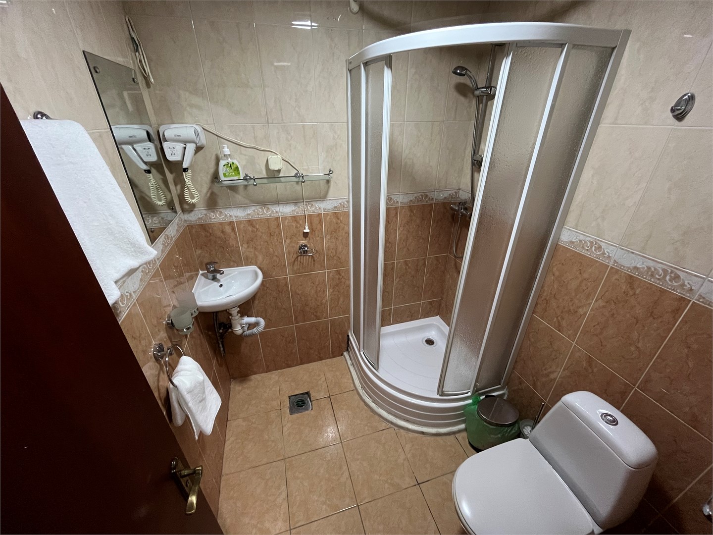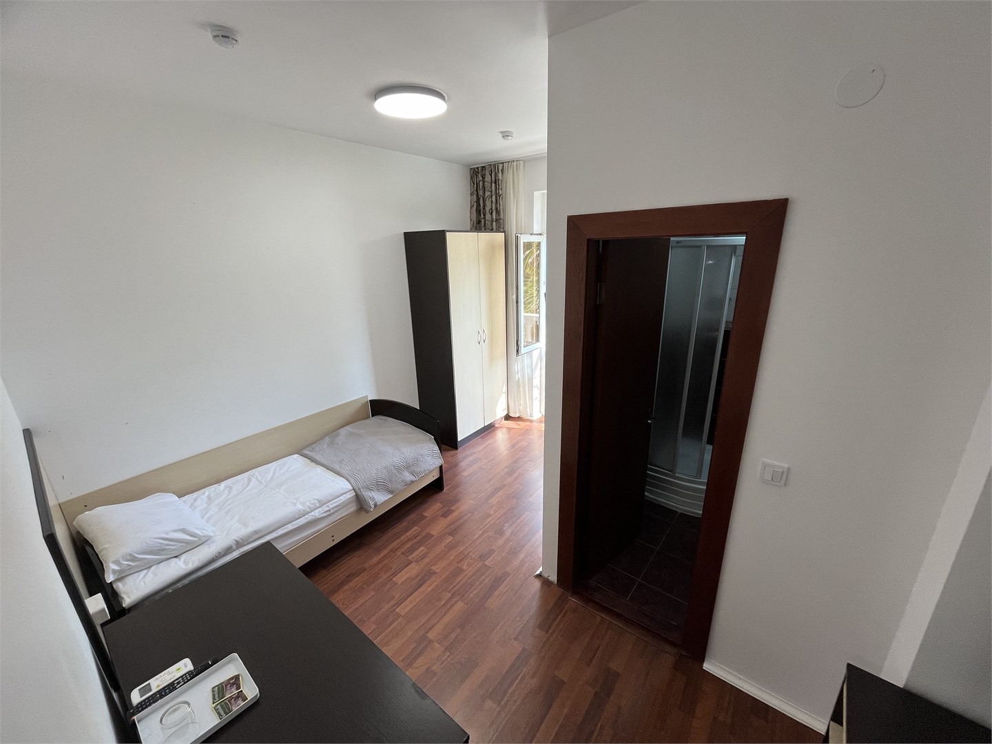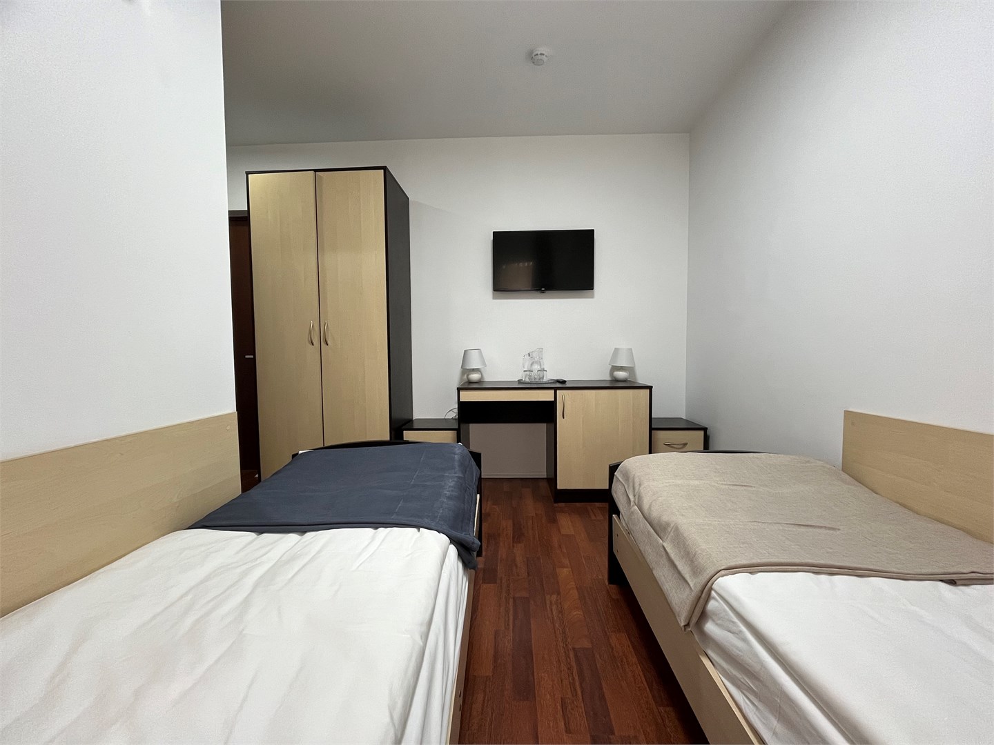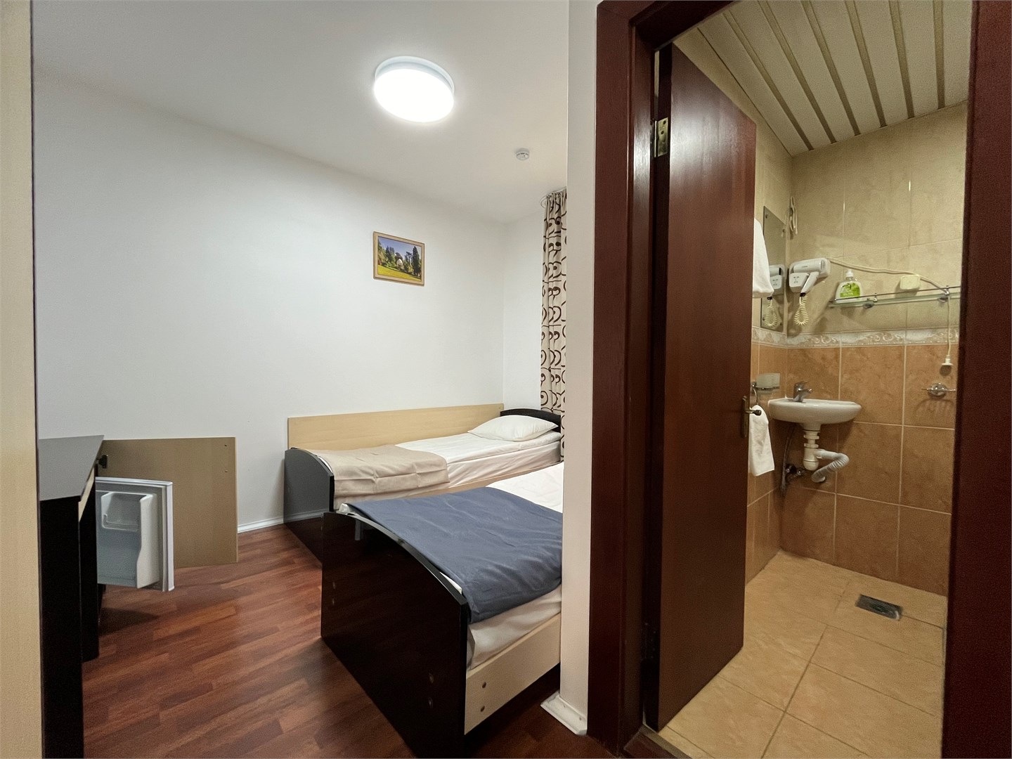 В номере: вешалка, зеркало, кровать односпальная, стол, тумба, шкаф, кондиционер, мини-холодильник, телевизор