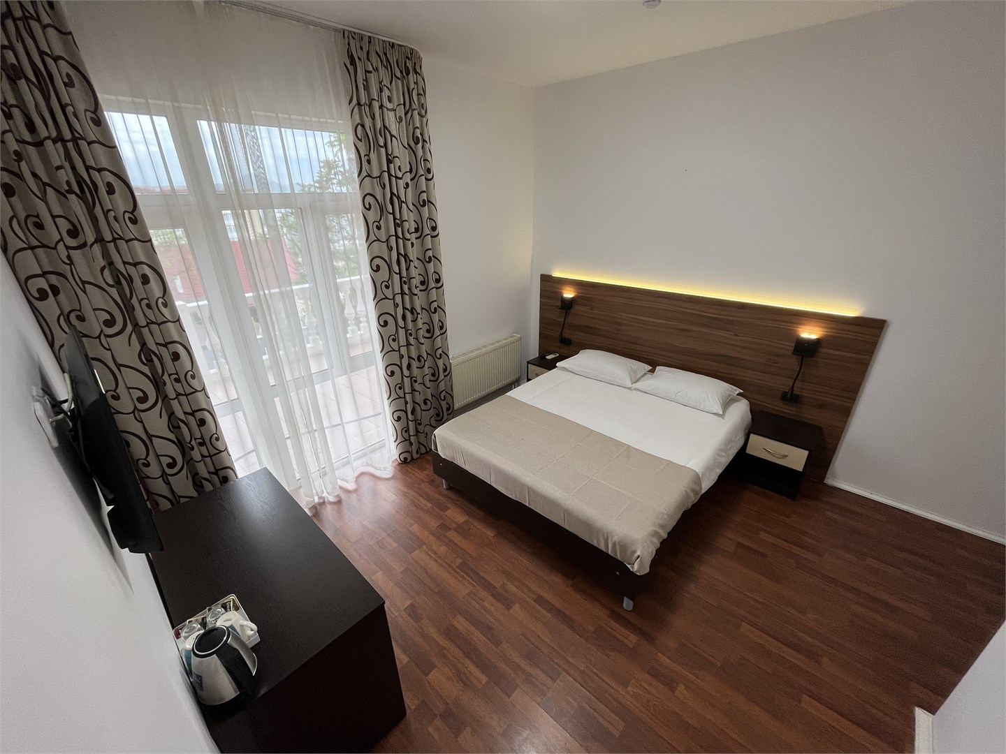 В номере: вешалка, зеркало, кровать двуспальная, прикроватные тумбочки, стол, тумба, шкаф, кондиционер, мини-холодильник, телевизор