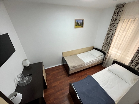 В номере: вешалка, зеркало, кровати односпальные, прикроватная тумбочка, стол, стул, тумба, шкаф, кондиционер, мини-холодильник, телевизор