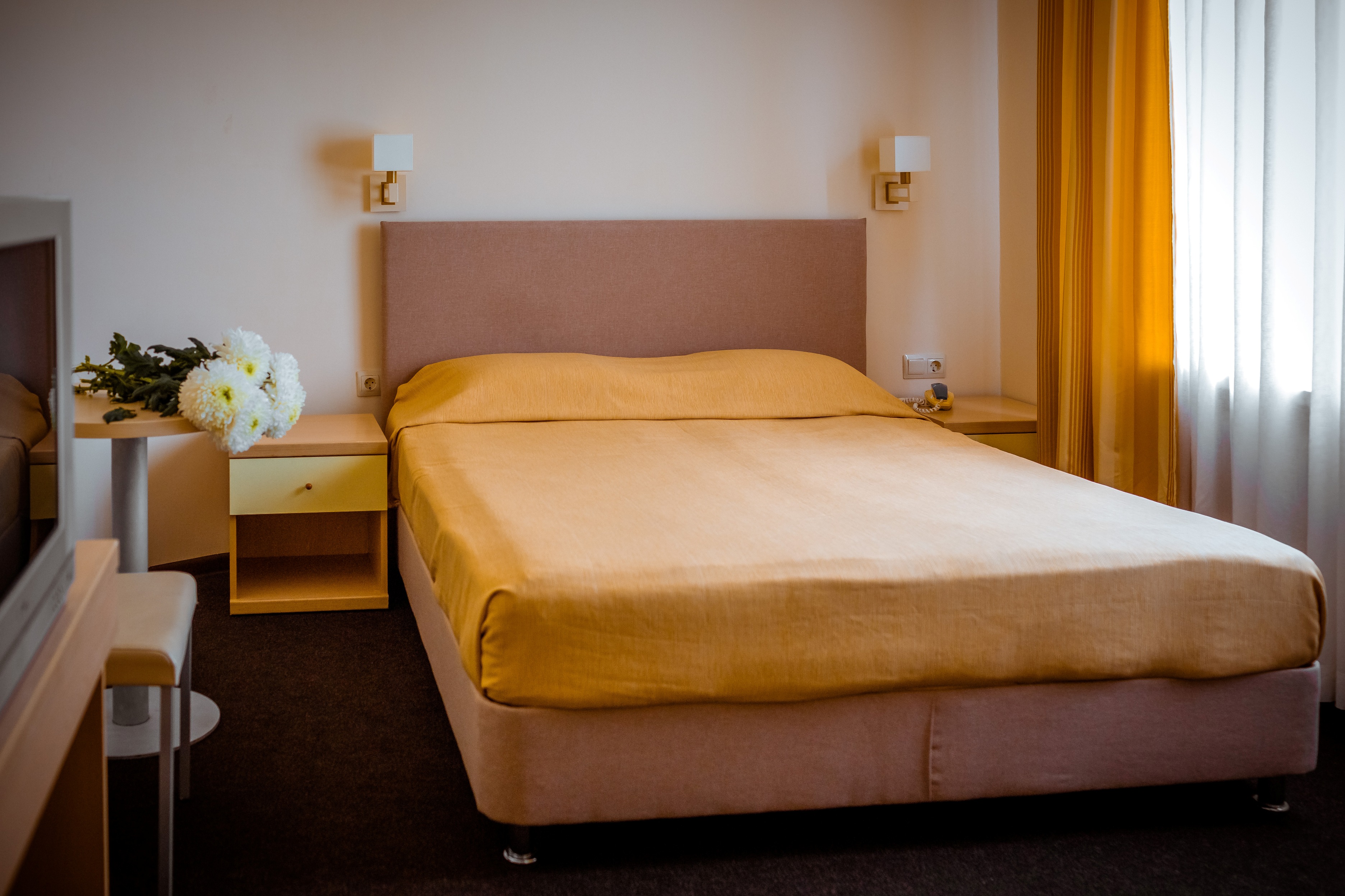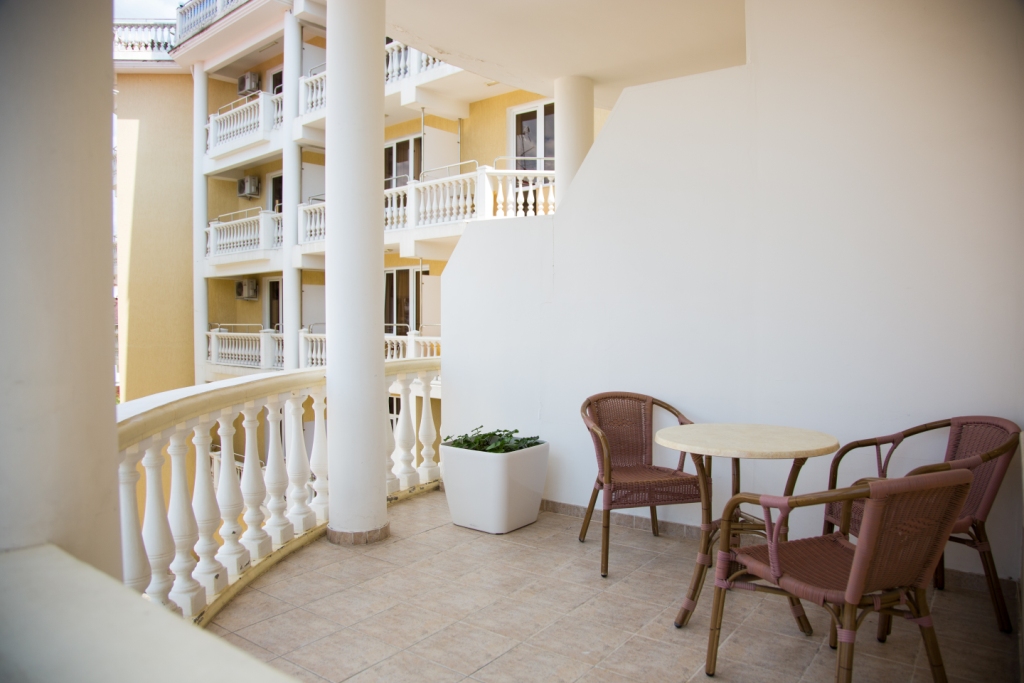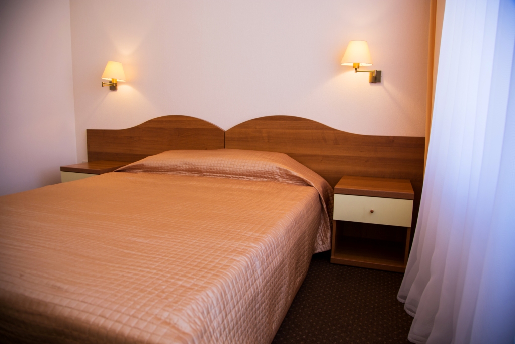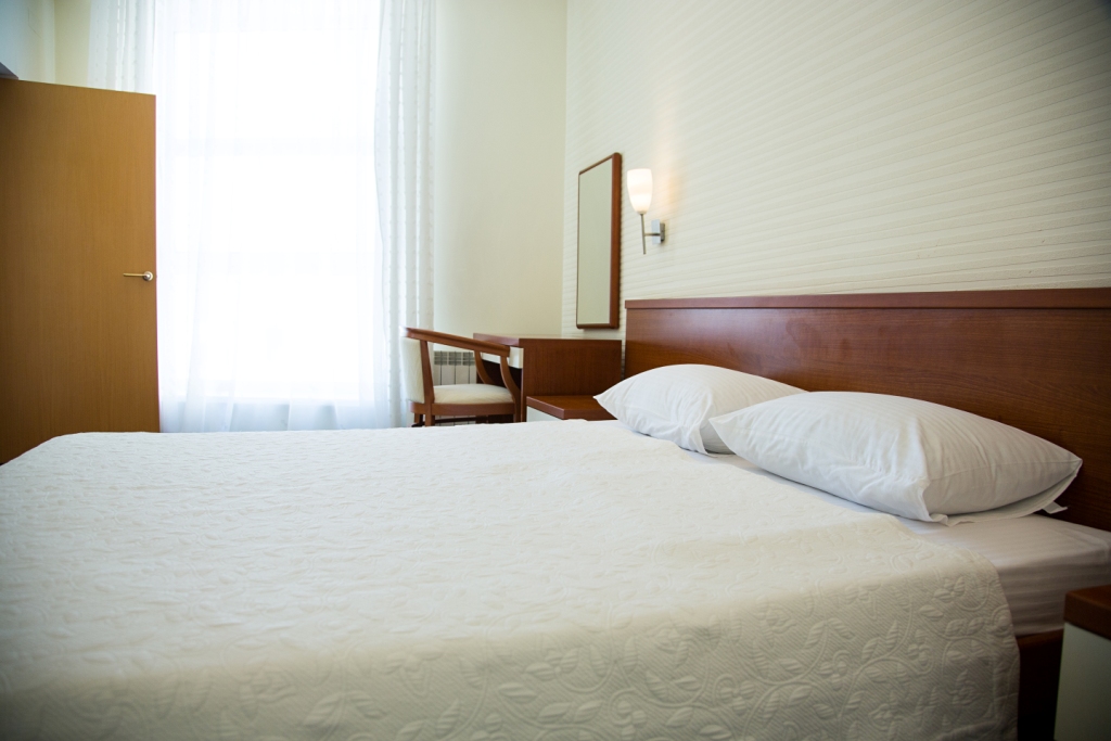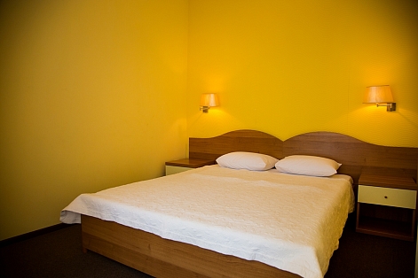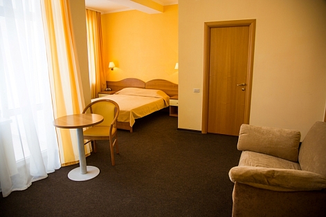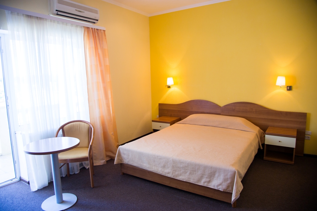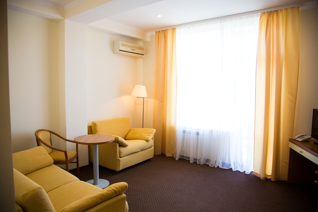 В номере: вешалка, зеркало, кресло-кровать, кровать двуспальная, прикроватные тумбочки, стол, столик кофейный, стулья, шкаф, мини-холодильник, сейф, сплит-система, телевизор, электрочайник