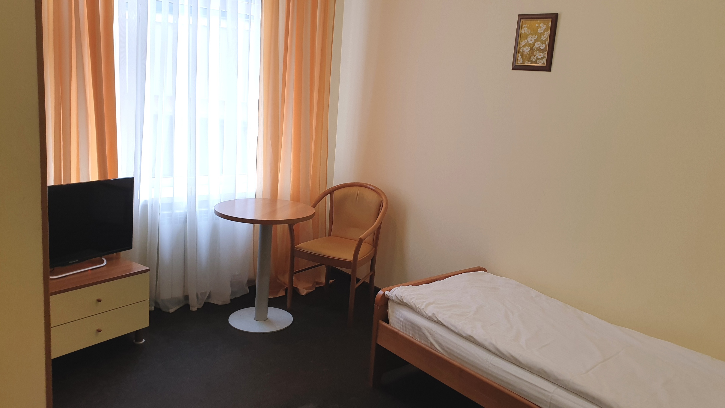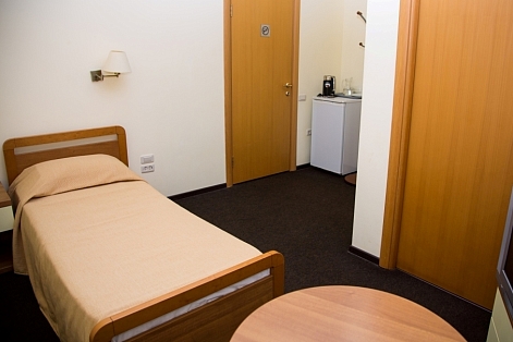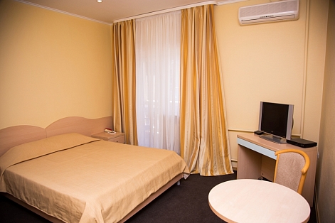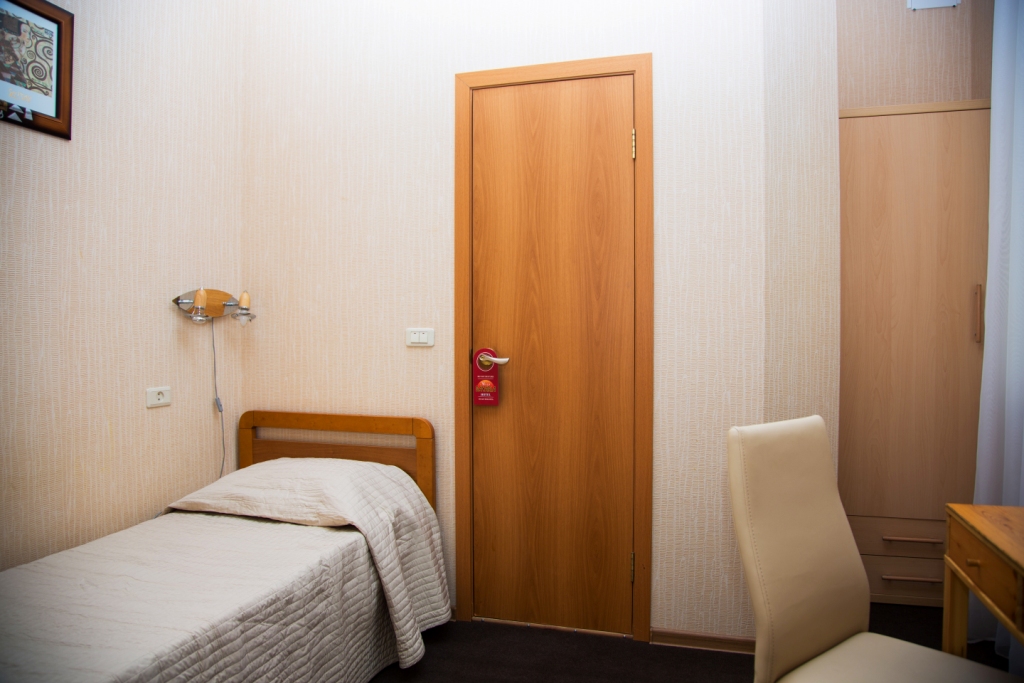 В номере: вешалка, зеркало, кровать односпальная, прикроватная тумбочка, столик кофейный, стулья, шкаф, сейф, сплит-система, телевизор, холодильник, электрочайник