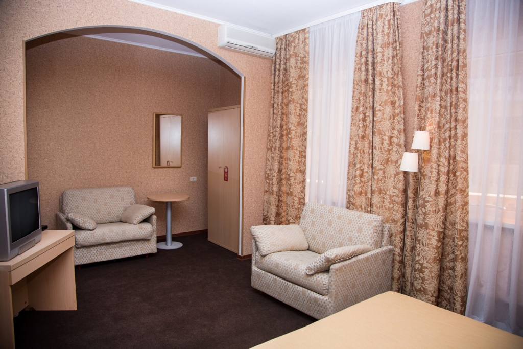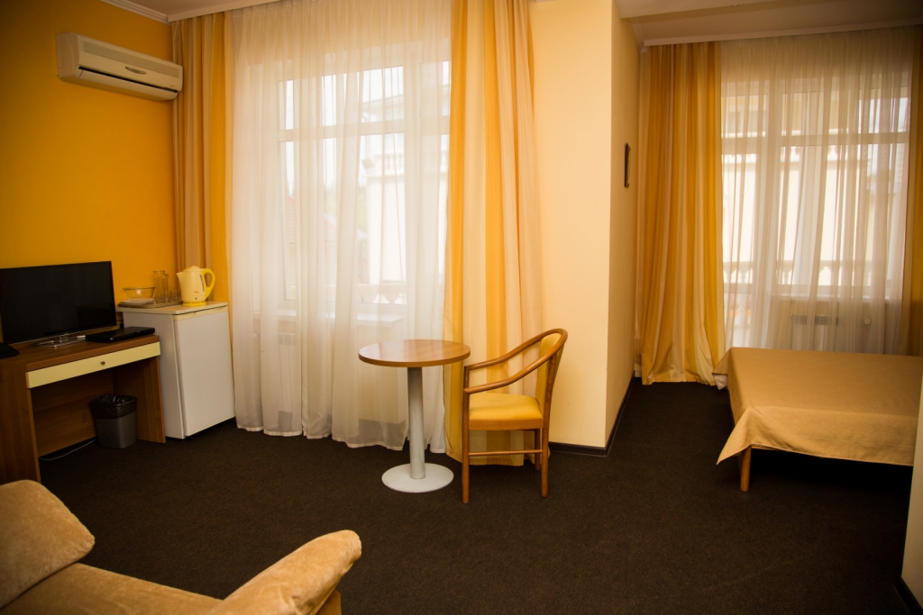 В номере: вешалка, зеркало, кресло-кровать, кровати односпальные /одна двуспальная кровать, прикроватная тумбочка, прикроватные тумбочки, столик кофейный, стулья, шкаф, мини-холодильник, сейф, сплит-система, телевизор, электрочайник