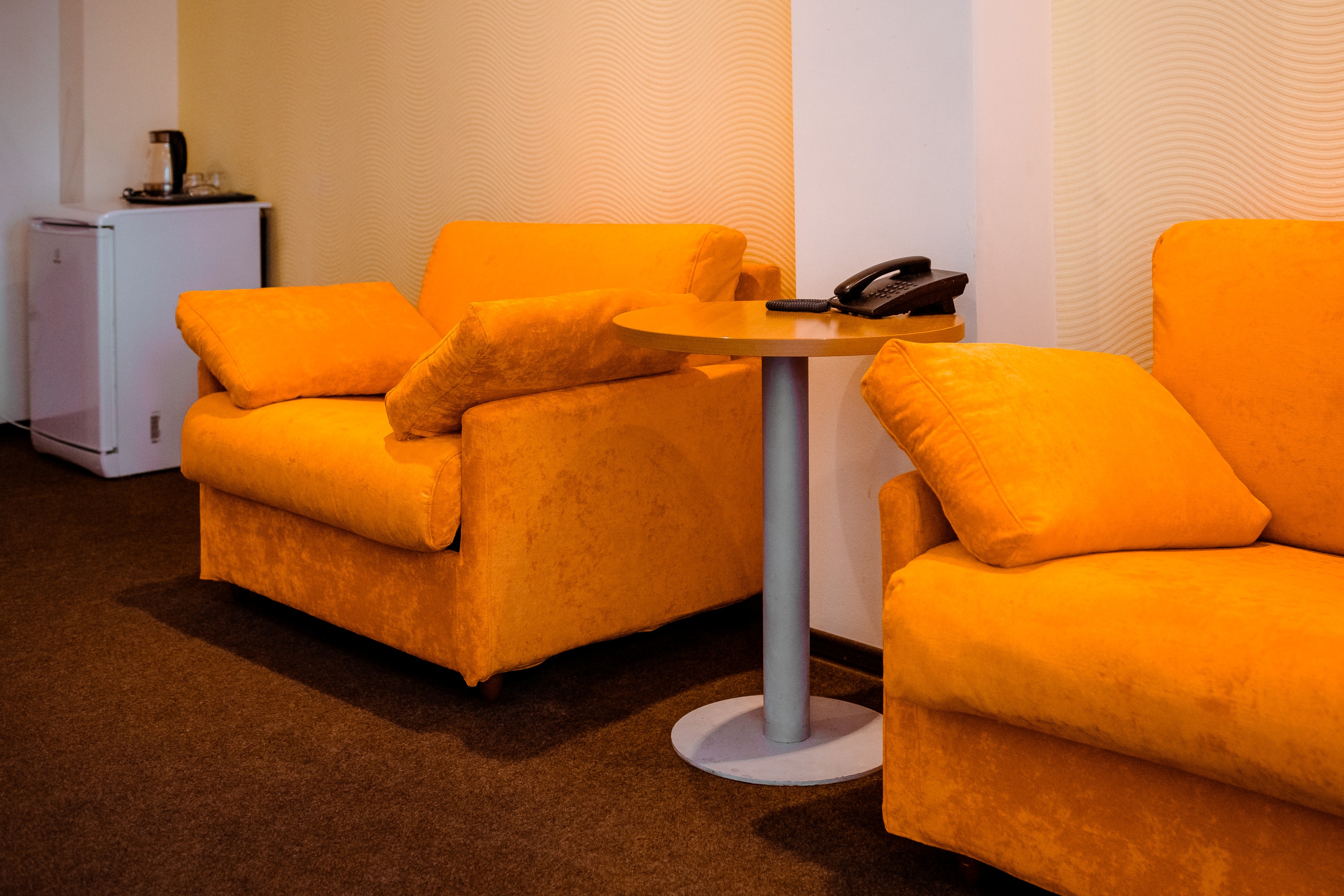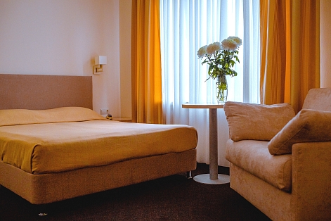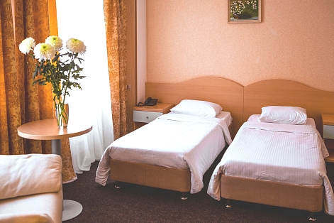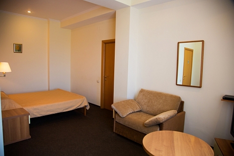 В номере: вешалка, зеркало, кресло, кровати односпальные, прикроватные тумбочки, столик кофейный, стулья, шкаф, мини-холодильник, сейф, сплит-система, телевизор, электрочайник