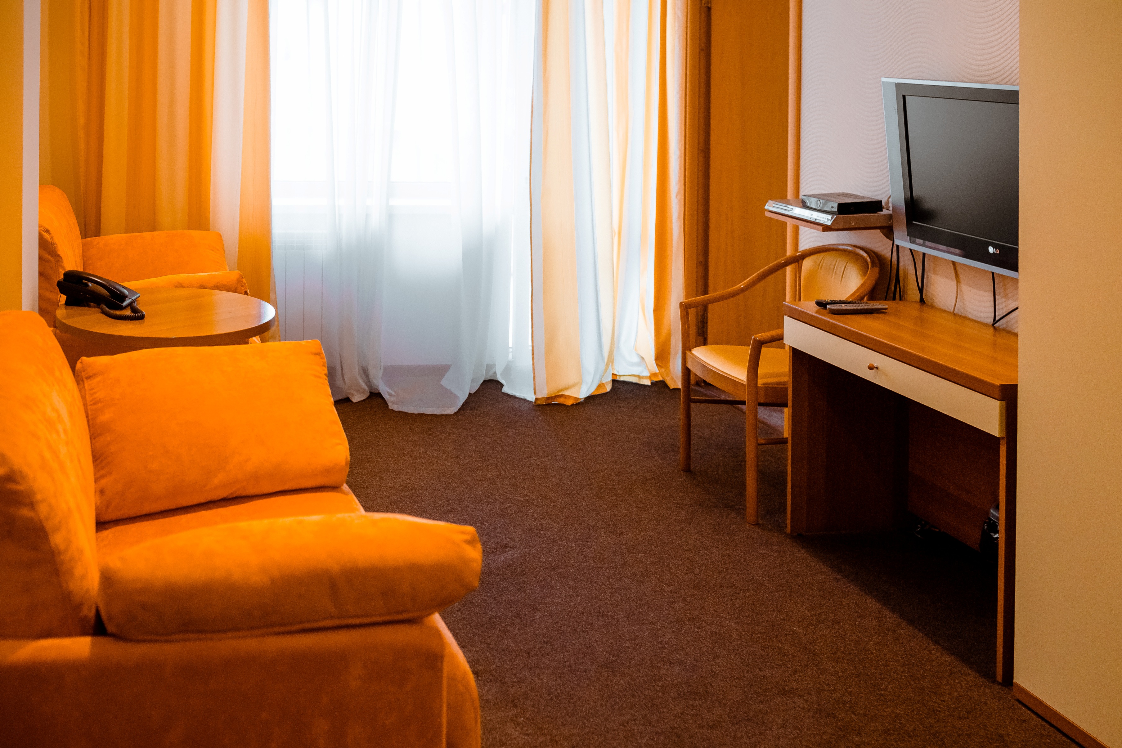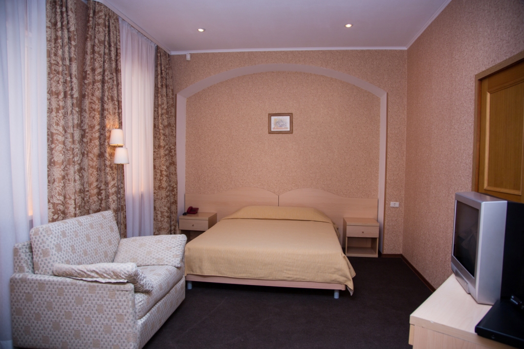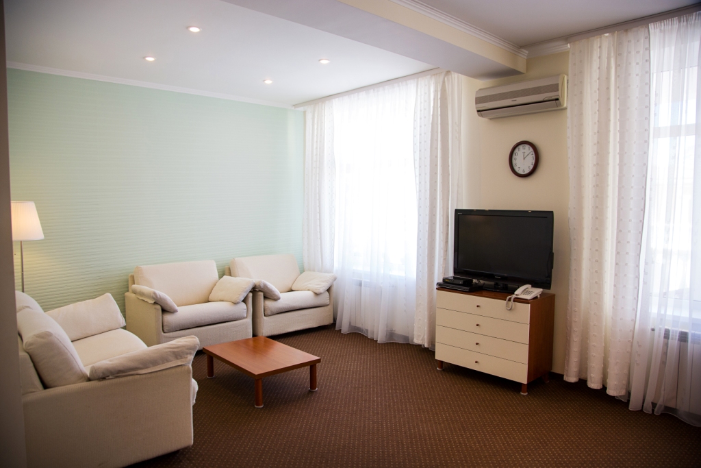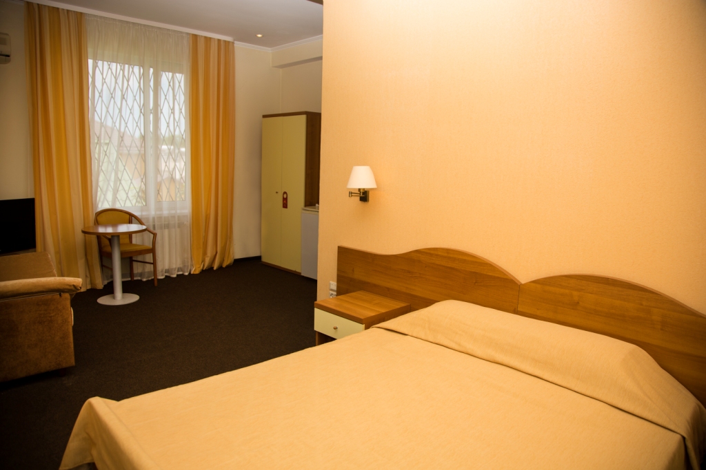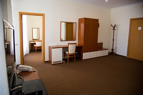 В номере: вешалка, диван, зеркало, кресло, кровать двуспальная, прикроватные тумбочки, столик журнальный, столик туалетный, шкаф, сейф, сплит-система, телевизор, холодильник, чайный набор посуды