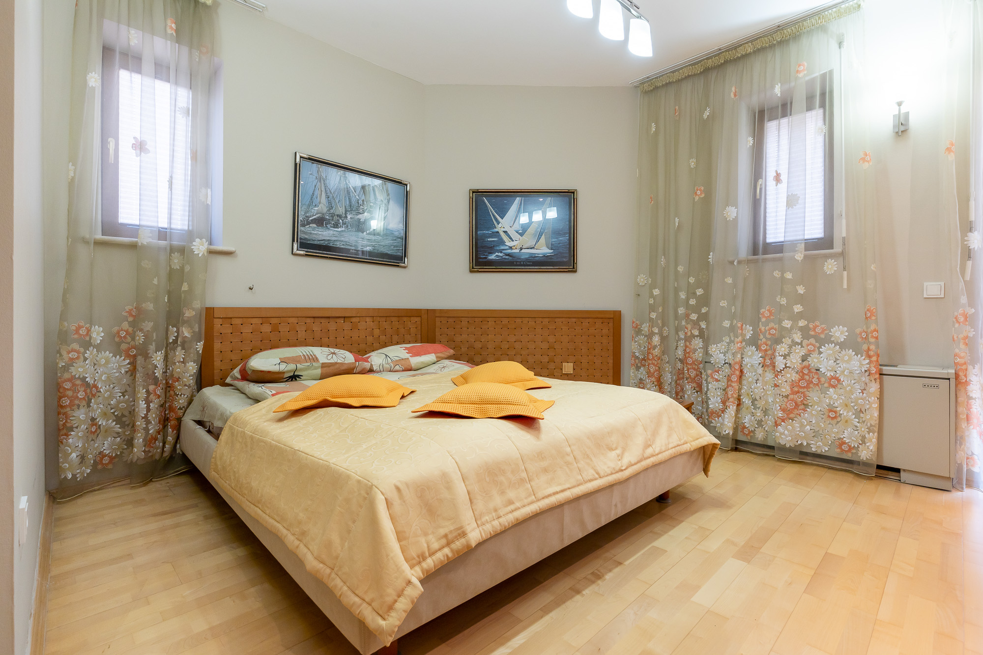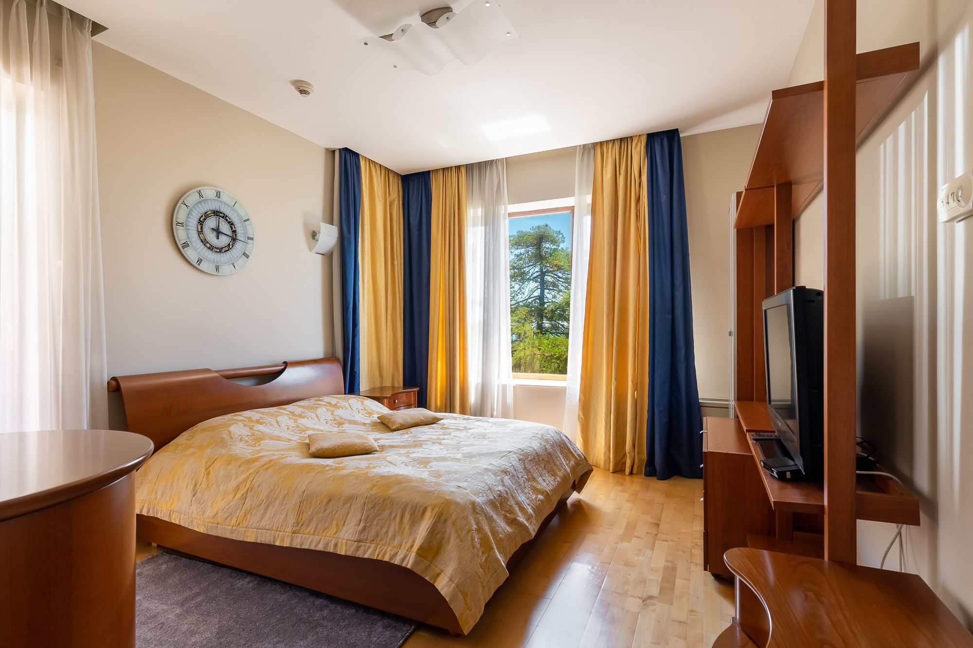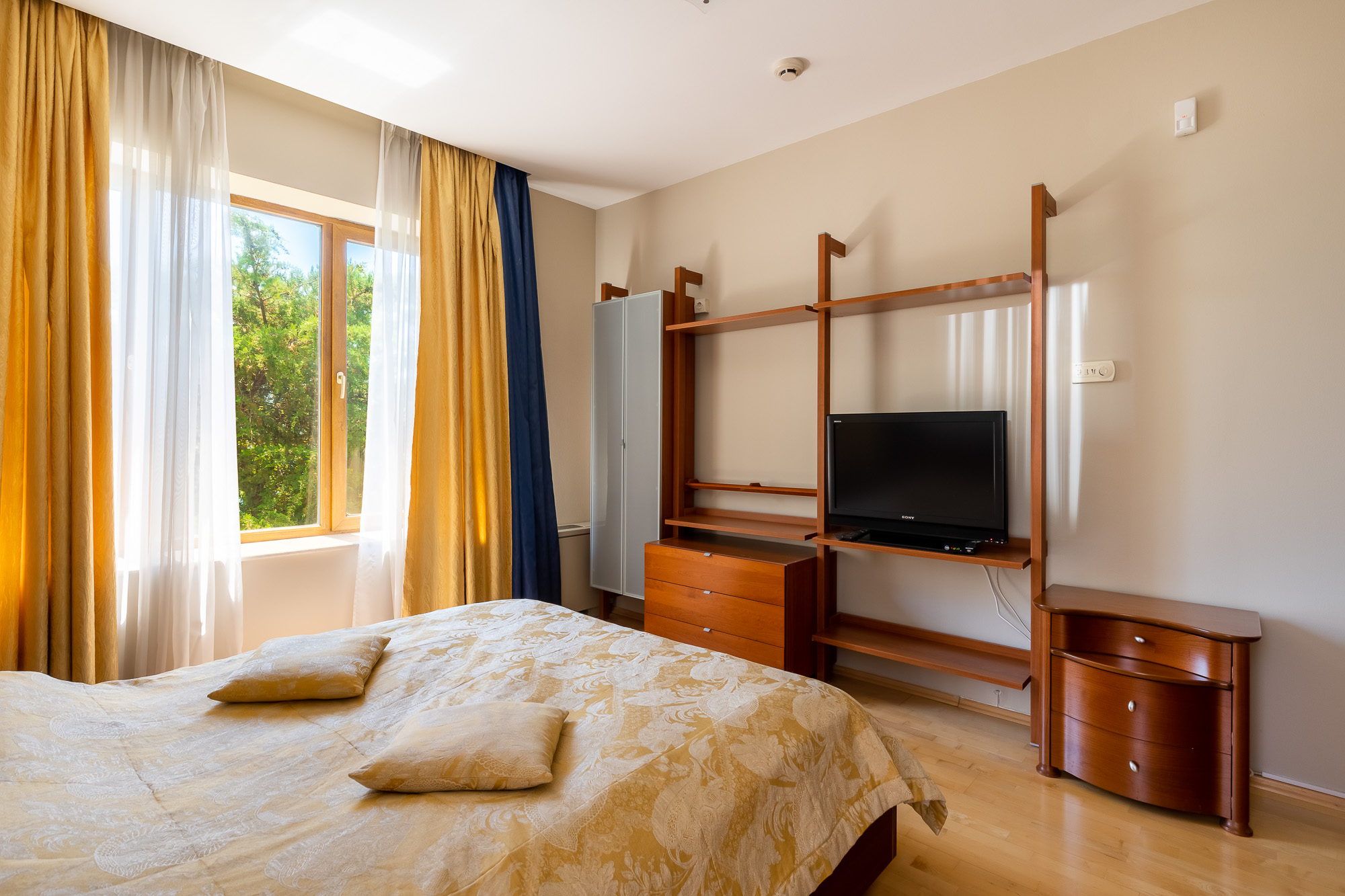 В номере: вешалка, диван, диван раскладной, зеркало, кресло, кровать двуспальная, кухонная мебель, набор мягкой мебели, прикроватные тумбочки, стол, стулья, шкаф-купе, кондиционер, микроволновая печь, набор посуды, телевизор, телевизор ЖК, телефон, утюг, холодильник, чайный набор посуды, электрочайник