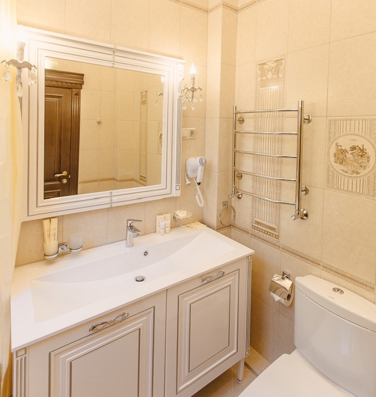 В номере: зеркало, кресло-кровать, кровать двуспальная, прикроватные тумбочки, стол, стулья, шкаф, кондиционер, сейф, телевизор ЖК, холодильник, чайный набор посуды, электрочайник