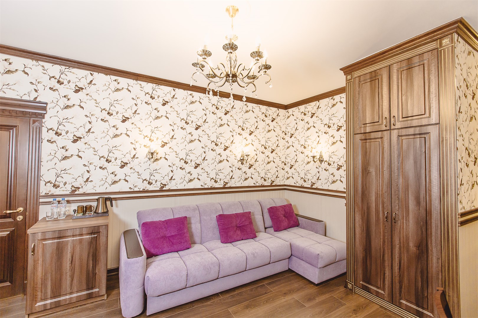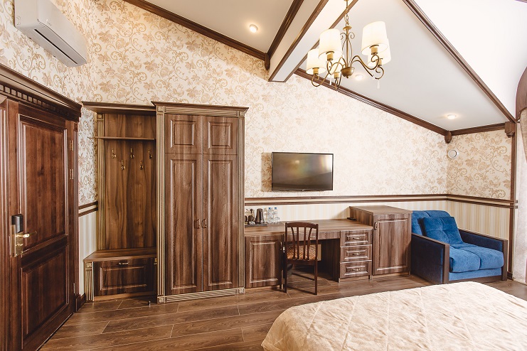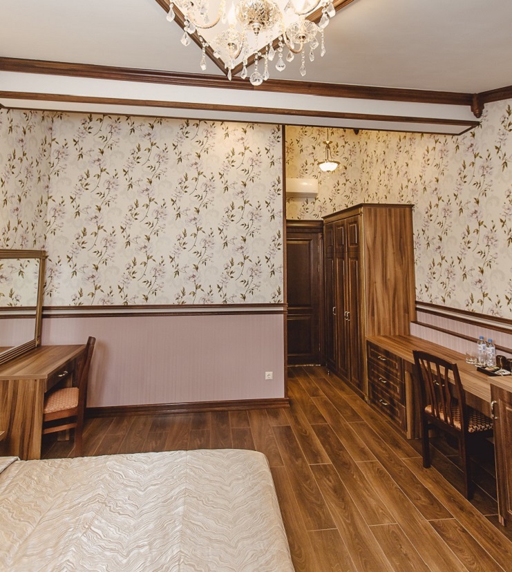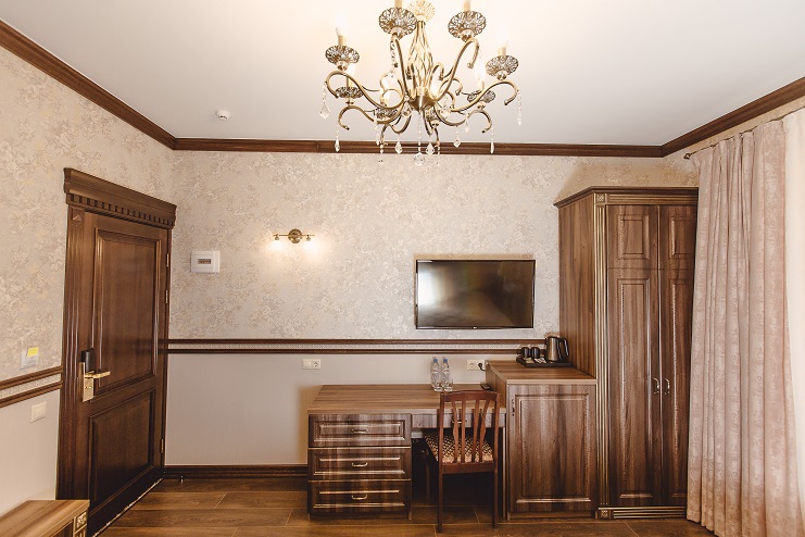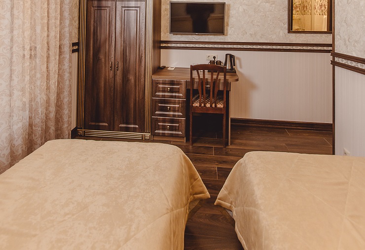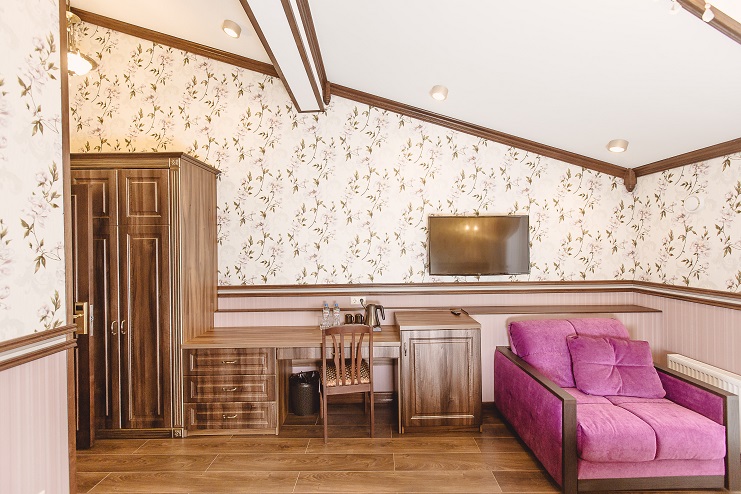 В номере: диван, комод, шкаф, кондиционер, мини-холодильник, плита электрическая, телевизор, утюг, чайник, чайный набор посуды