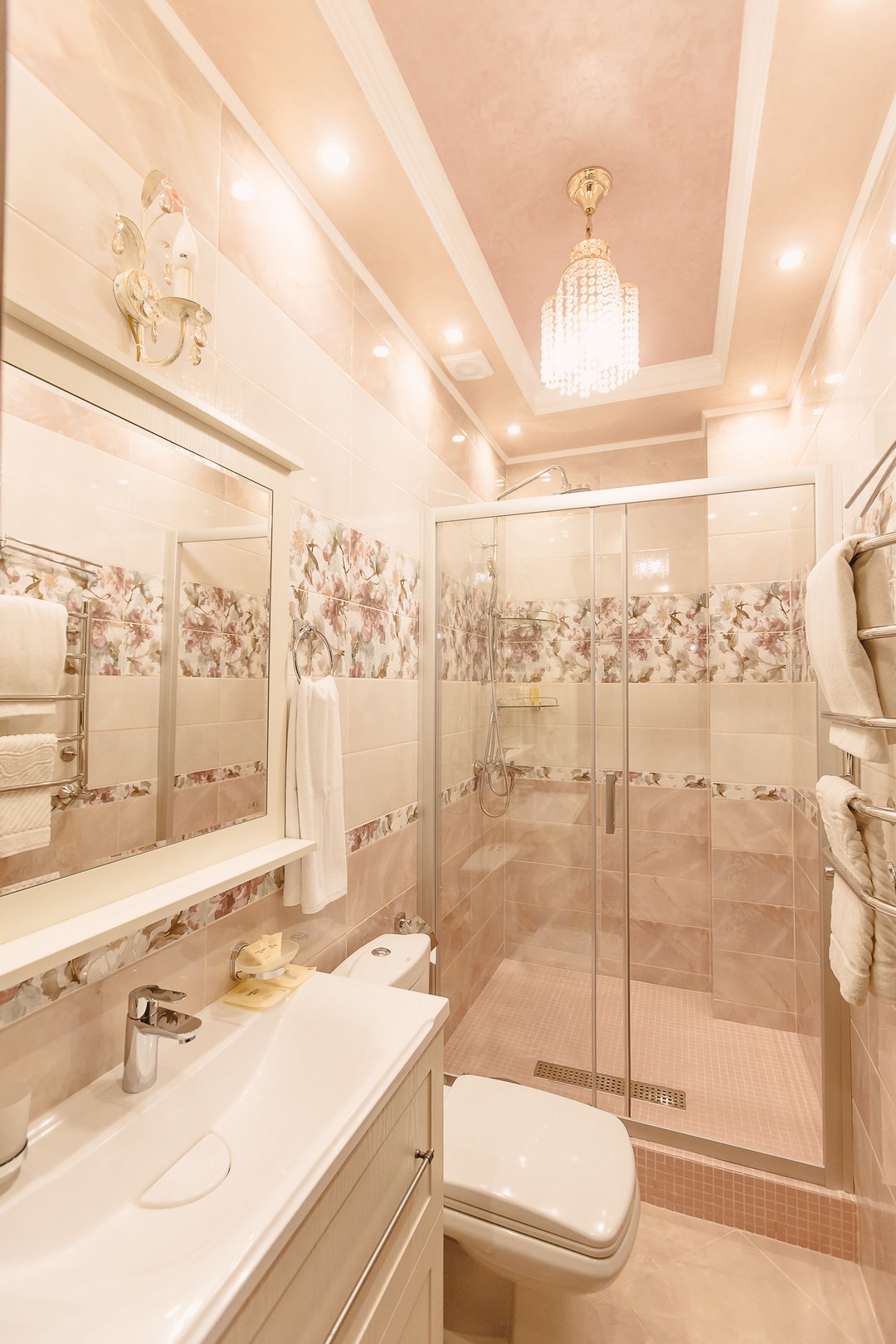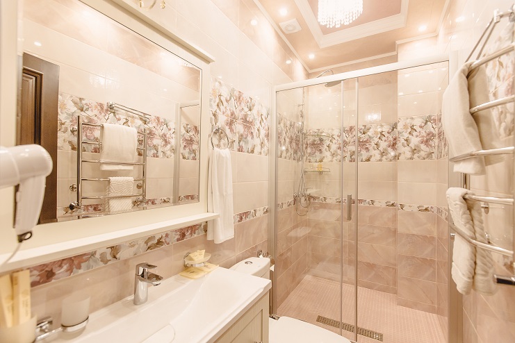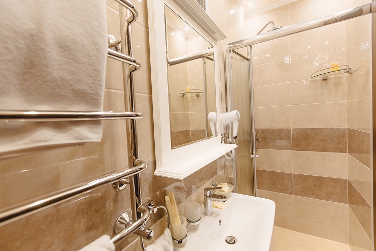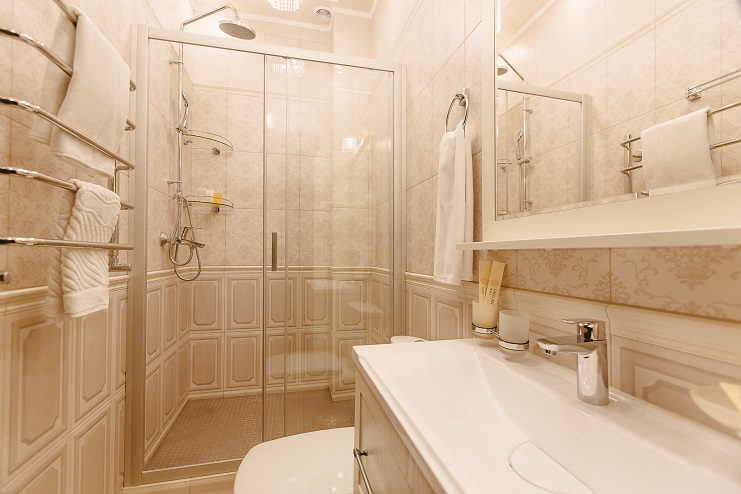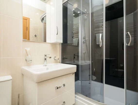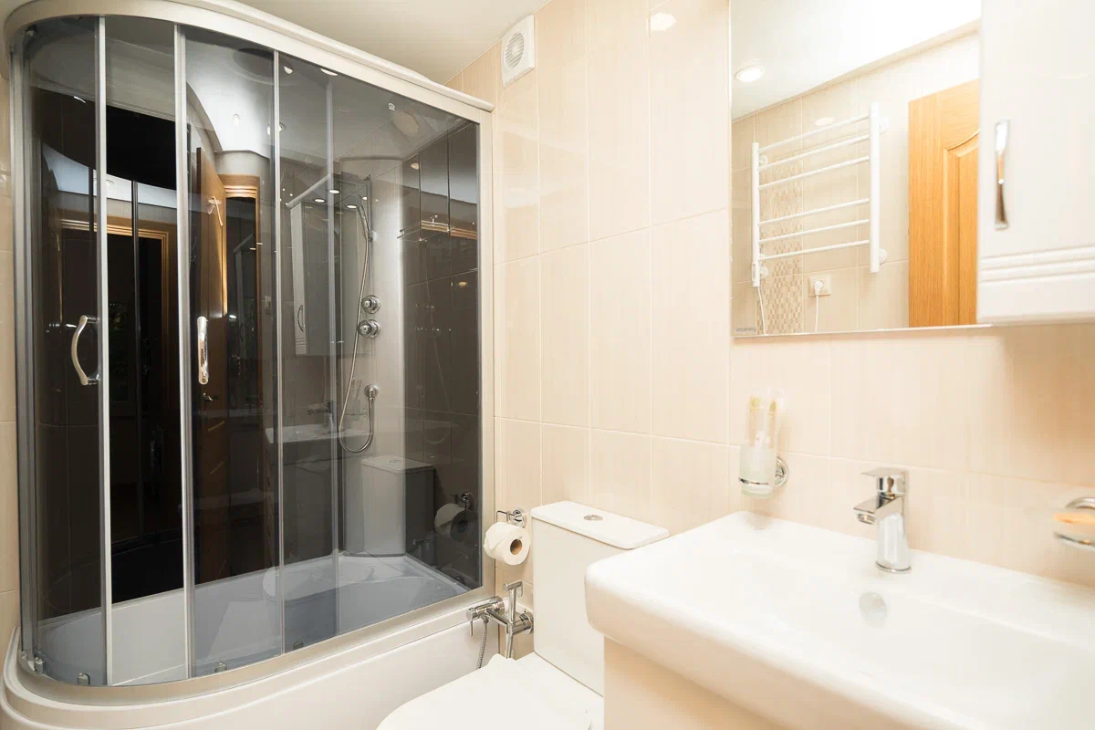 Санузел: с душевой кабиной, тапочки, туалетные принадлежности, фен