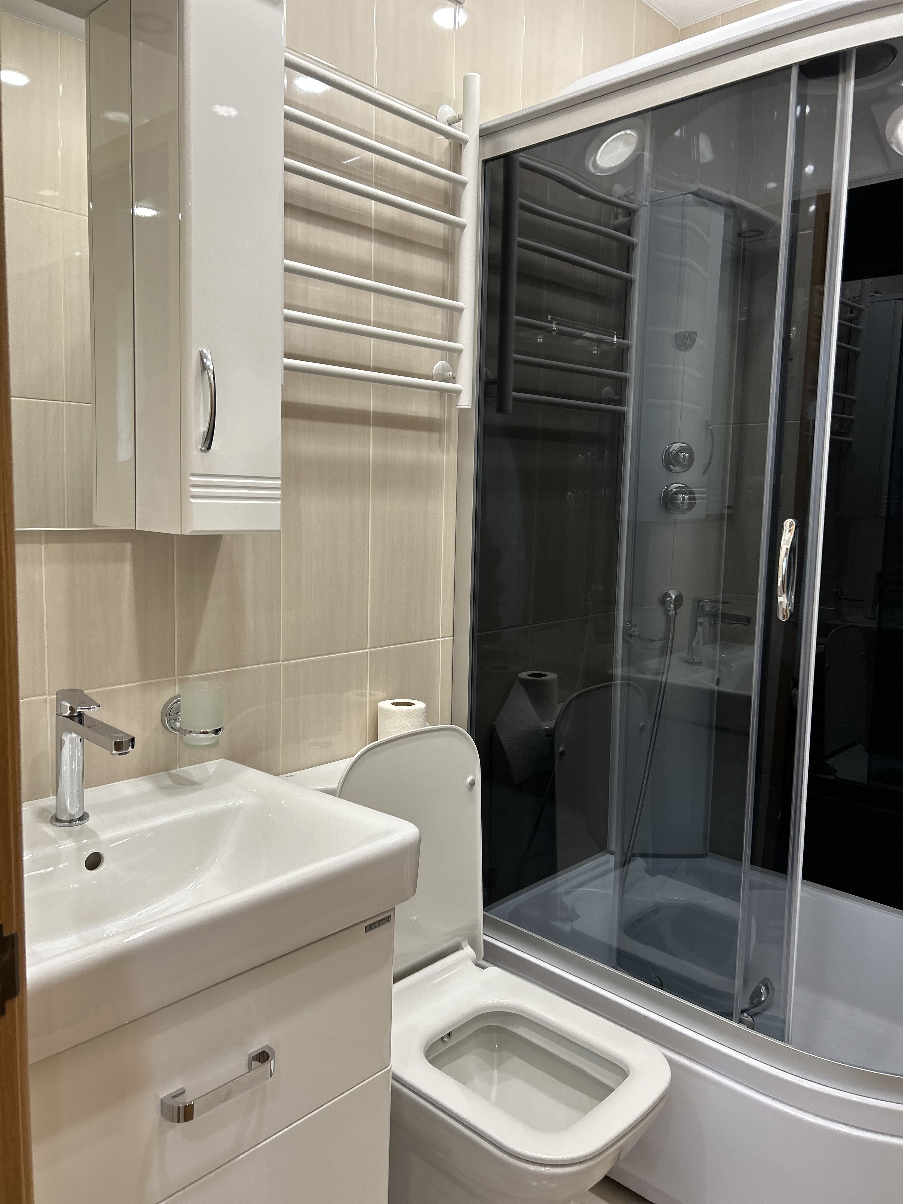 Санузел: с душевой кабиной, тапочки, туалетные принадлежности, фен, халат