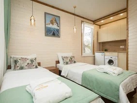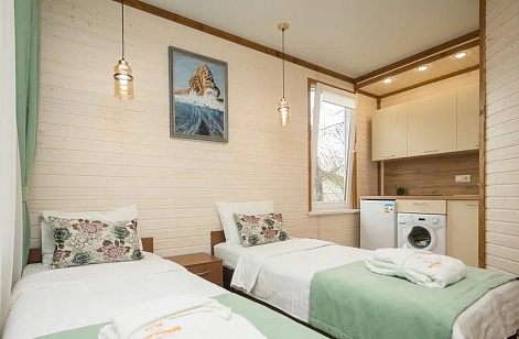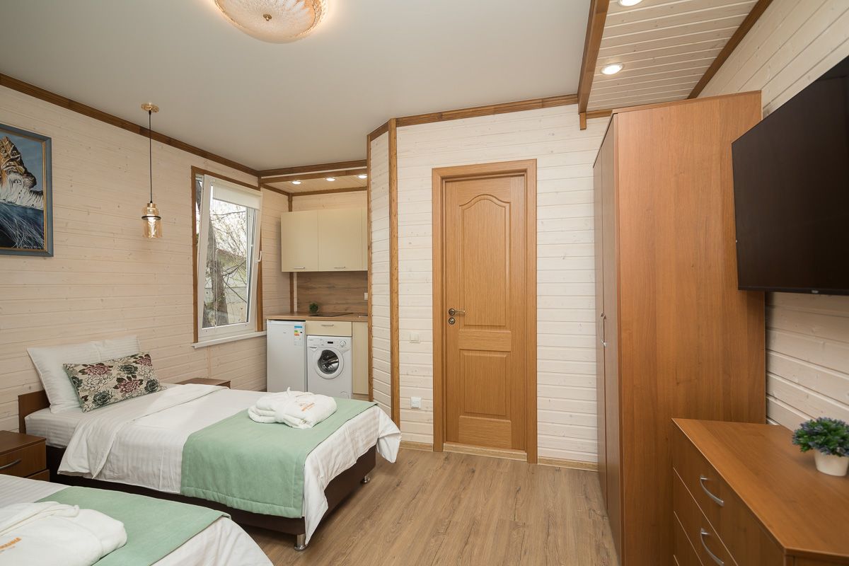 В номере: комод, кровати односпальные /одна двуспальная кровать, прикроватные тумбочки, шкаф, кондиционер, плита электрическая, стиральная машина, телевизор, холодильник, чайник, чайный набор посуды