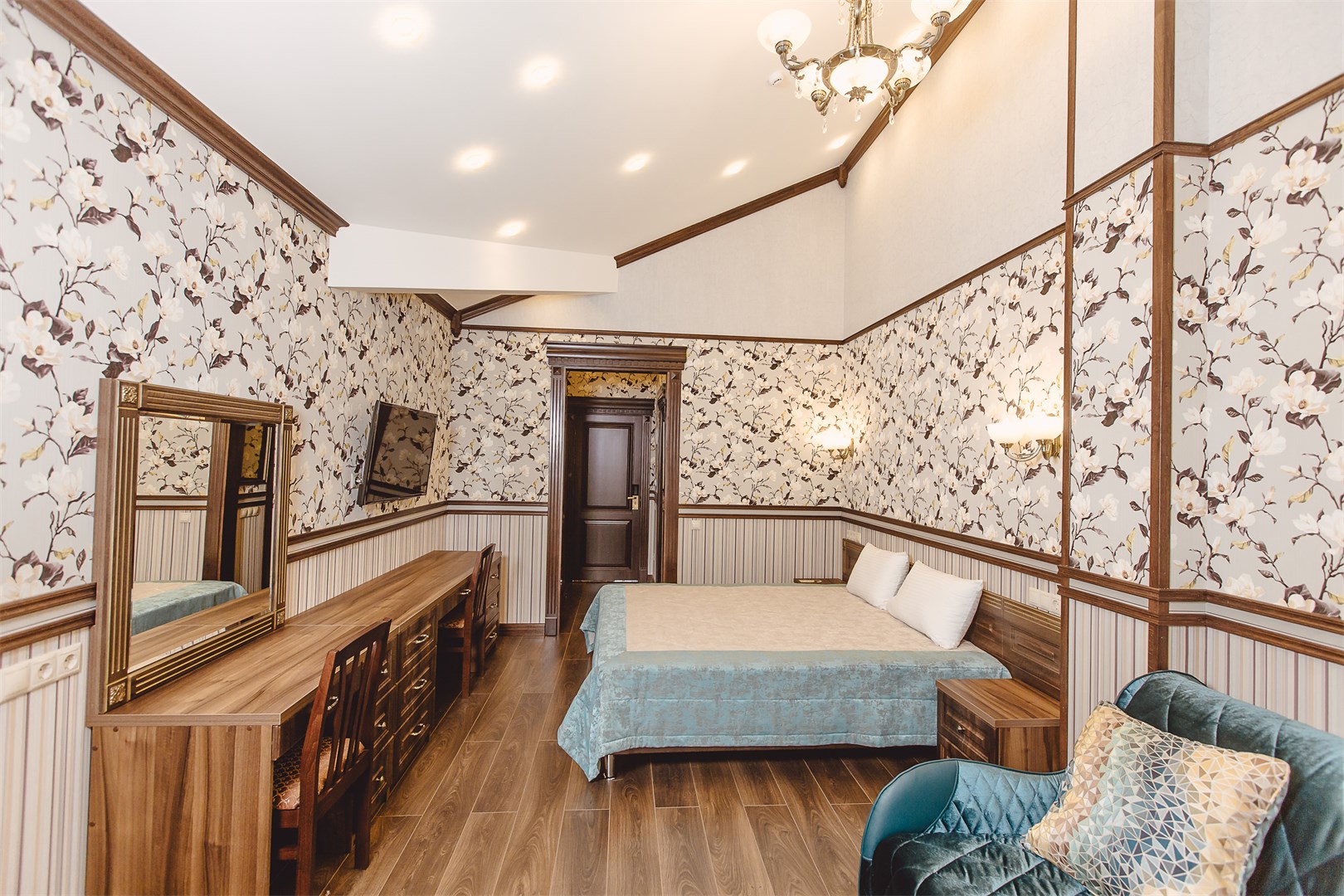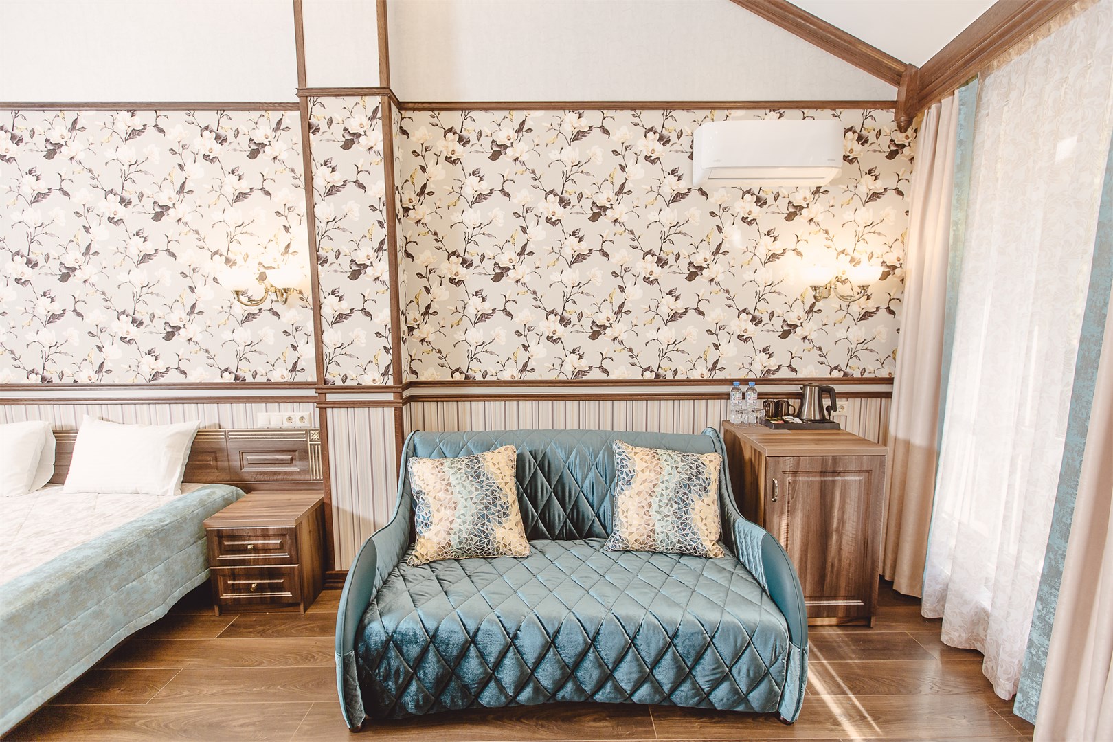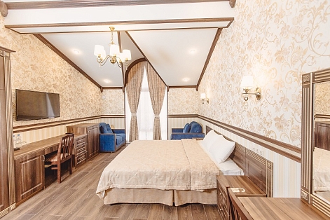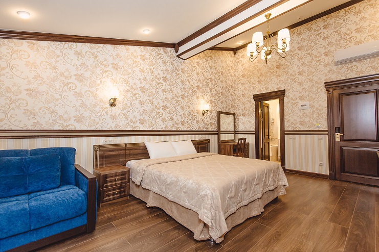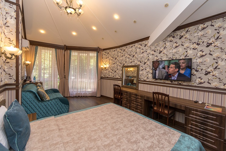 В номере: вешалка, диван, зеркало, кровать двуспальная, прикроватные тумбочки, стол, стул, шкаф, кондиционер, сейф, телевизор ЖК, холодильник, чайный набор посуды, электрочайник