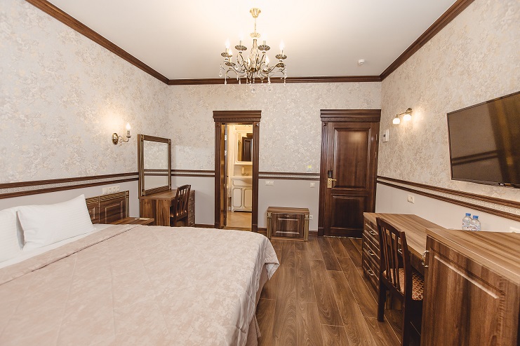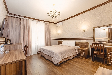 В номере: вешалка, зеркало, кровать двуспальная, прикроватные тумбочки, стол, стулья, шкаф, кондиционер, сейф, телевизор ЖК, холодильник, чайный набор посуды, электрочайник