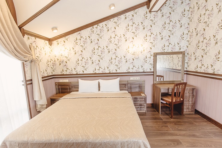В номере: вешалка, зеркало, кровать двуспальная, прикроватные тумбочки, стол, столик туалетный, стулья, шкаф, кондиционер, сейф, телевизор ЖК, холодильник, чайный набор посуды, электрочайник
