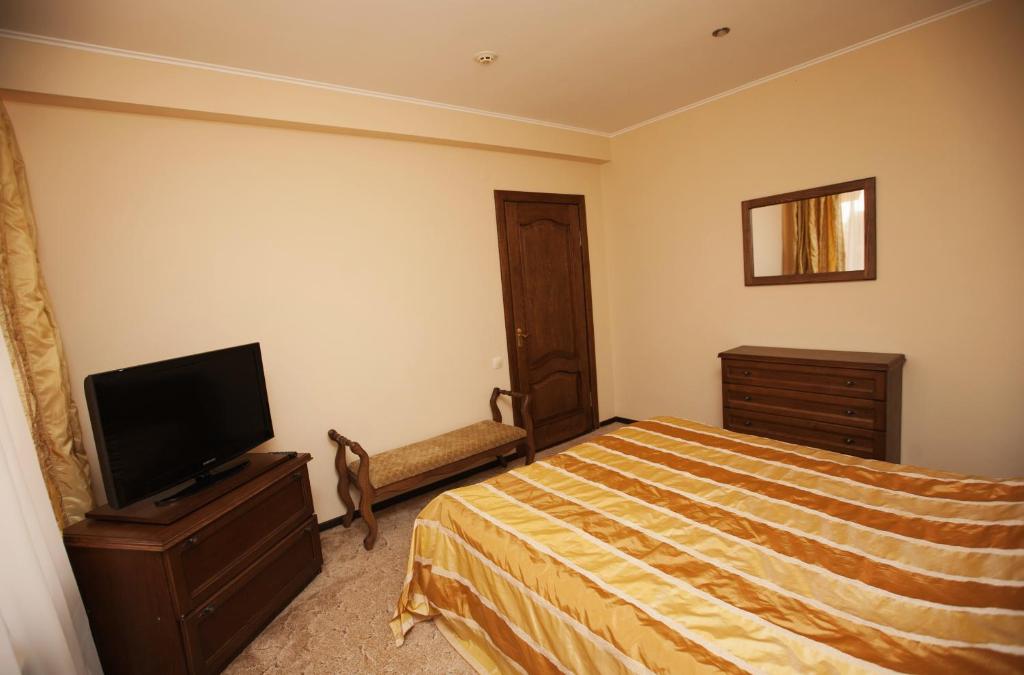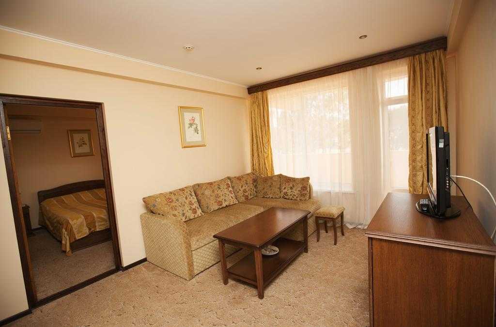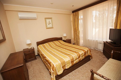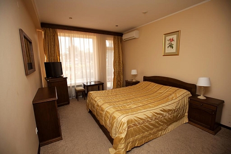 В номере: диван, кровать двуспальная, мягкий уголок, прикроватные тумбочки, шкаф, кондиционер, пляжные полотенца, сейф, телевизор ЖК, холодильник, электрочайник