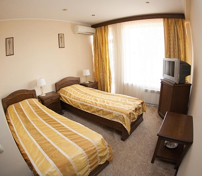 В номере: кровати полутороспальные, прикроватные тумбочки, стол, шкаф, кондиционер, пляжные полотенца, сейф, телевизор, холодильник, электрочайник
