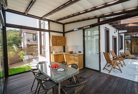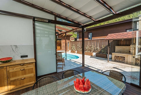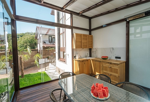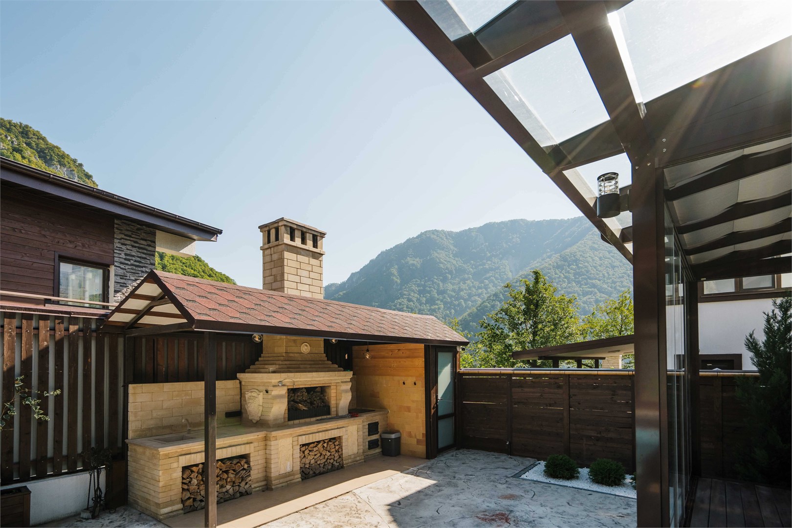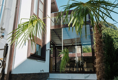 Великолепный дом в современном стиле расположен в окружении гор, всего в пятнадцати минутах езды на автомобиле до центра посёлка Красная Поляна и в двадцати минутах до аэропорта Сочи. С порога здесь открывается атмосфера комфорта и домашнего уюта. В доме пять комнат, оборудованная кухня-гостиная с полным набором бытовой техники и всем необходимым, туалет с душевой кабиной, Wi‑Fi, smart‑телевизоры и кондиционеры.