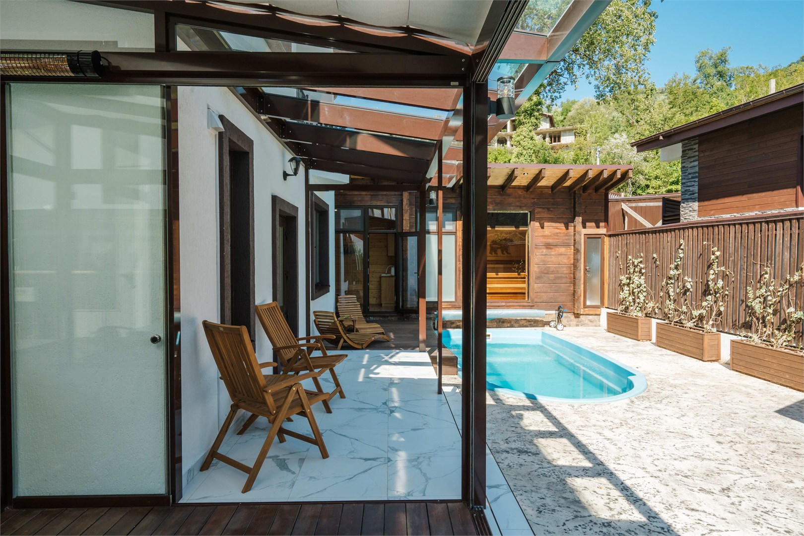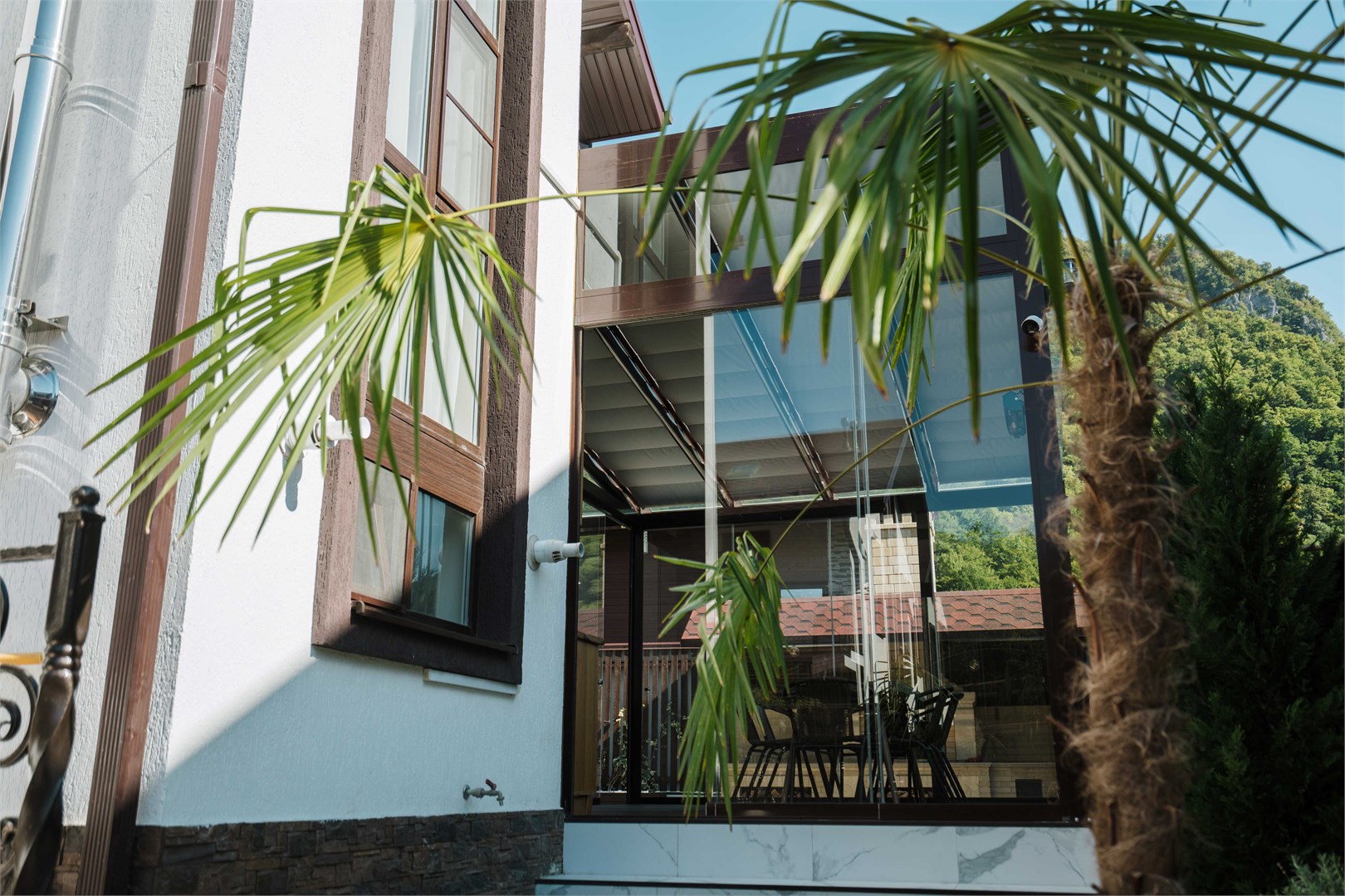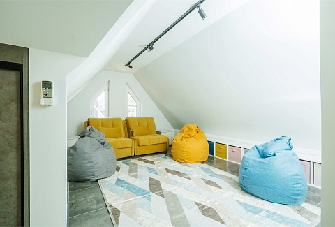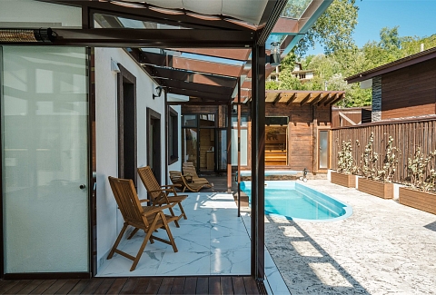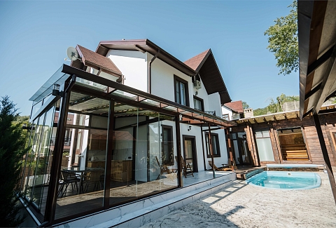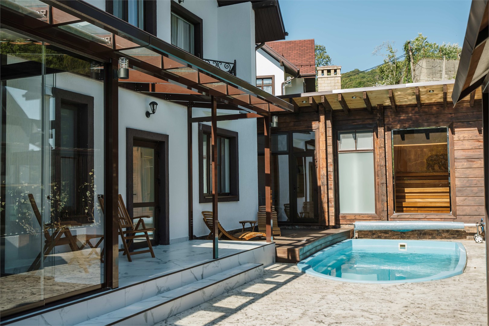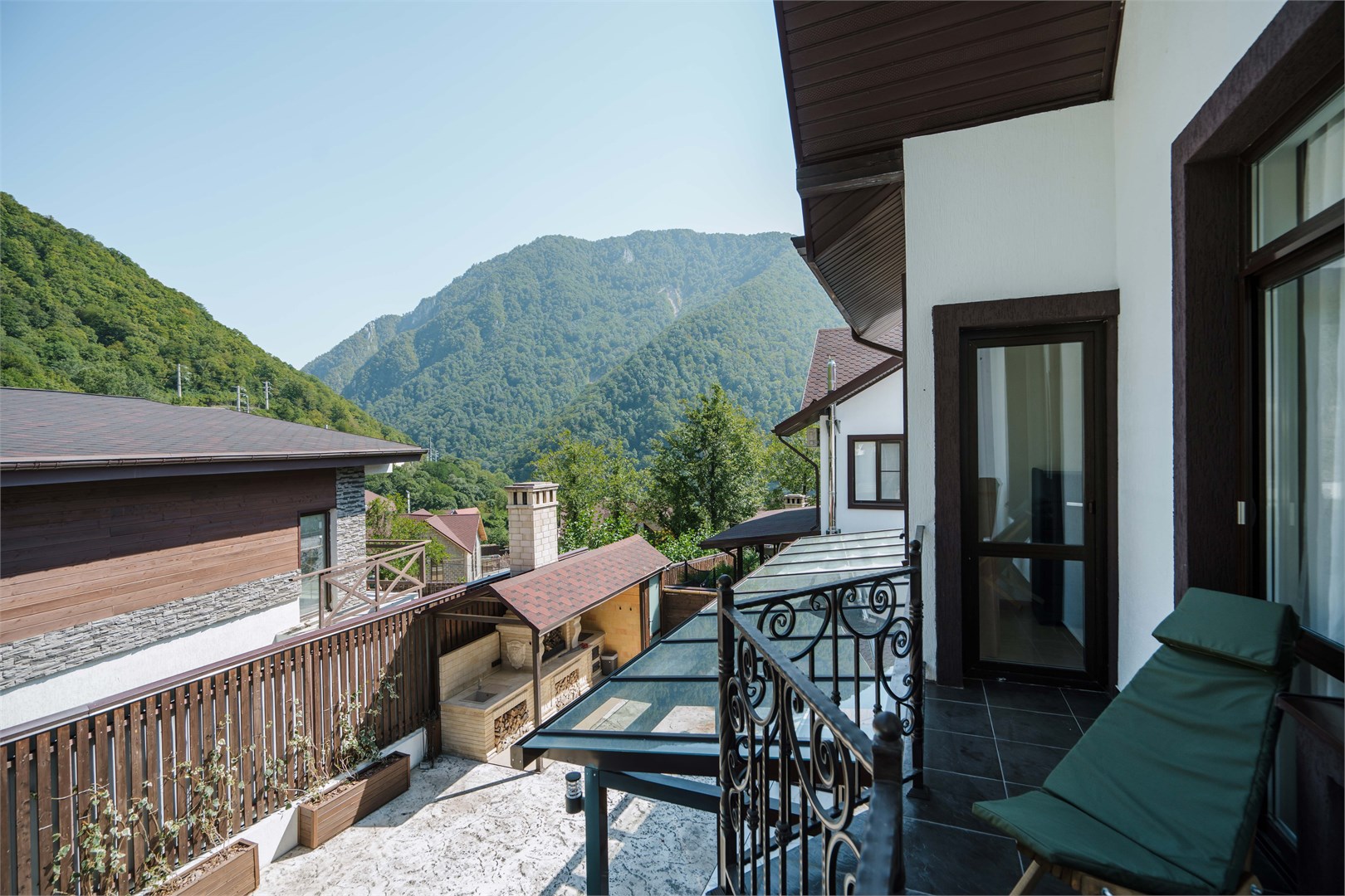 На первом этаже находятся кухня, гостиная, санузел, прихожая и вместительная гардеробная. В гостиной стоит мягкий удобный диван и smart‑телевизор. Кухня оснащена холодильником, кофеваркой, чайником, большим набором посуды и столовыми приборами, а выход отсюда ведёт во двор к мангальной зоне и крытой беседке. В санузле — душевая зона, туалет, полотенцесушитель, раковина с зеркалом. В прихожей установлена стиральная машина, есть гардероб для одежды и пространство для багажа. Здесь же расположена первая спальня. На втором этаже — три спальни и санузел. Во второй спальне стоит двуспальная кровать 180×200 и smart‑телевизор, есть выход на балкон с видом на горы. Третья спальня с кроватью 160×200 и smart‑телевизором также имеет балкон с горным пейзажем. Четвёртая спальня детская — с двумя односпальными кроватями и письменным столом. Третий, мансардный этаж зонирован на две части: в одной за массивным шкафом установлена кровать, а другая представляет собой игровую зону с двумя раздвигающимися креслами, пуфиками, настольными играми и телевизором. Двор дома озеленён, выполнен фасадная и придомовая подсветка. Предусмотрена парковка и видеонаблюдение по всему периметру. Обустроена мангальная зона с раковиной и рабочей поверхностью, крытая беседка с видом на горы и инфракрасными лампами для поддержания тепла зимой, а также садовая мебель. Круглогодично работает подогреваемый бассейн с зоной отдыха и лежаками. Панорамная баня открывает потрясающий вид на ущелье. В доме есть закрытая терраса.