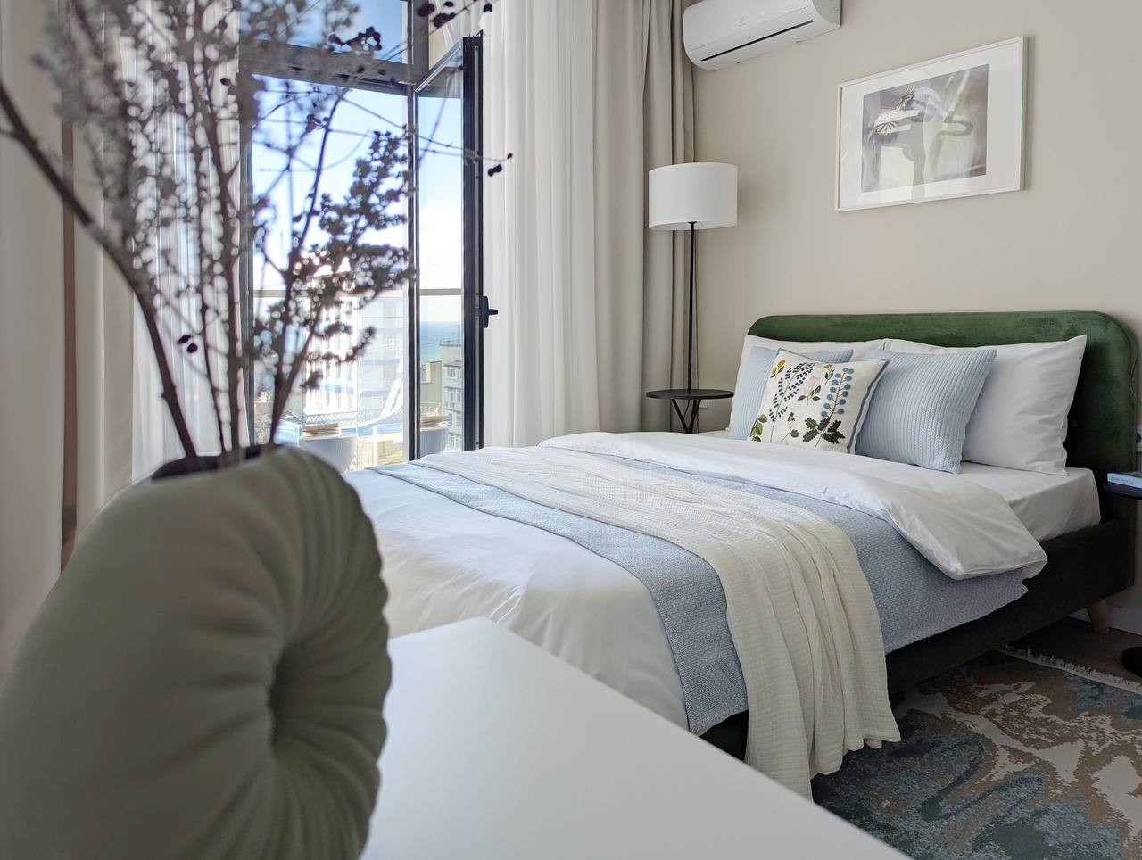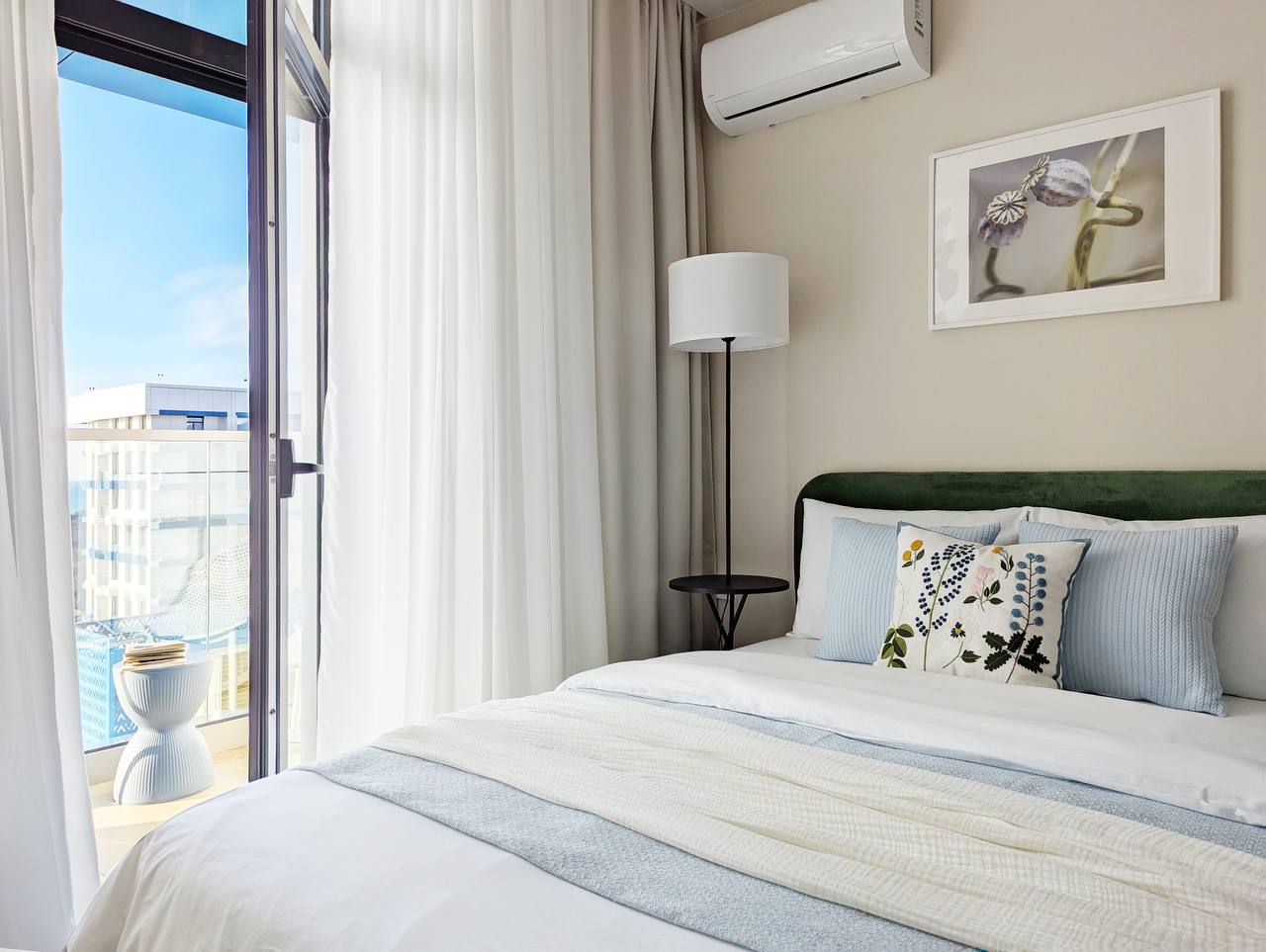 В номере: вешалка, зеркало, кровать двуспальная, прикроватные столики, пуфик, стол, столик журнальный, стулья, шкаф, кондиционер, микроволновая печь, набор посуды, плита электрическая, стиральная машина, телевизор, холодильник, электрочайник