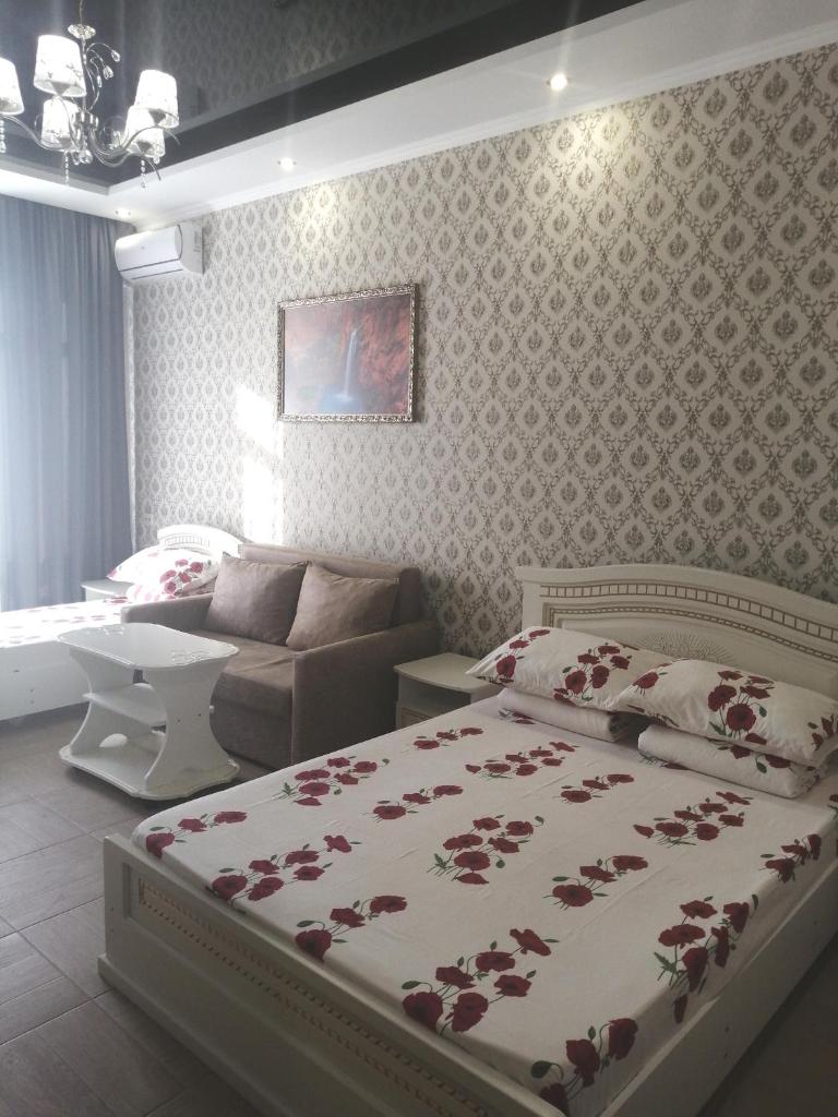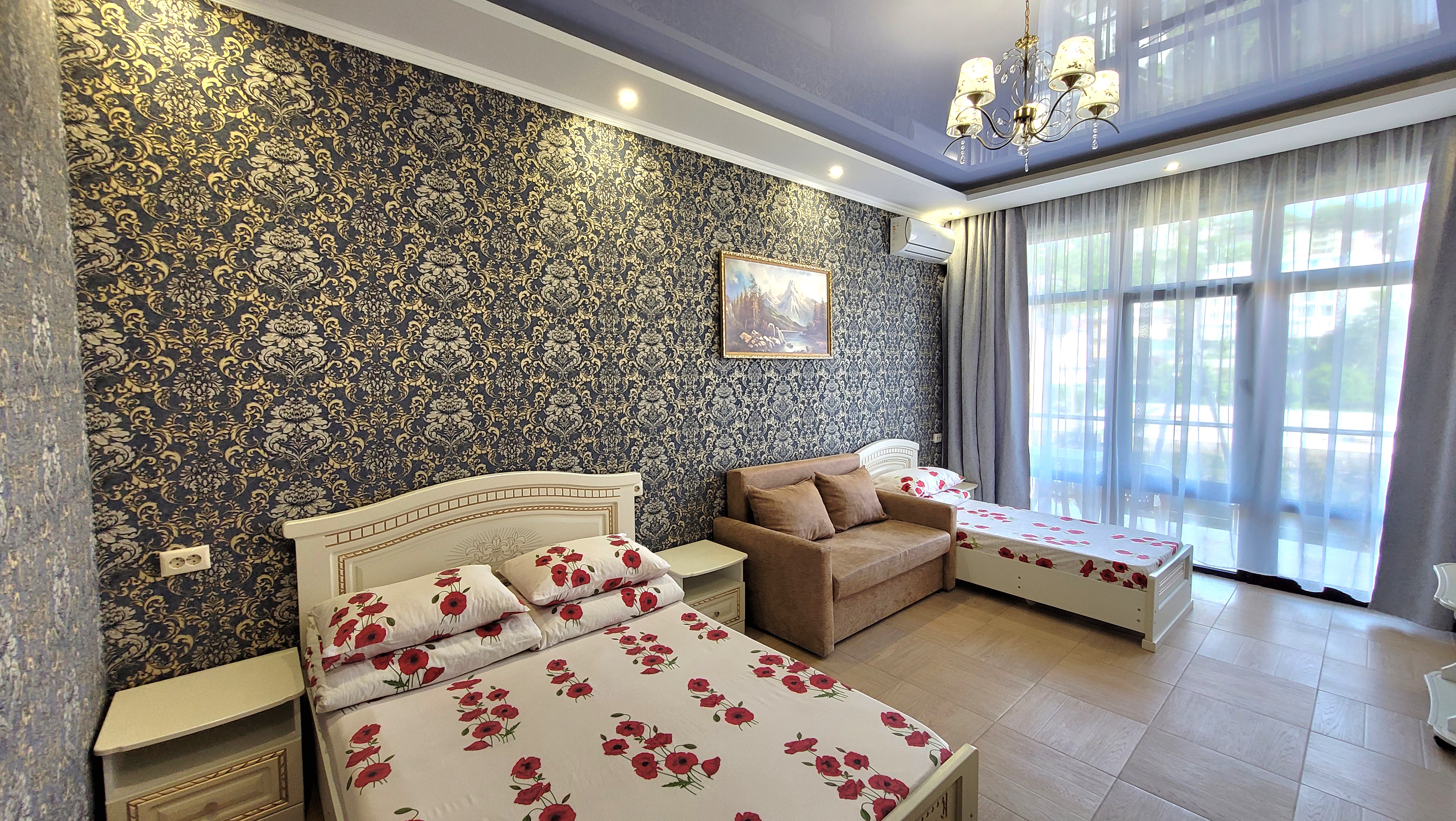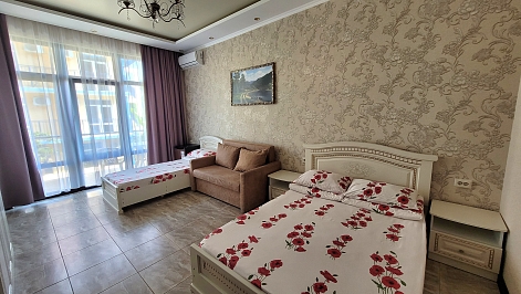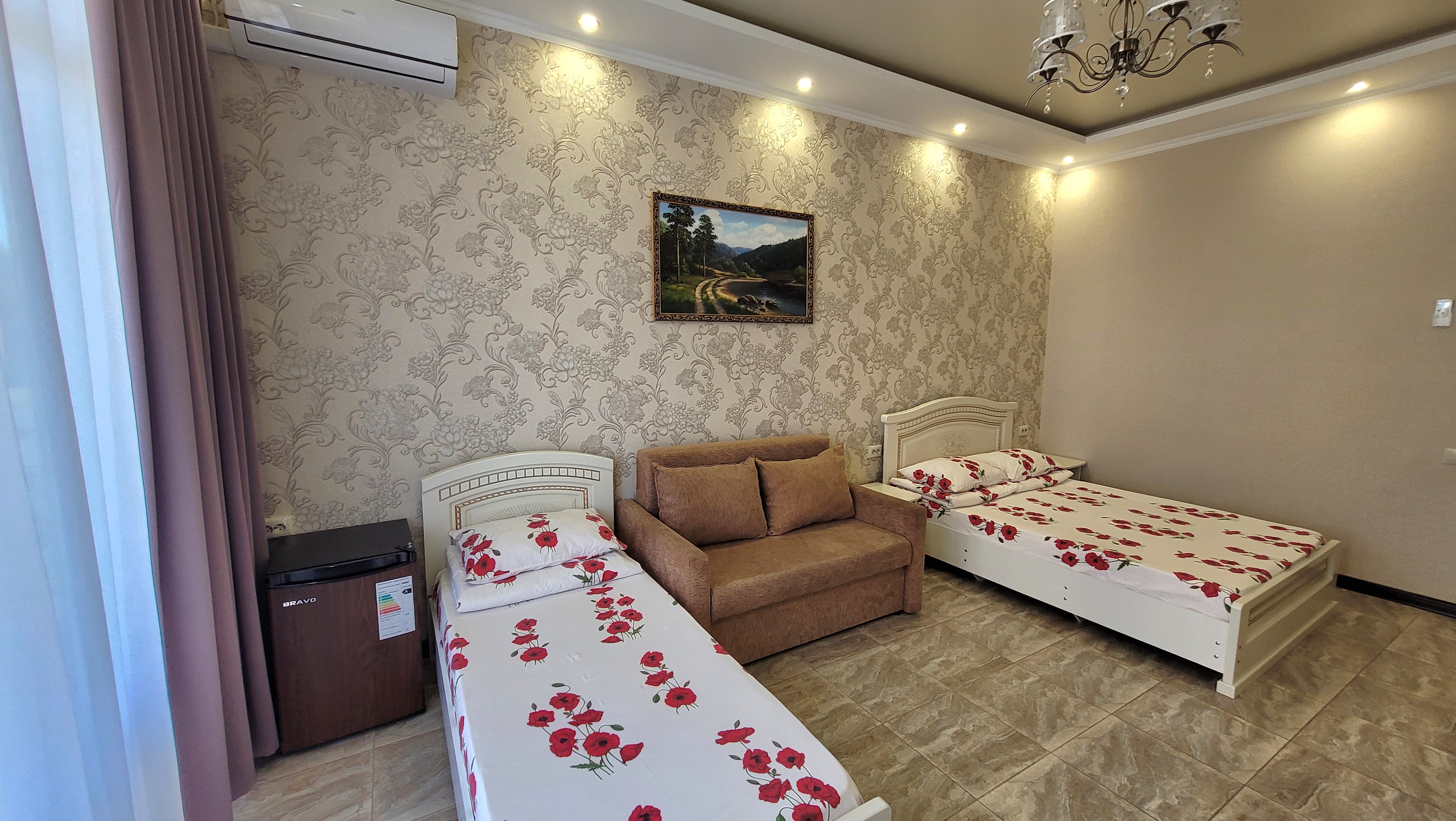 В номере: вешалка, диван, зеркало, кровати односпальные, кровать двуспальная, прикроватные тумбочки, стол, тумба, шкаф, мини-холодильник, сплит-система, телевизор ЖК