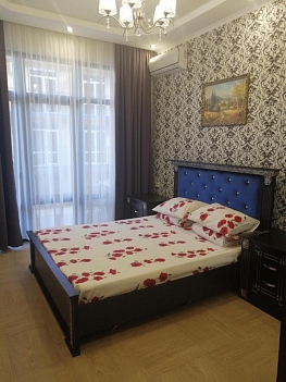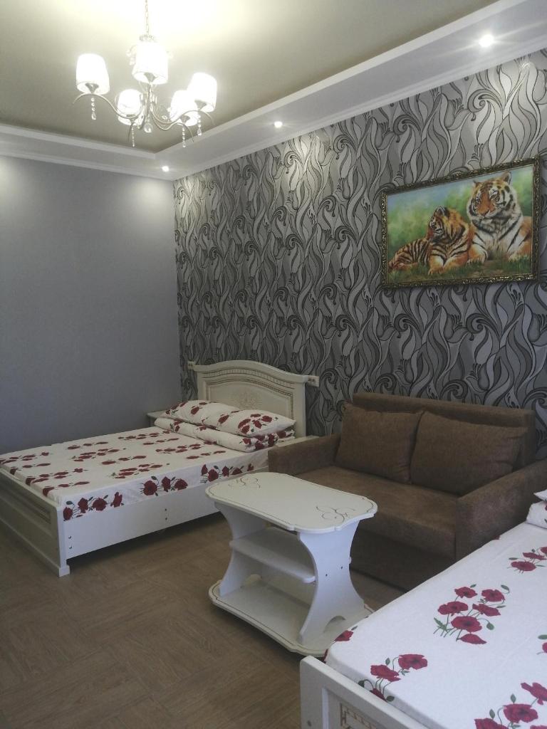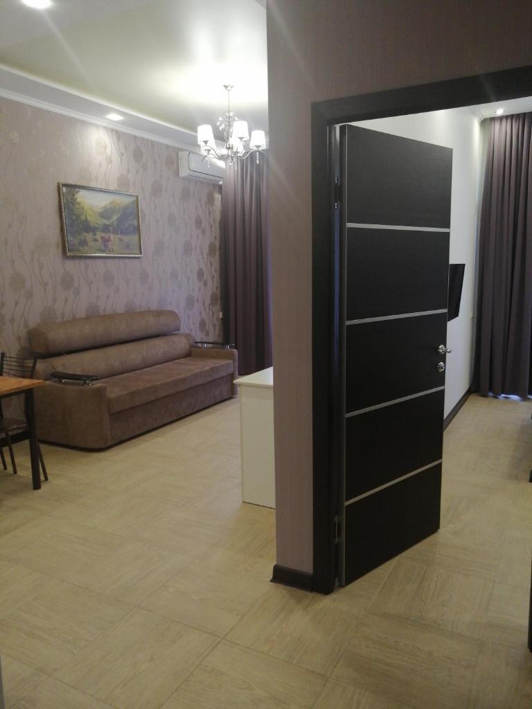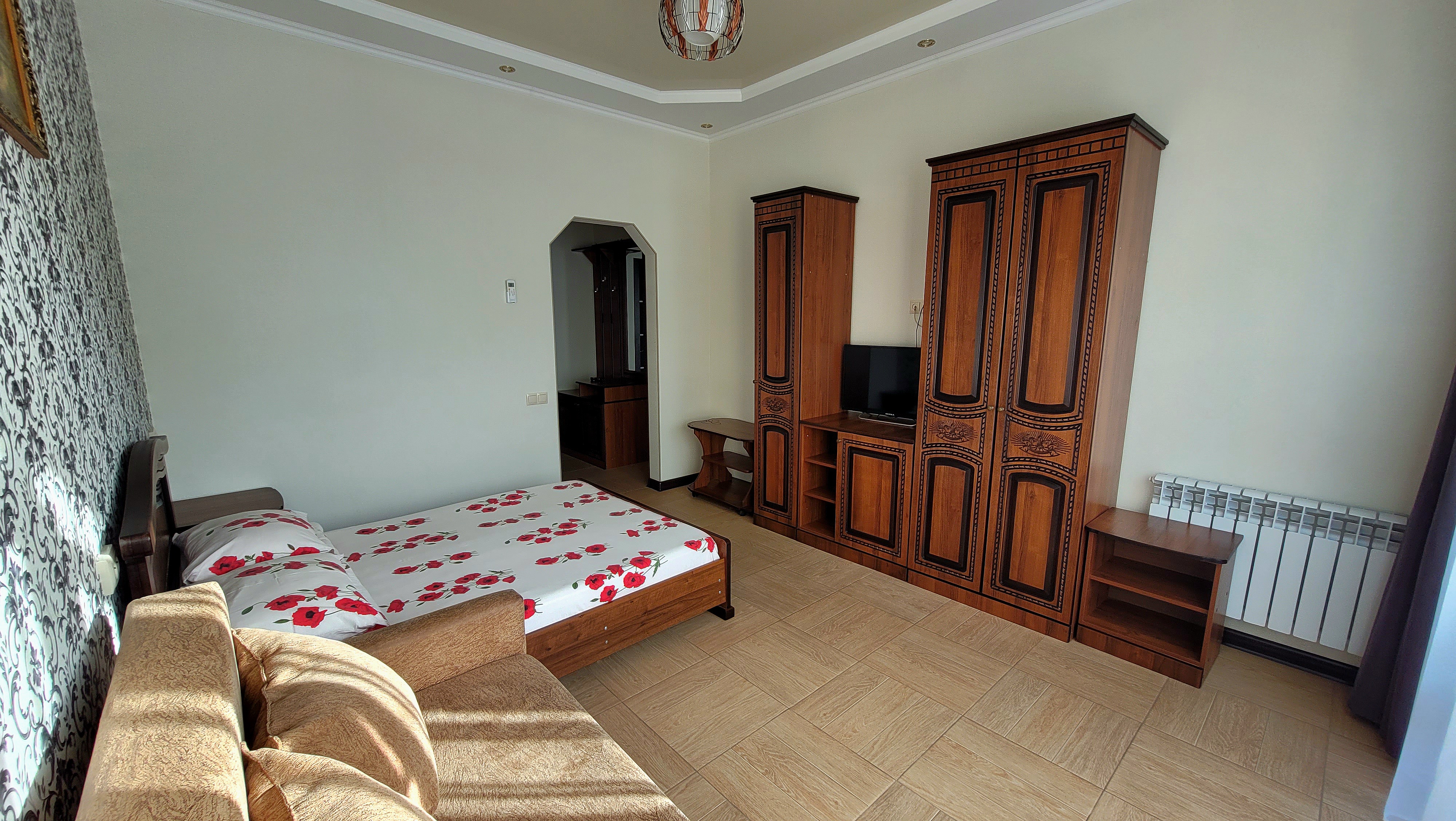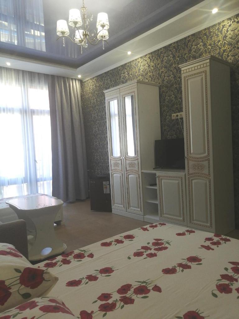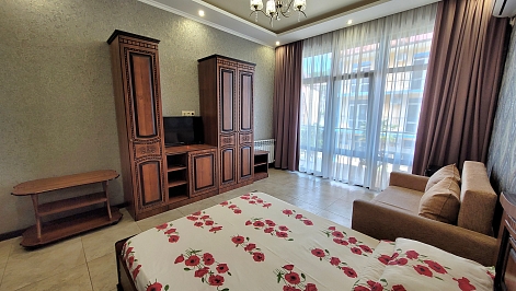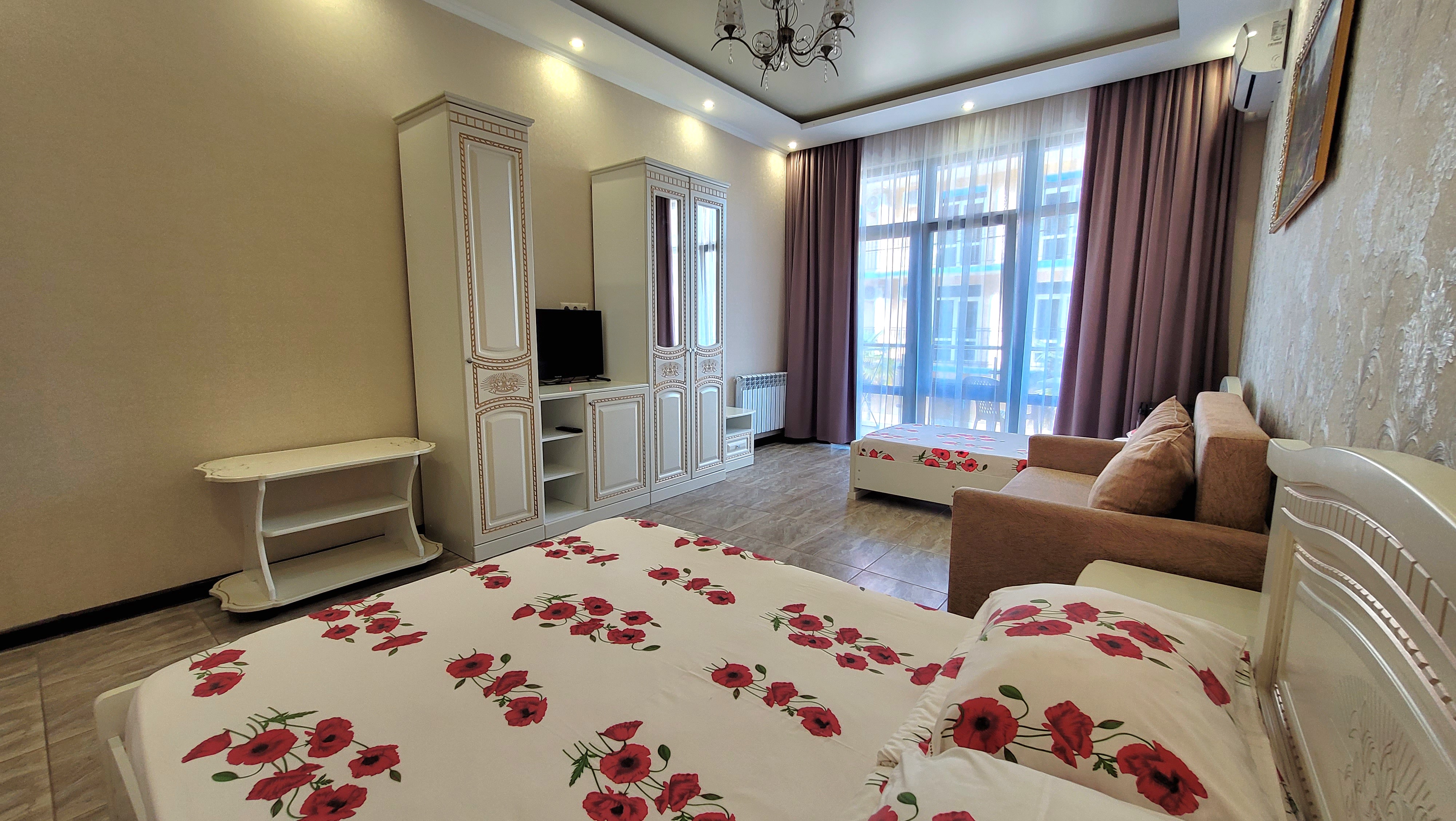 В номере: вешалка, диван, зеркало, кресло-кровать, стол, стулья, тумба, шкаф, микроволновая печь, мини-холодильник, набор посуды, плита электрическая, сплит-система, телевизор ЖК, электрочайник