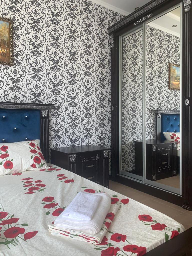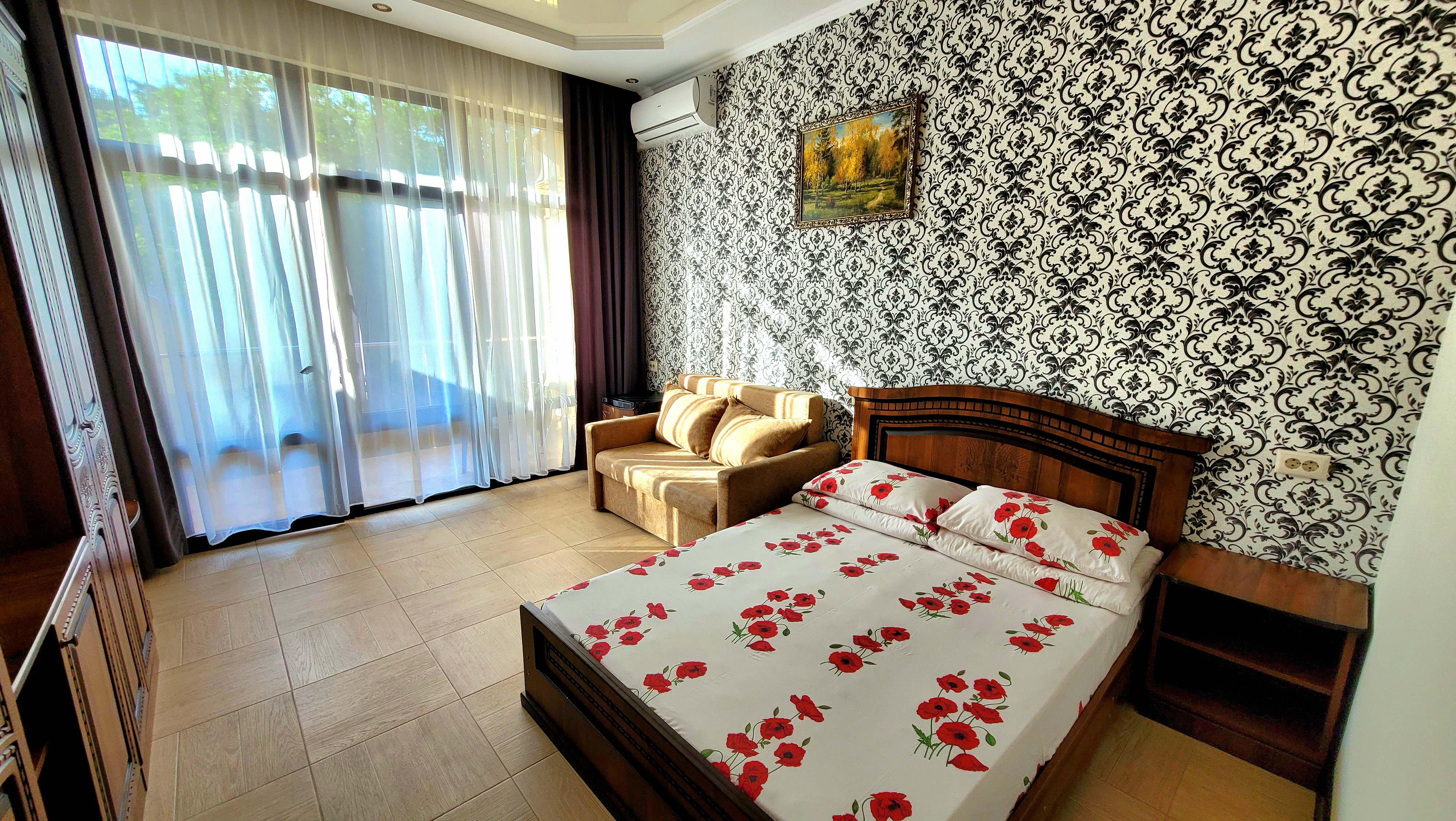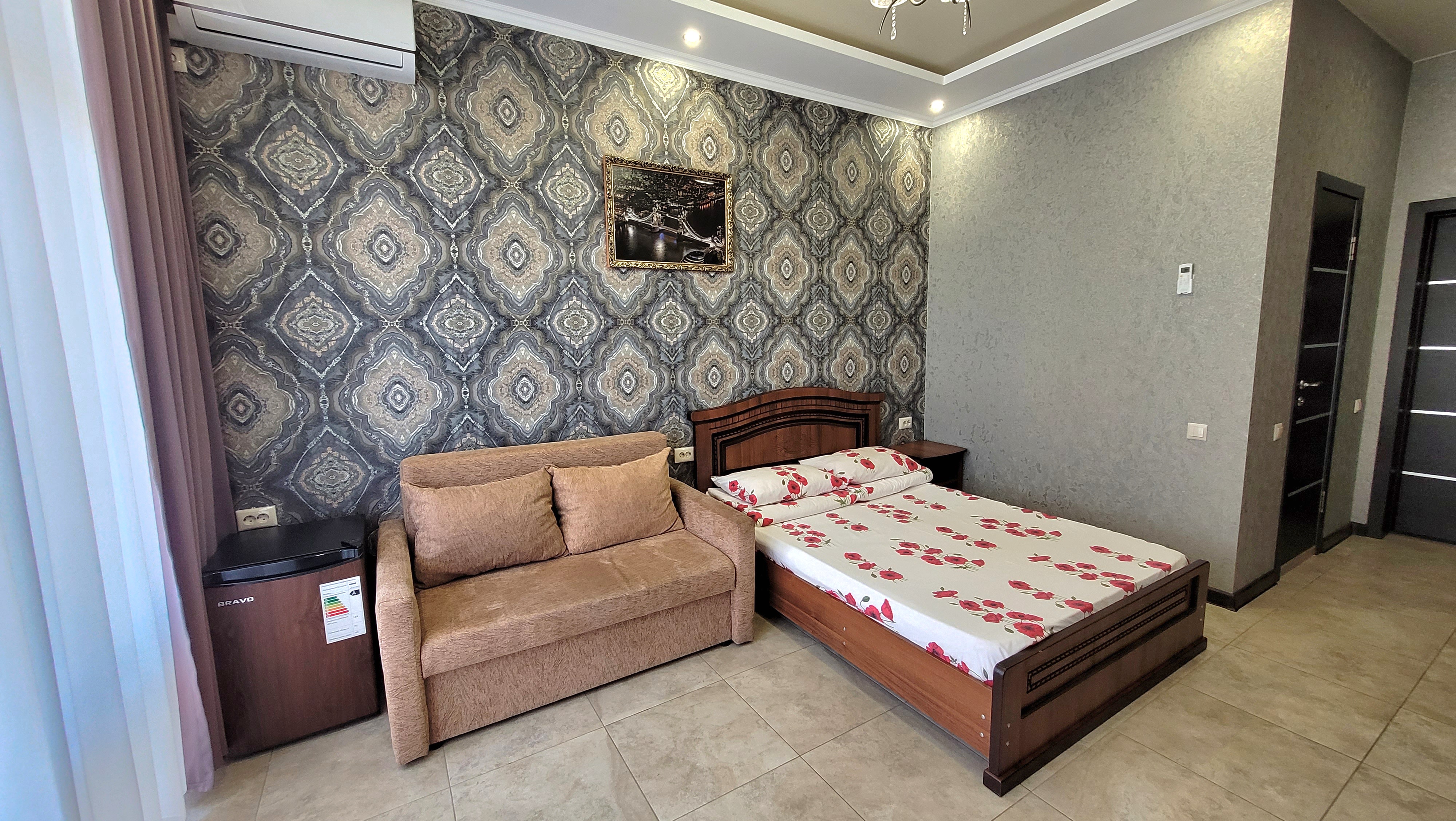 В номере: вешалка, диван, зеркало, кровать двуспальная, прикроватные тумбочки, стол, тумба, шкаф, мини-холодильник, сплит-система, телевизор ЖК