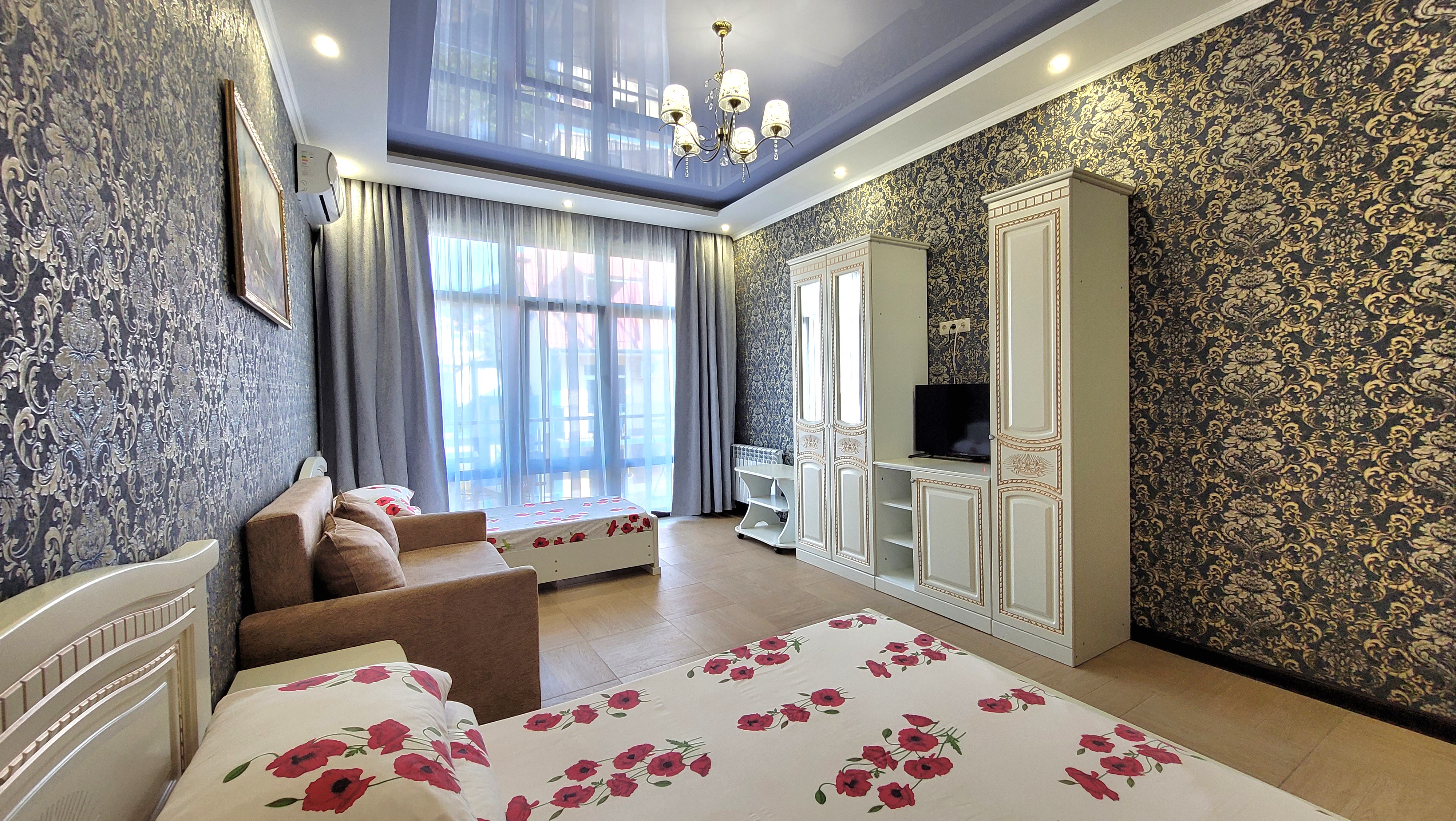В номере: вешалка, диван, зеркало, кровать двуспальная, кровать односпальная, прикроватные тумбочки, стол, тумба, шкаф, мини-холодильник, сплит-система, телевизор ЖК