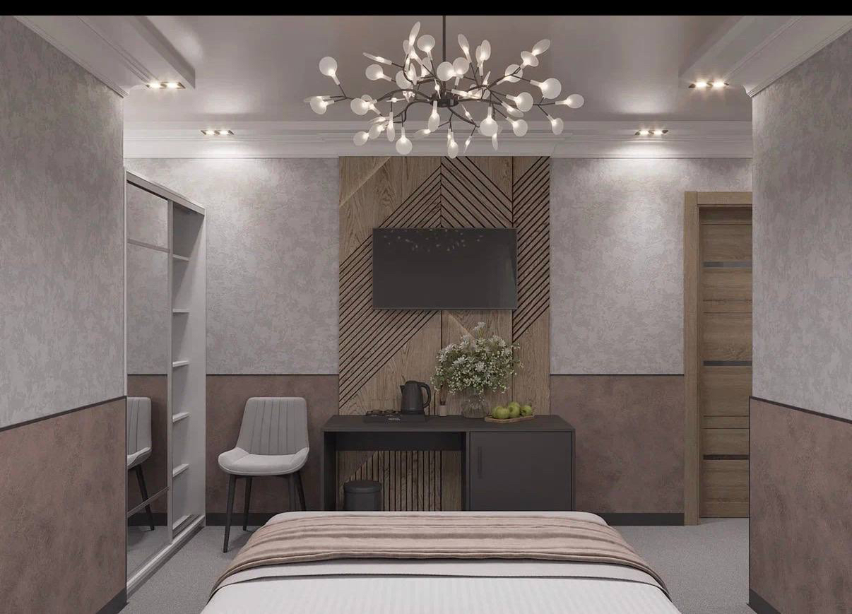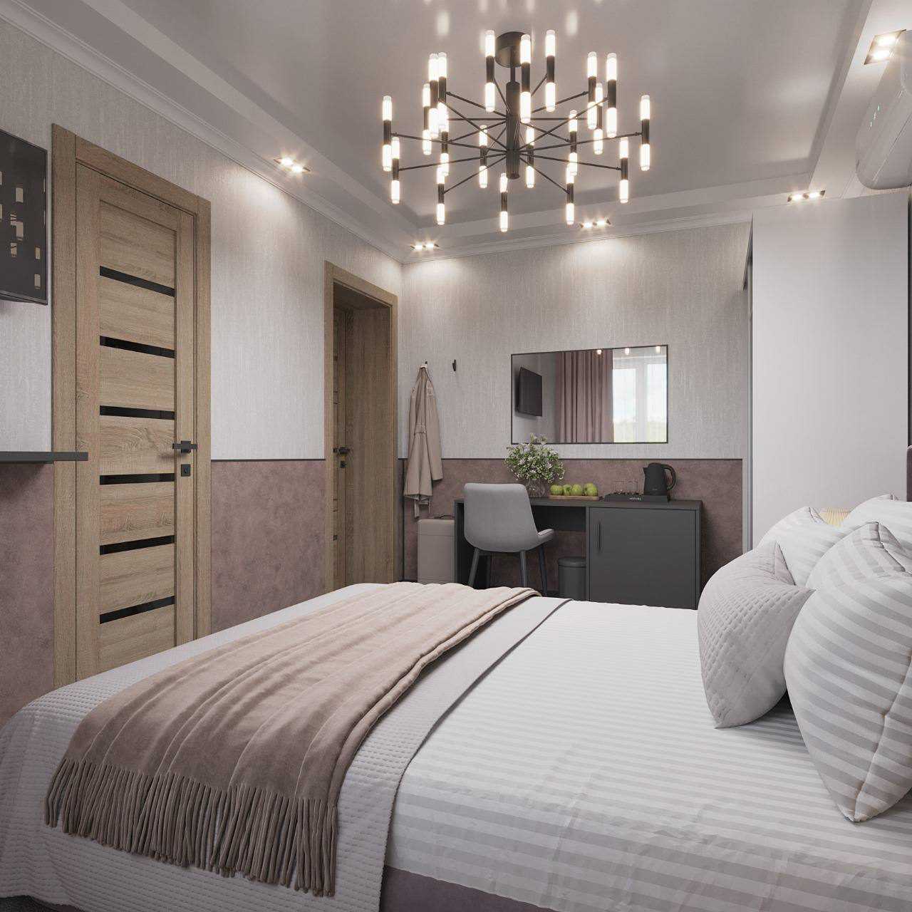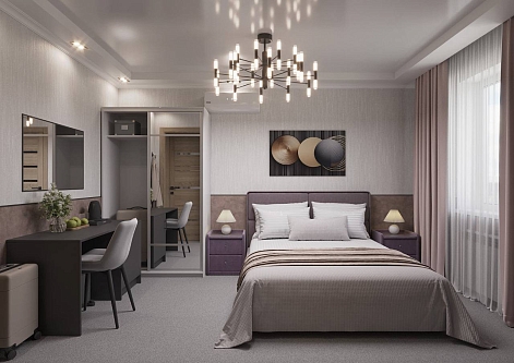 В номере: вешалка, кровать двуспальная, столик журнальный, шкаф, кондиционер, телевизор, чайник