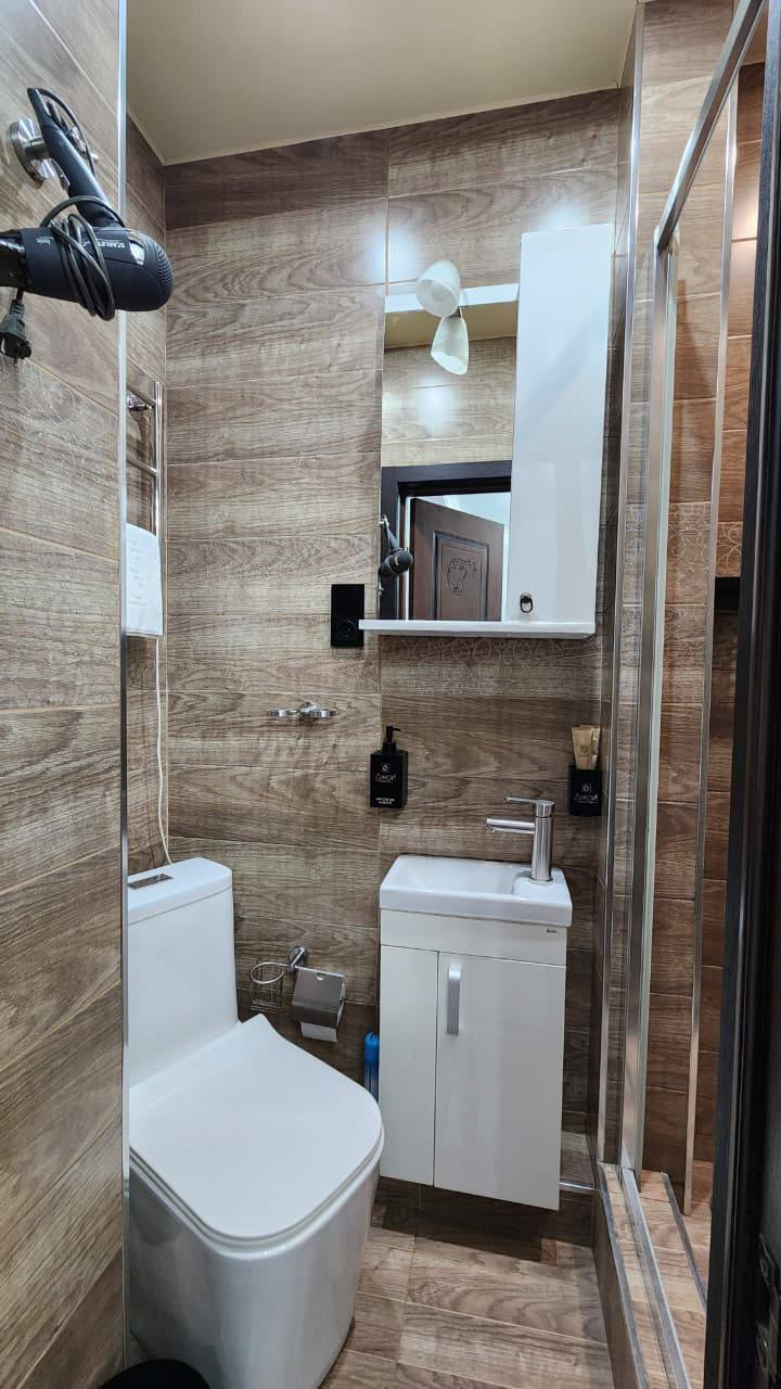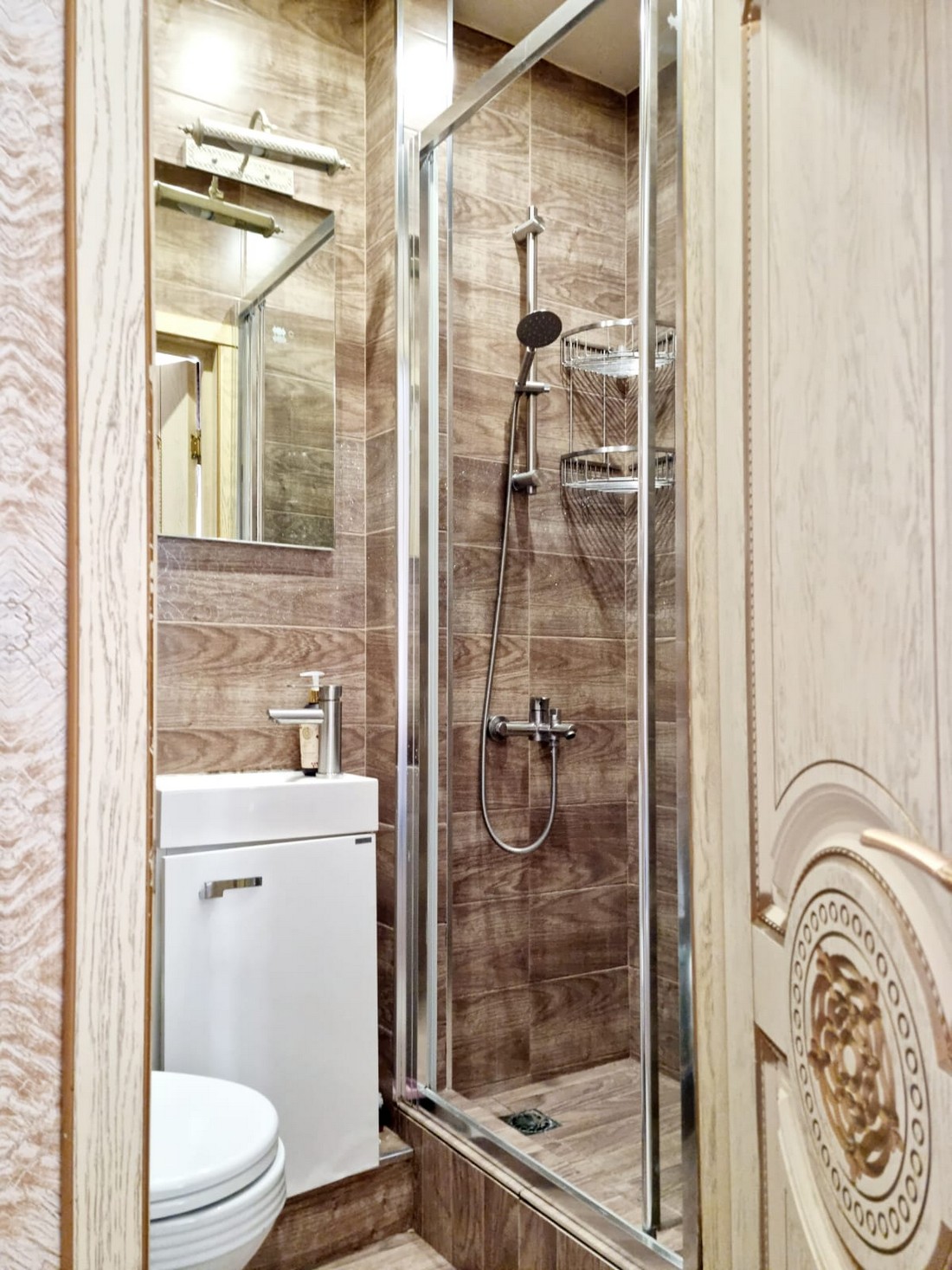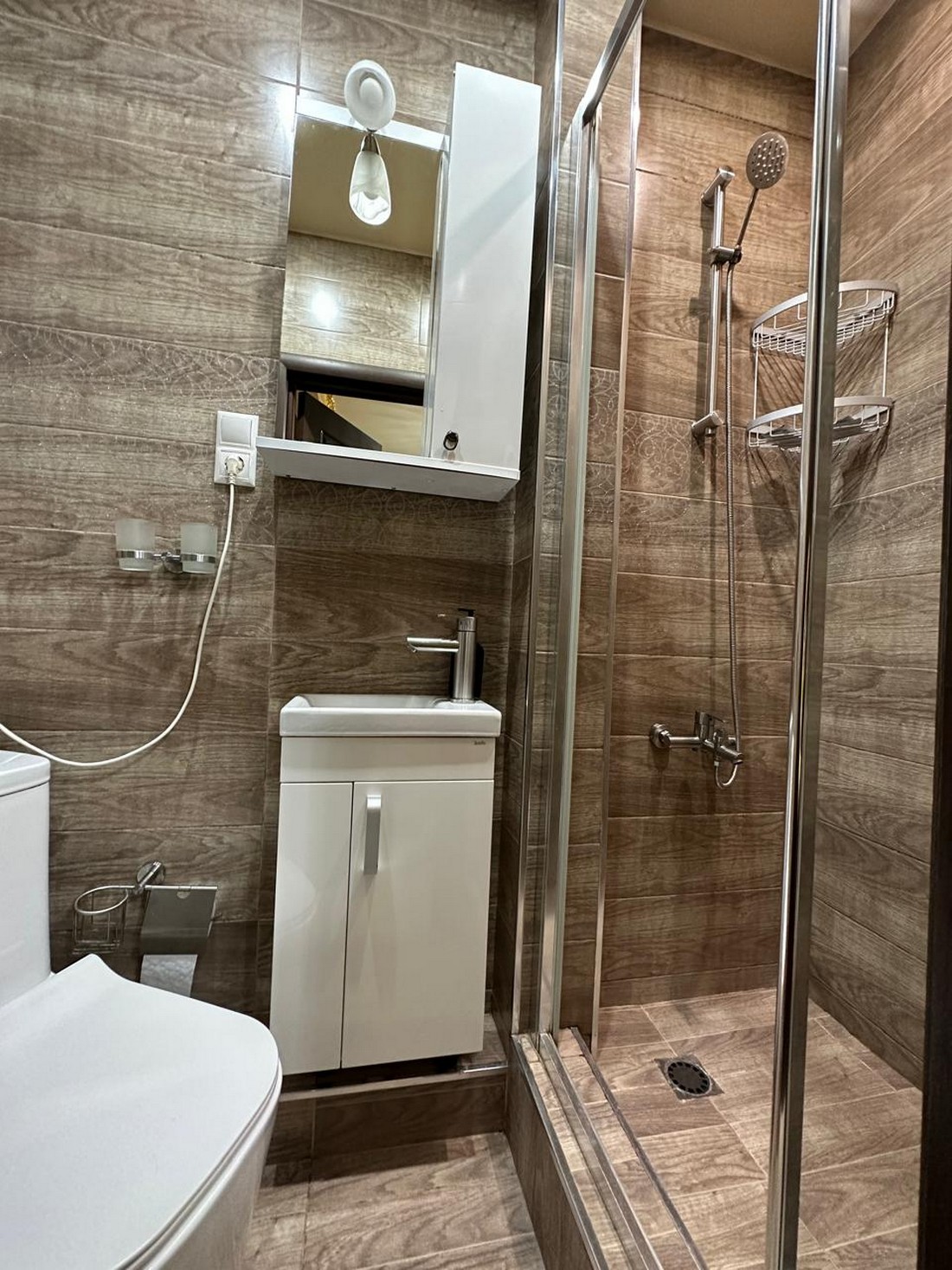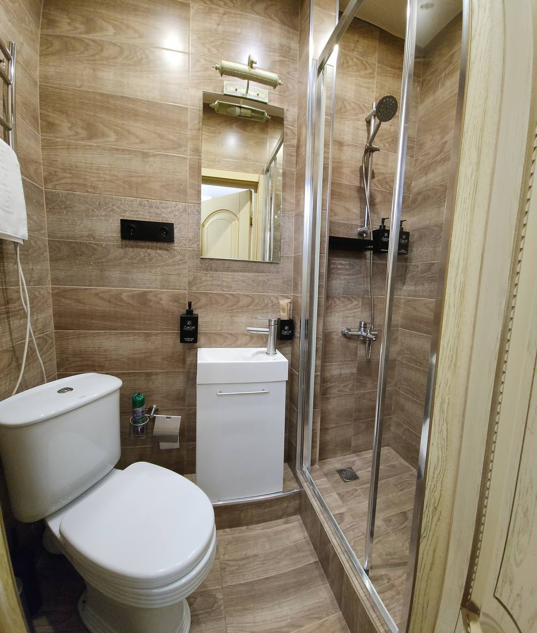 Санузел: с душем, тапочки, туалетные принадлежности, фен, халат