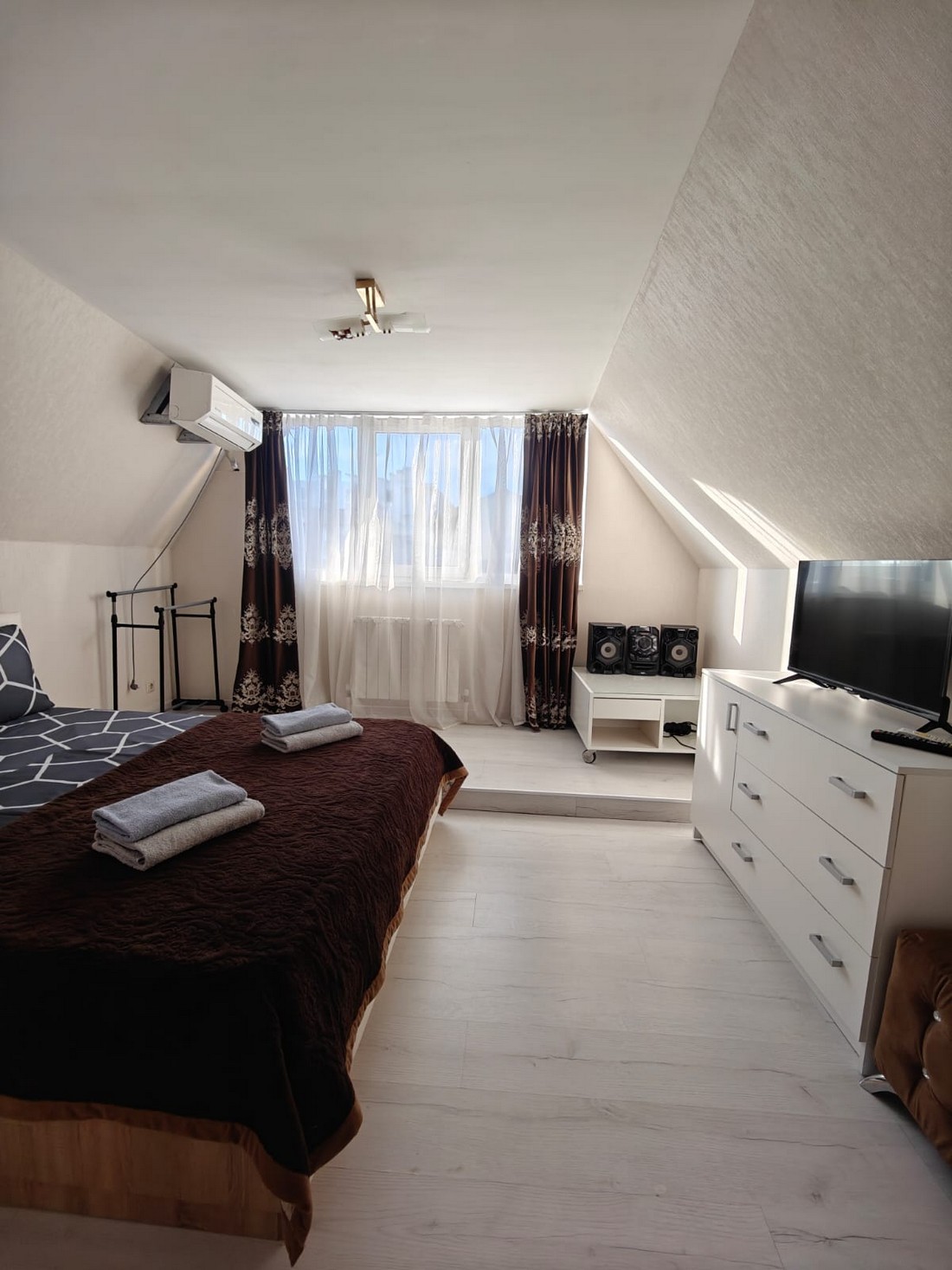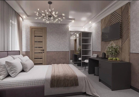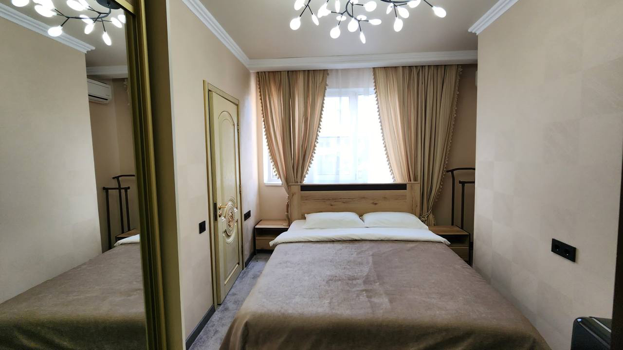 В номере: диван раскладной, кровать двуспальная, стол, стулья, гладильная доска, кондиционер, микроволновая печь, набор посуды, плита электрическая, стиральная машина, сушилка для белья, телевизор, утюг, холодильник, чайник