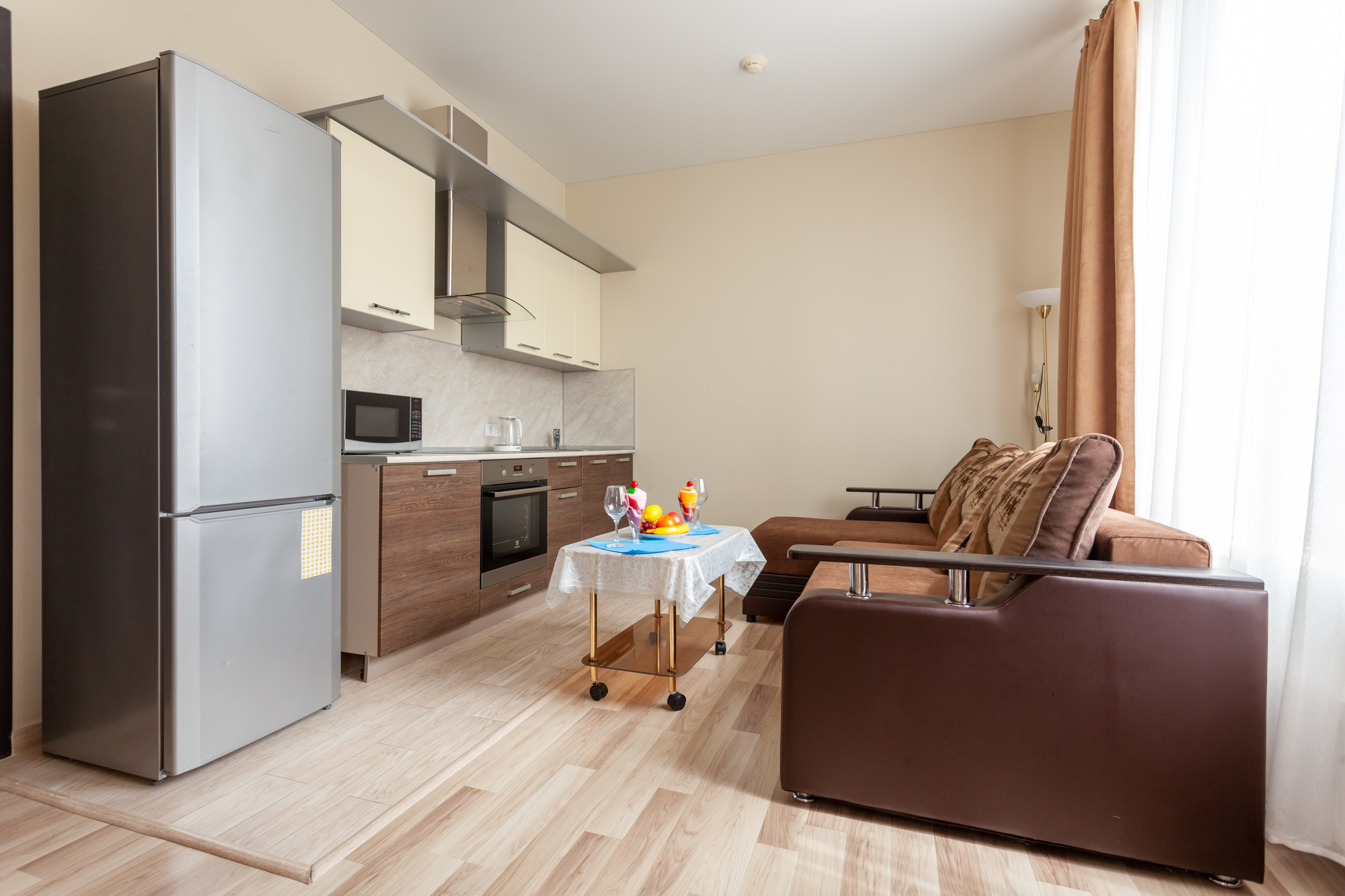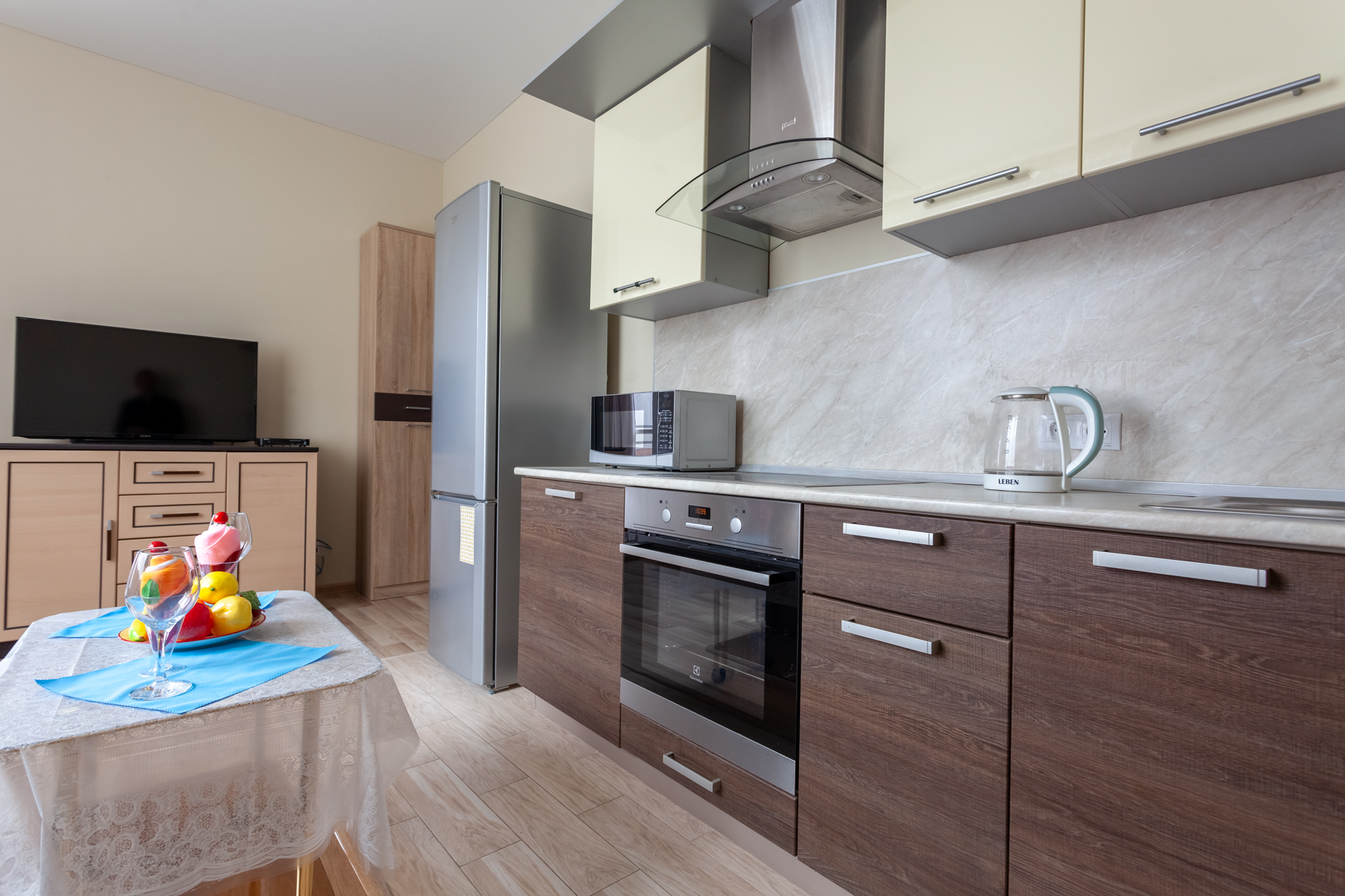 В номере: вешалка, диван раскладной, зеркало, комод, кровать двуспальная, прикроватные тумбочки, стол, столик кофейный, стулья, шкаф, гладильная доска, духовой шкаф, кондиционер, микроволновая печь, набор посуды, плита электрическая, стиральная машина, телевизор, утюг, холодильник, электрочайник